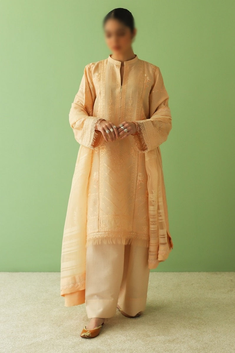 Embroidered Self Jacquard Sleeve 0.7 Yard Embroidered Patti 1.6 Yard Burnout Organza Dupatta 2.6 Yard