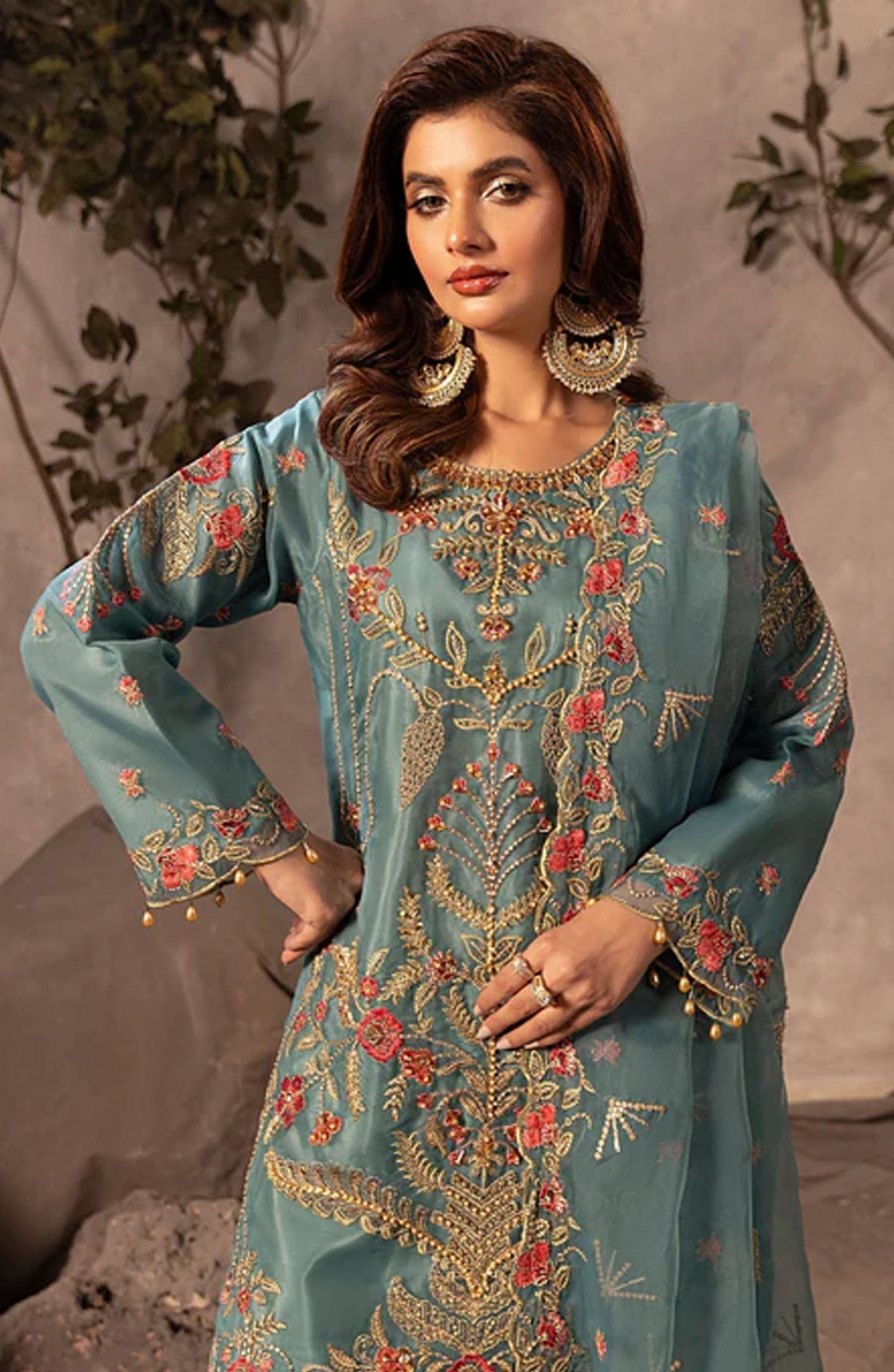 Abrish By Diara Couture Embroidered Organza Stitched 3 Piece Suit - UA-05 Rafia - DC25AB - Aqua - Formal Collection