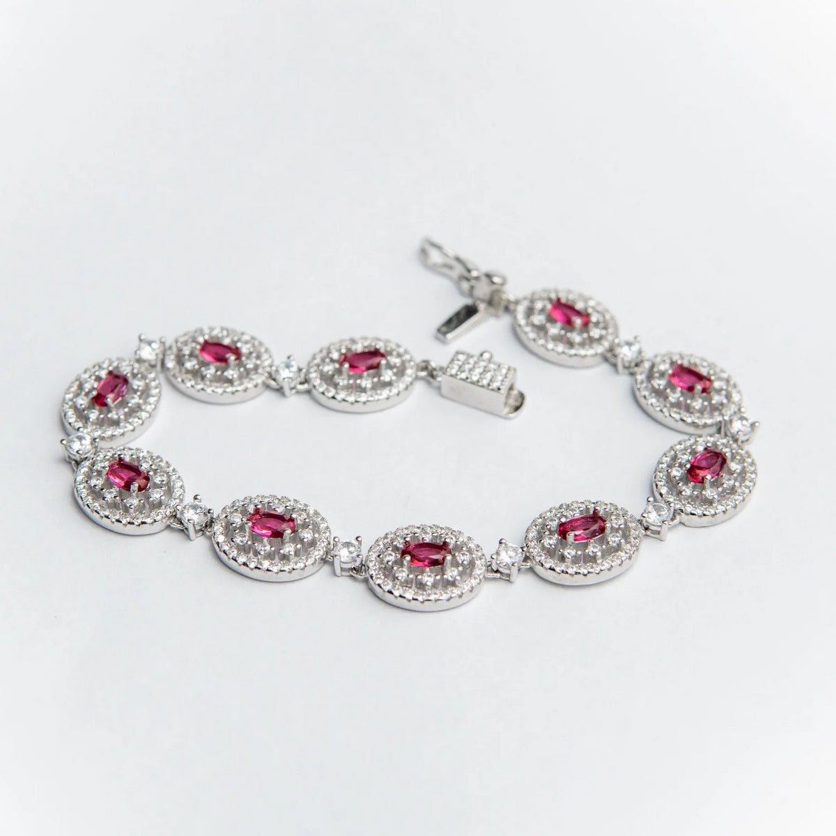 Striking Ruby Gemstones: Adorning the bracelet are captivating oval-cut ruby gemstones. Known for their deep red hues, these gemstones symbolize passion, love, and strength.