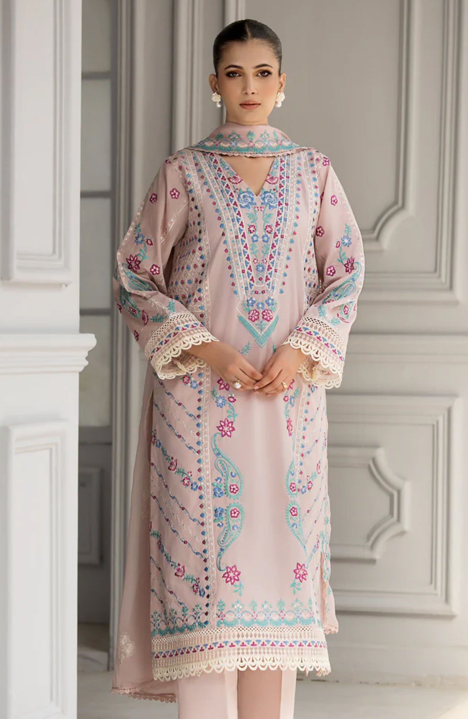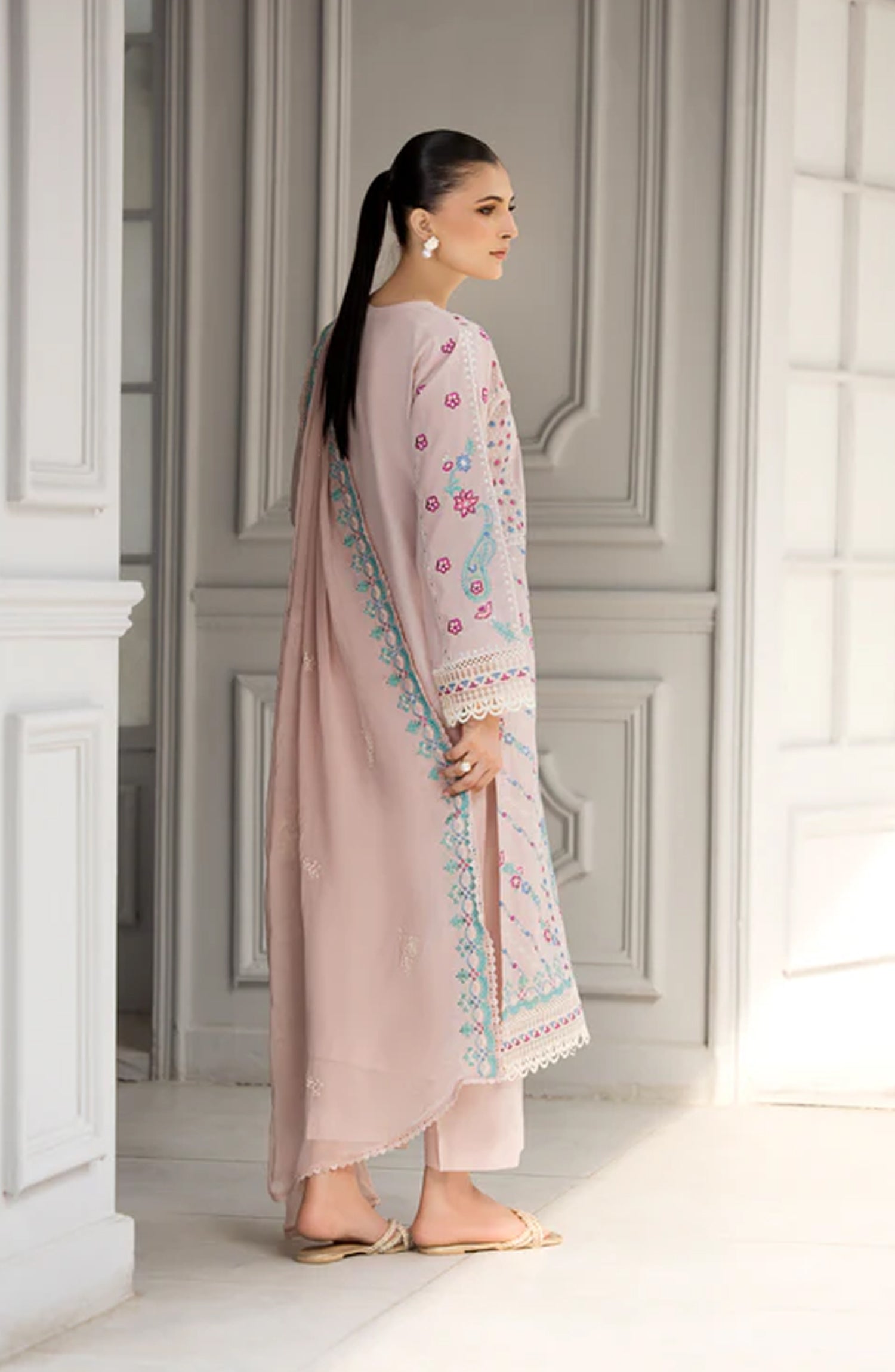 🧣 Dupatta: Delicately embroidered chiffon dupatta that completes the look with sheer elegance.