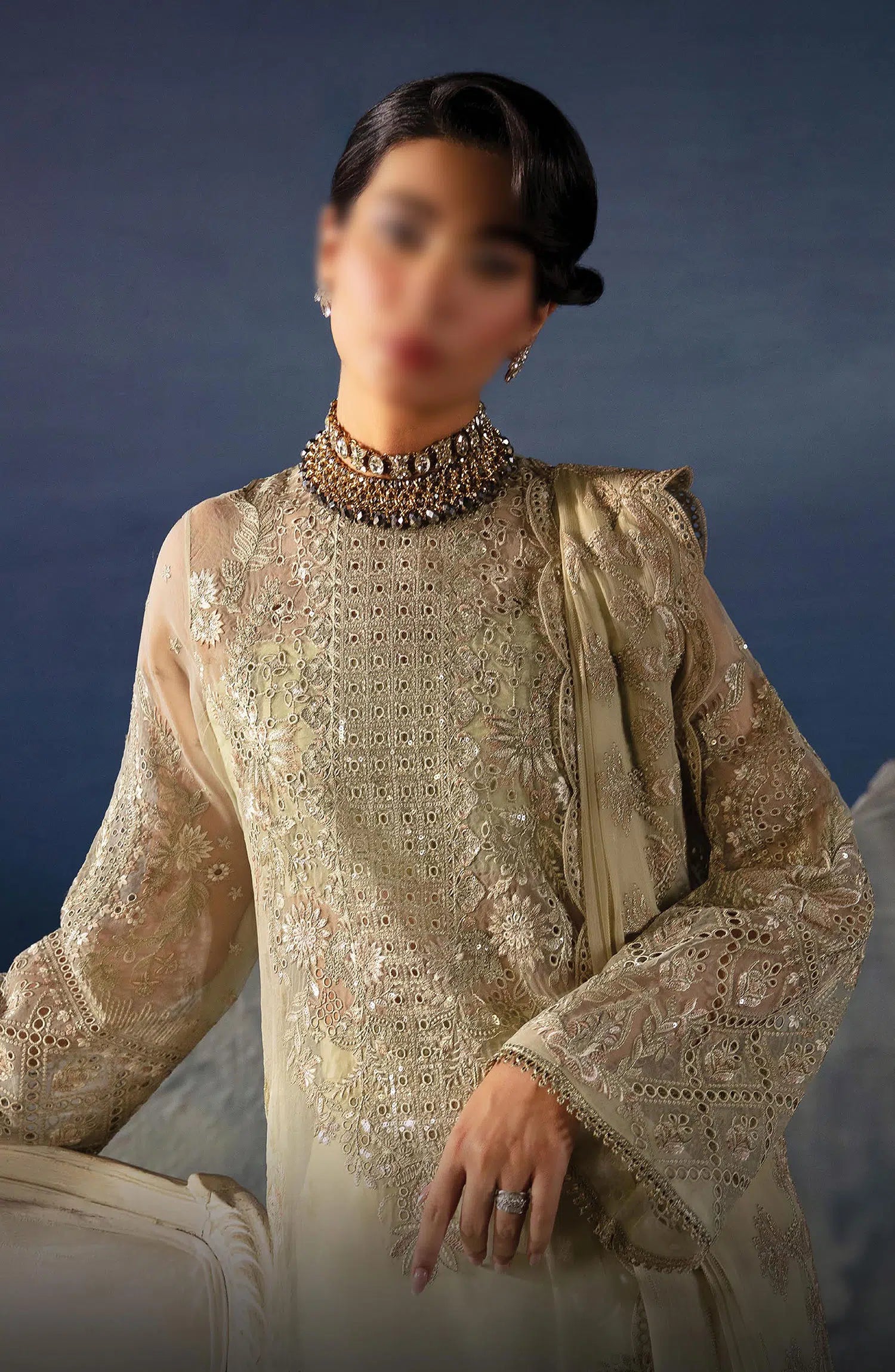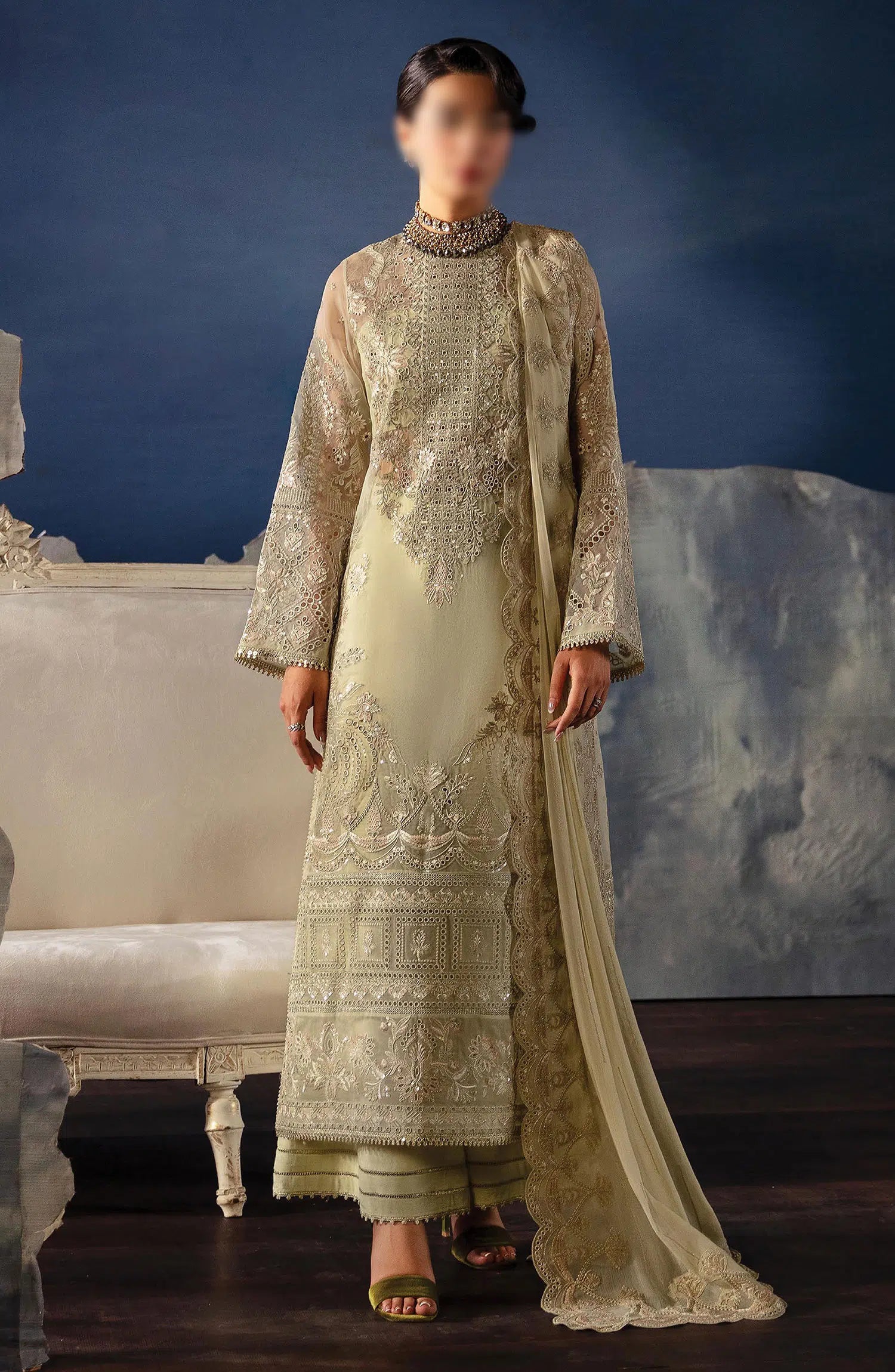 The standard style comes as a long-sleeved kameez with dupatta and trouser/shawlar.