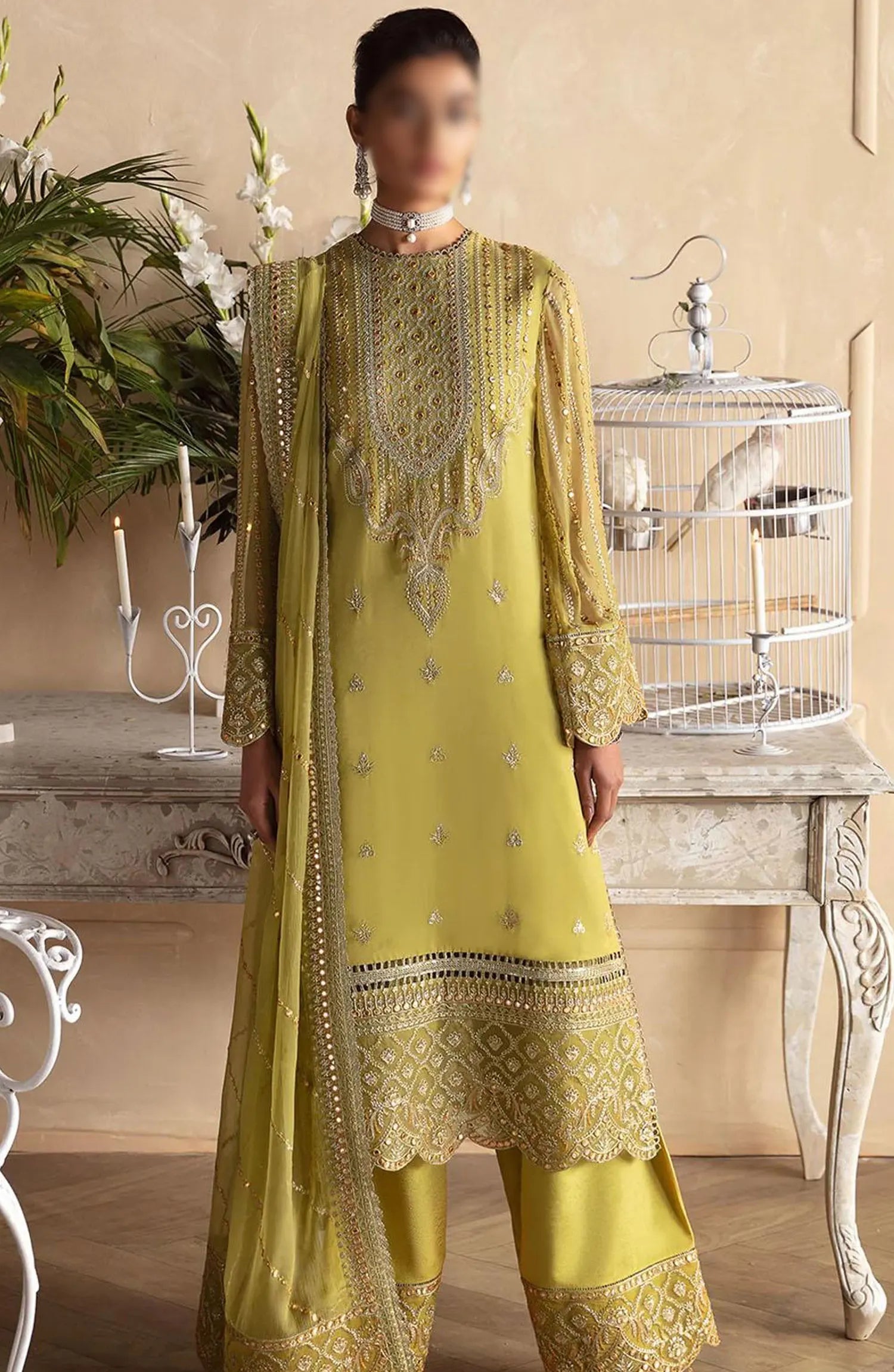 The standard style comes as a long-sleeved kameez with dupatta and trouser/shalwar.
