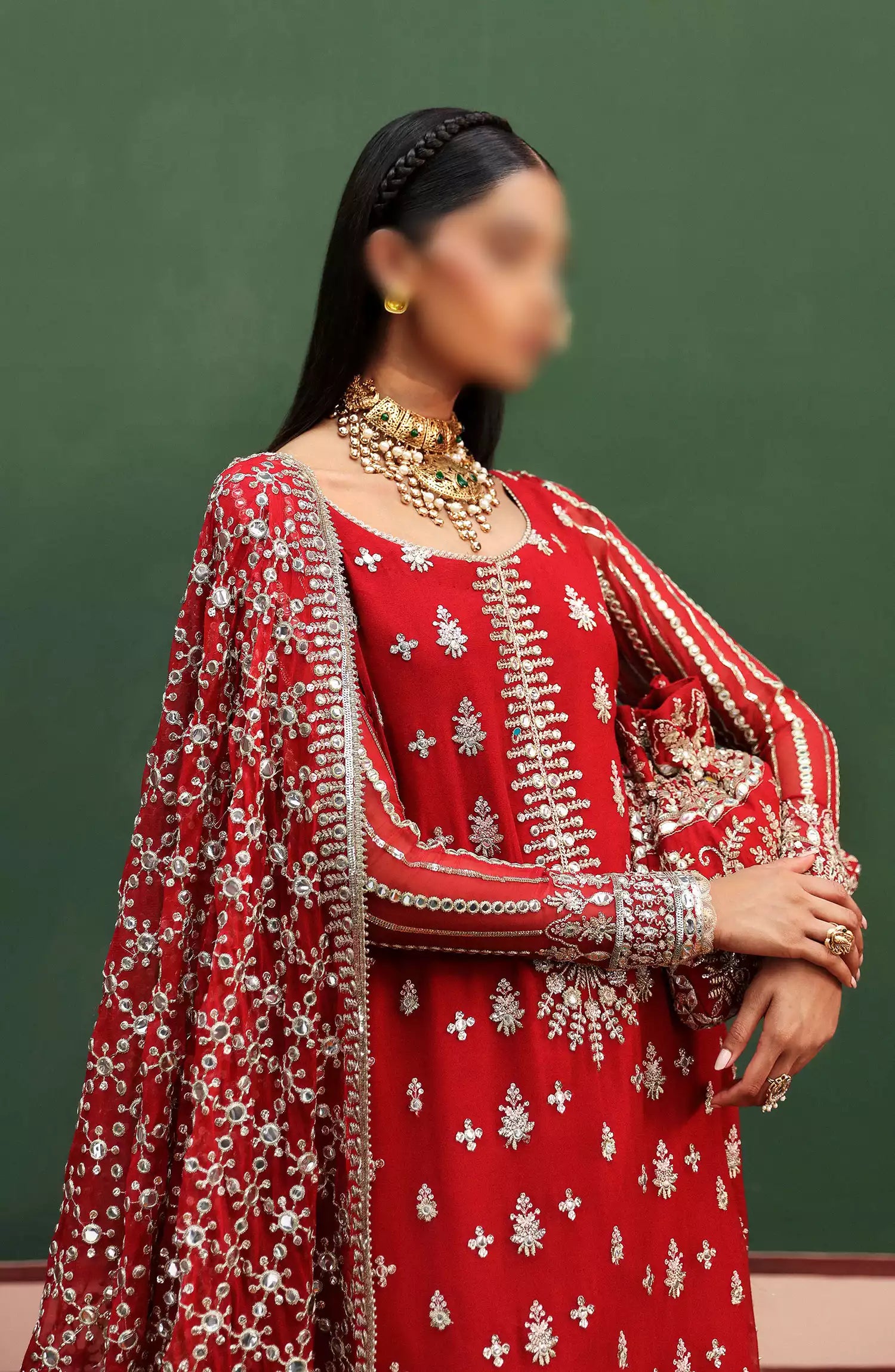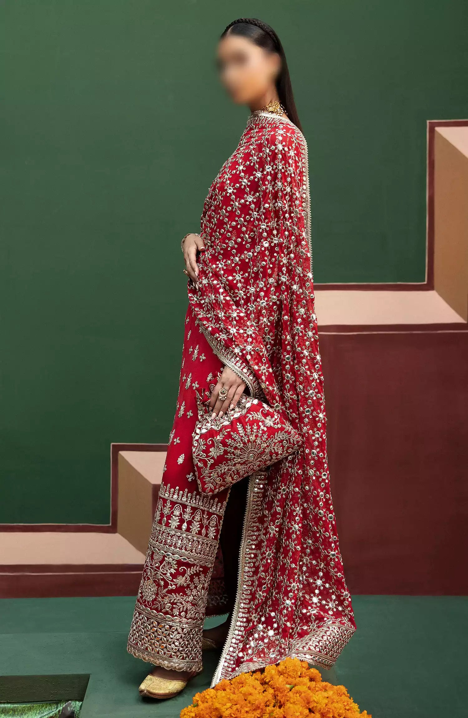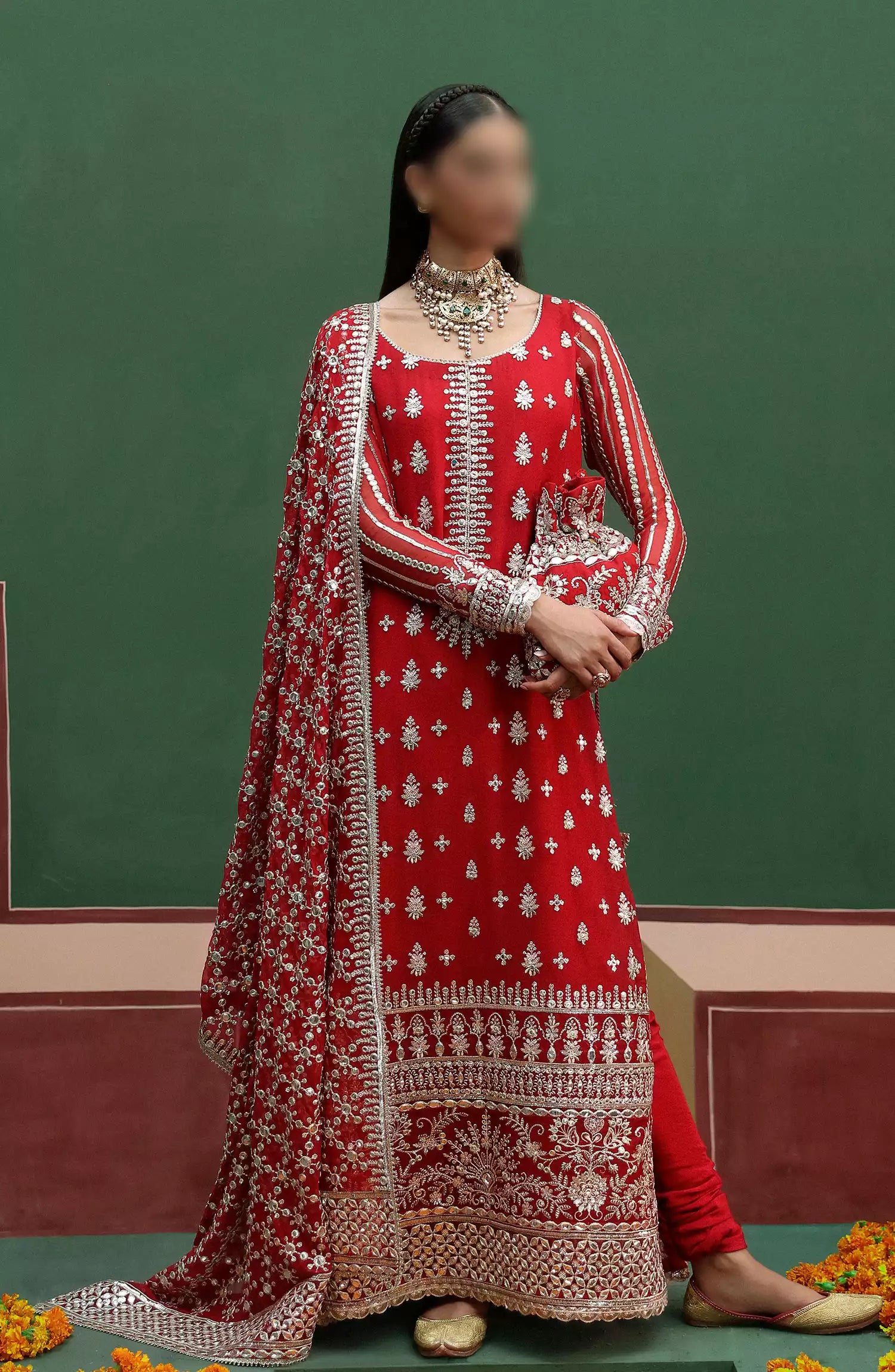 Afrozeh Shehnai Unstitched Wedding Formals 2024 has been styled in the image for photography and illustrative purposes.