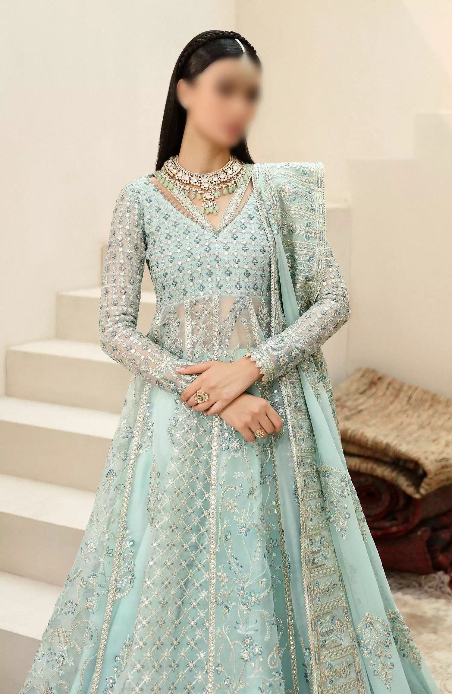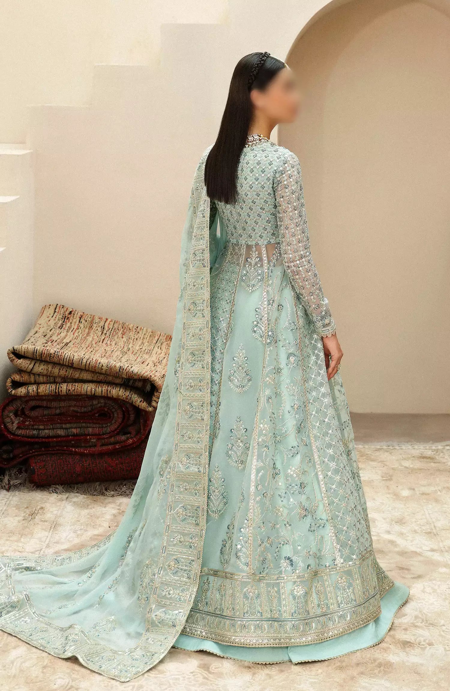 Afrozeh Shehnai Unstitched Wedding Formals 2024 has been styled in the image for photography and illustrative purposes.