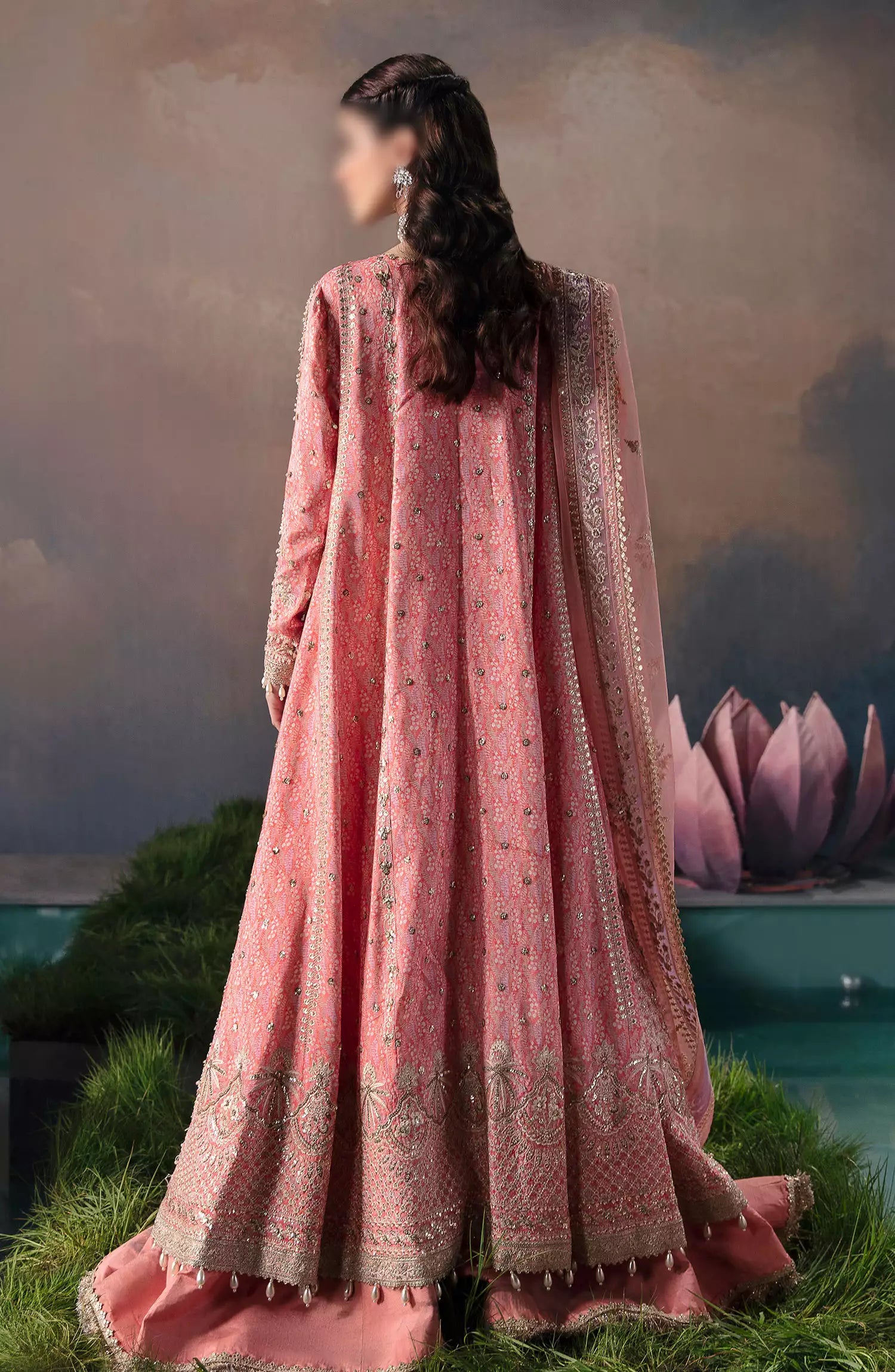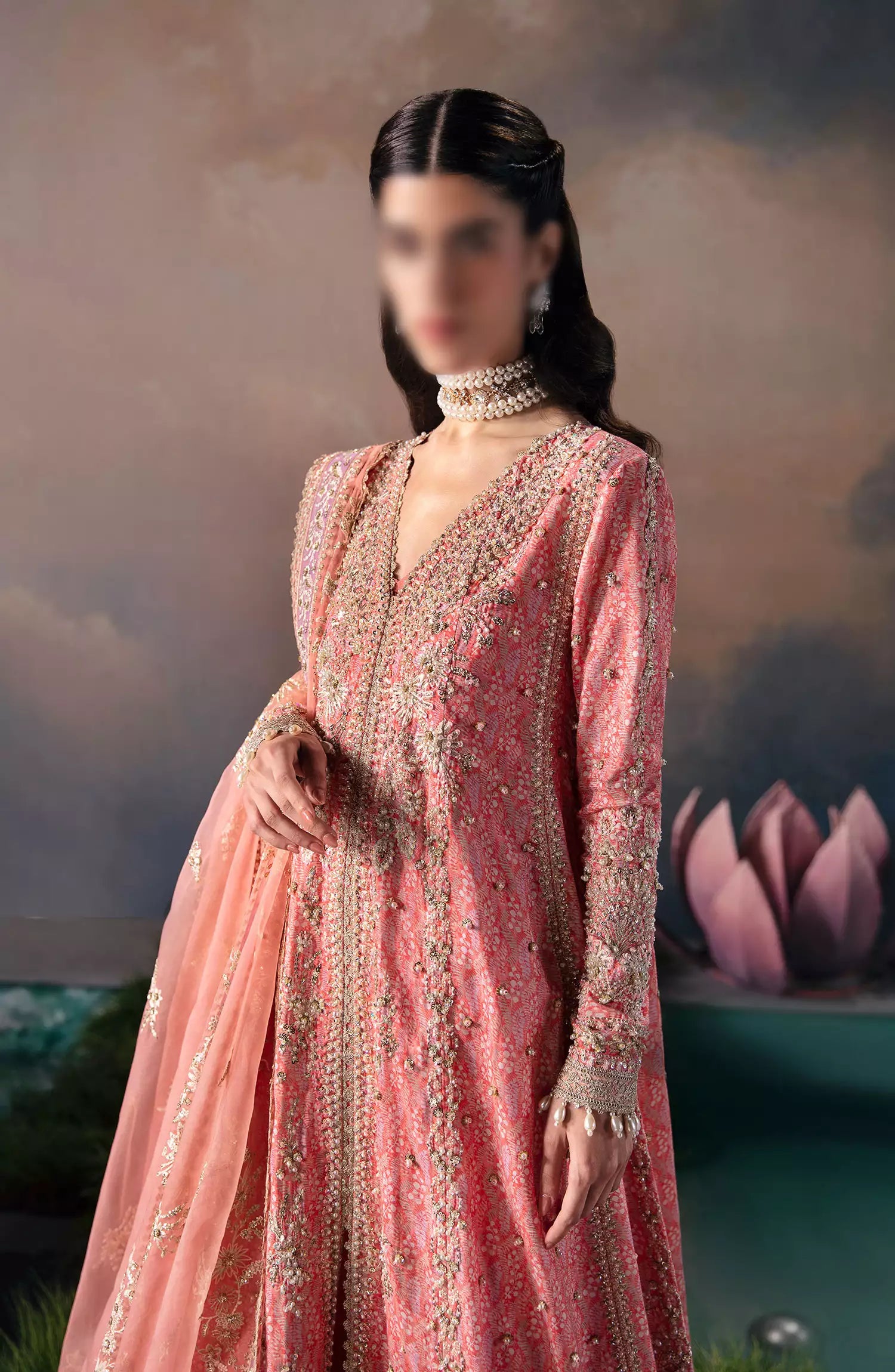 Wrap yourself in the elegance of a printed pink long-length gown, where intricate handwork creates a stunning tapestry in shades of white and pink. The luxurious gown is adorned with shimmering cutdana, sittara, and pearls.