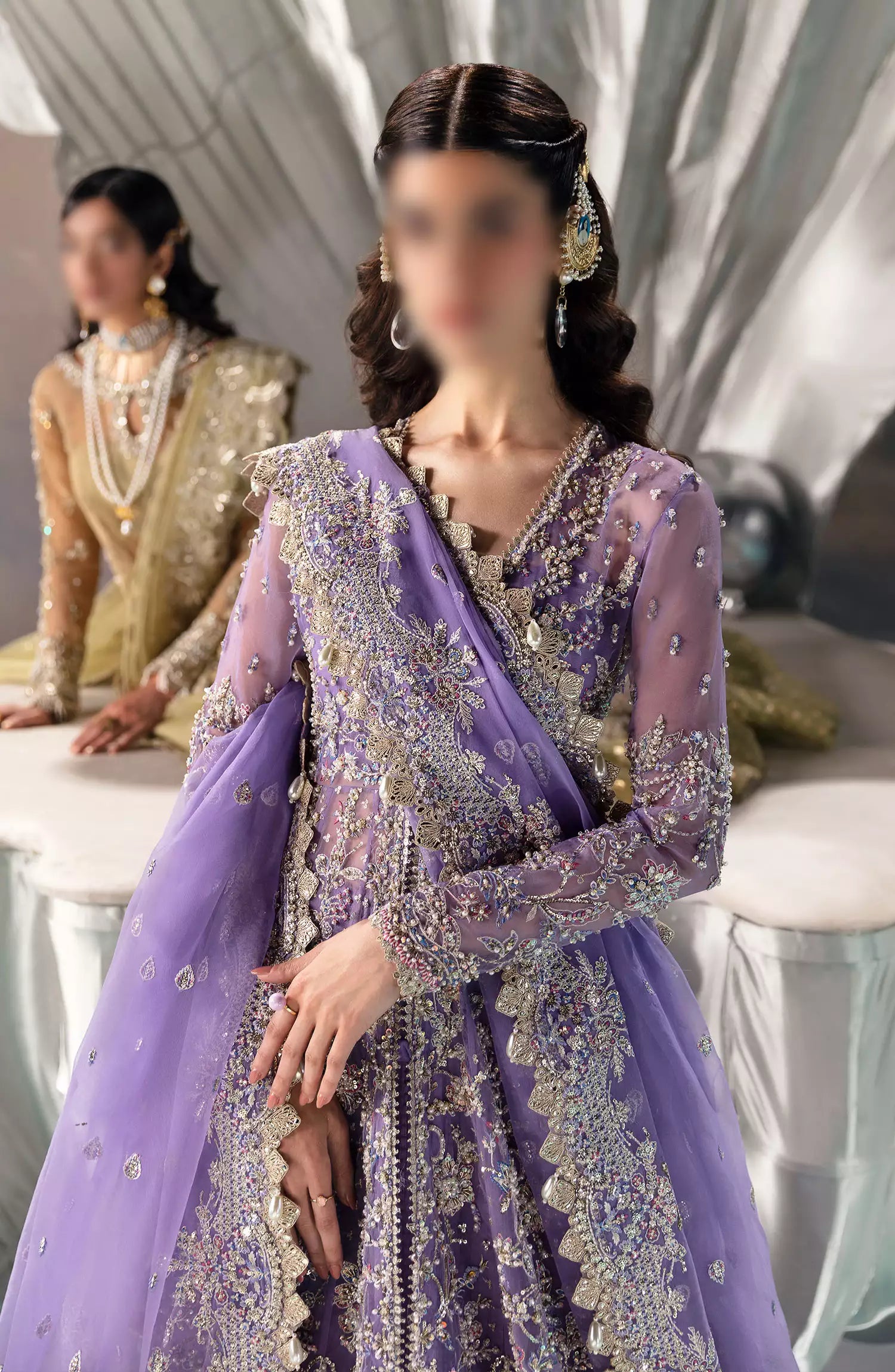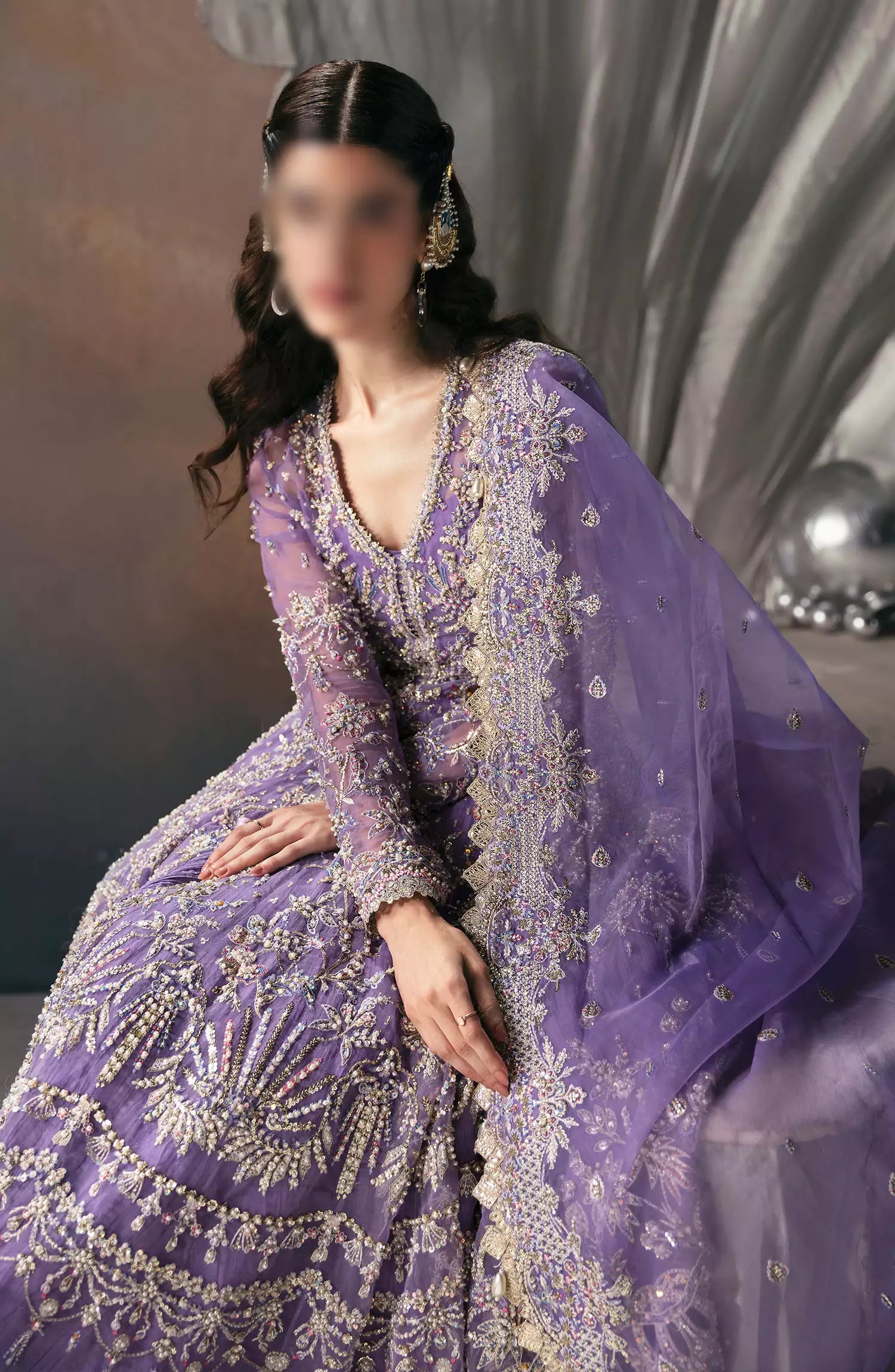 Eloah immortalises feminine grace with an effortlessly sophisticated aura with its stunning Lilac colour canvas. Crafted from soft organza, this peshwas features floral embroidered panels adorned with dull gold tilla, cutdana, pearls, and sequins hand-worked neatly onto it.