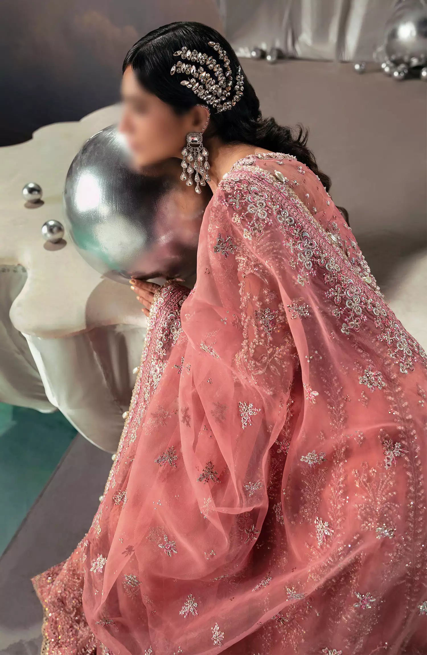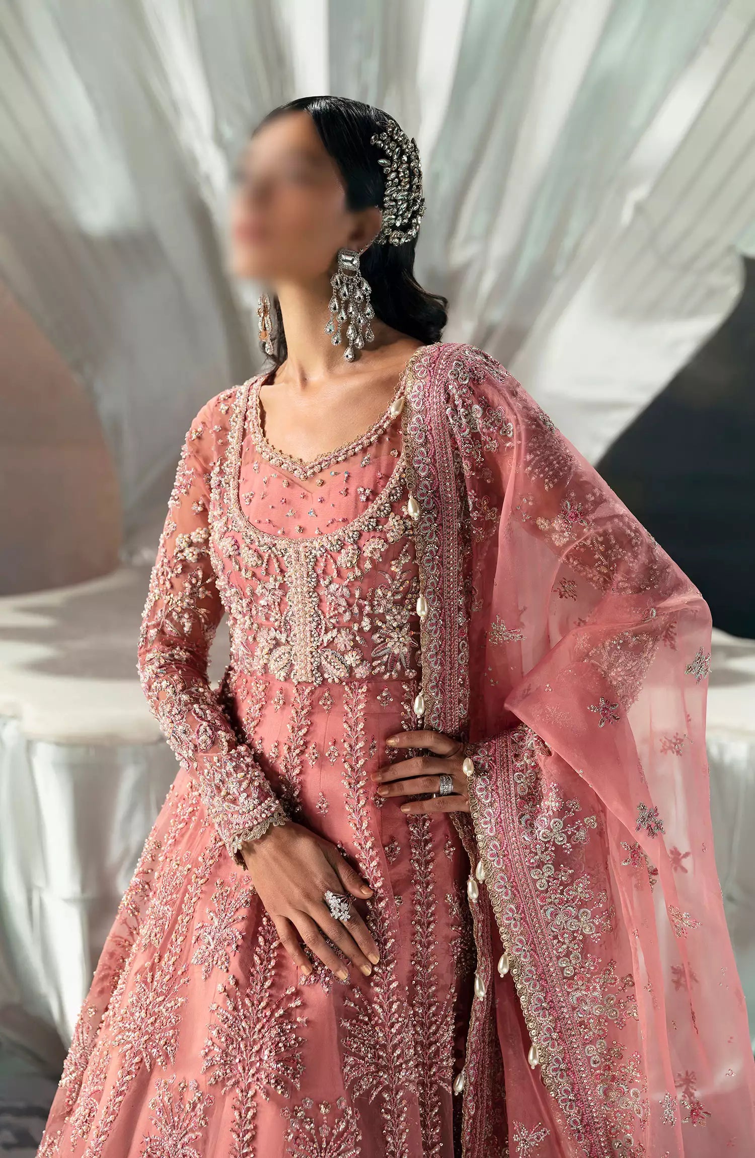 A sophisticated tea pink peshwas, Felicia features heavily hand embellished panels adorned with delicate embroidery on organza, uplifted with golden and chandi tilla, cutdana, pearls, baithki, and sequins.