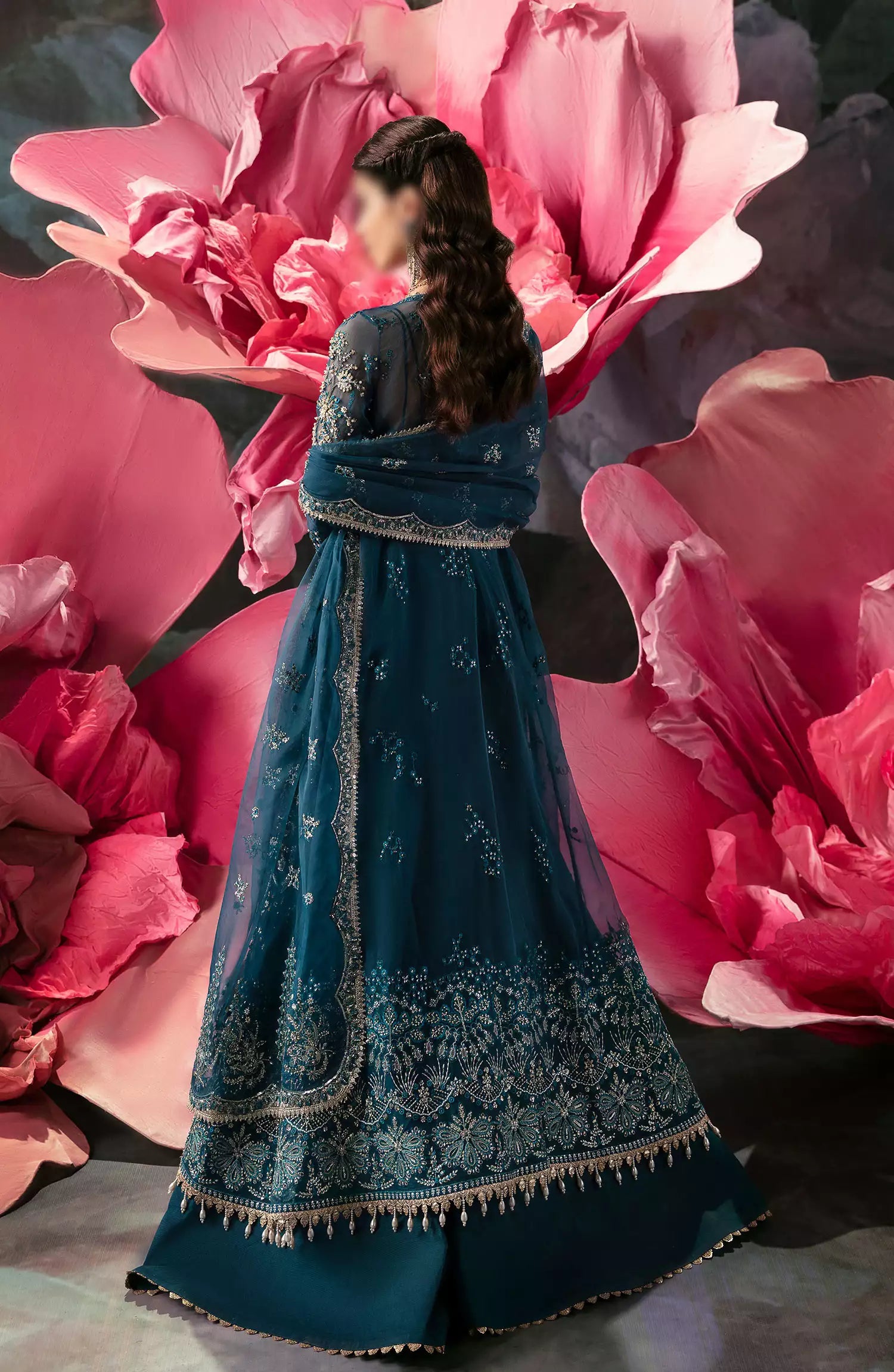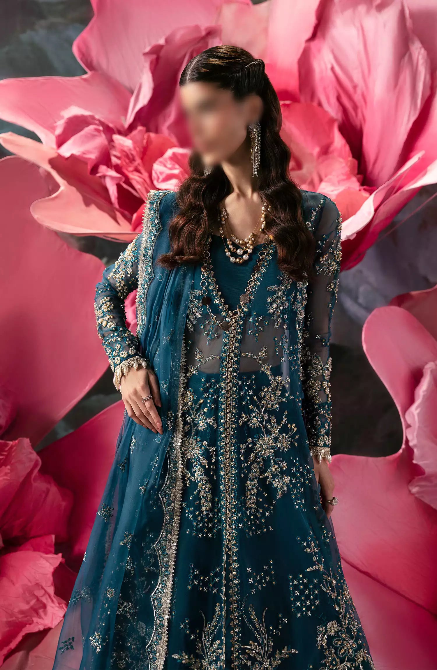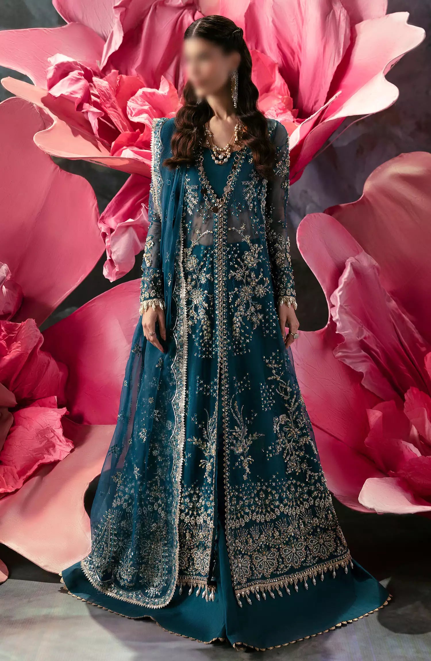 Dress to impress in this stunning gown crafted from teal organza fabric, featuring intricately embroidered panels hand-embellished with cut dana, pearls, and baithki. The gown boasts full-length fitted sleeves for an elegant touch.