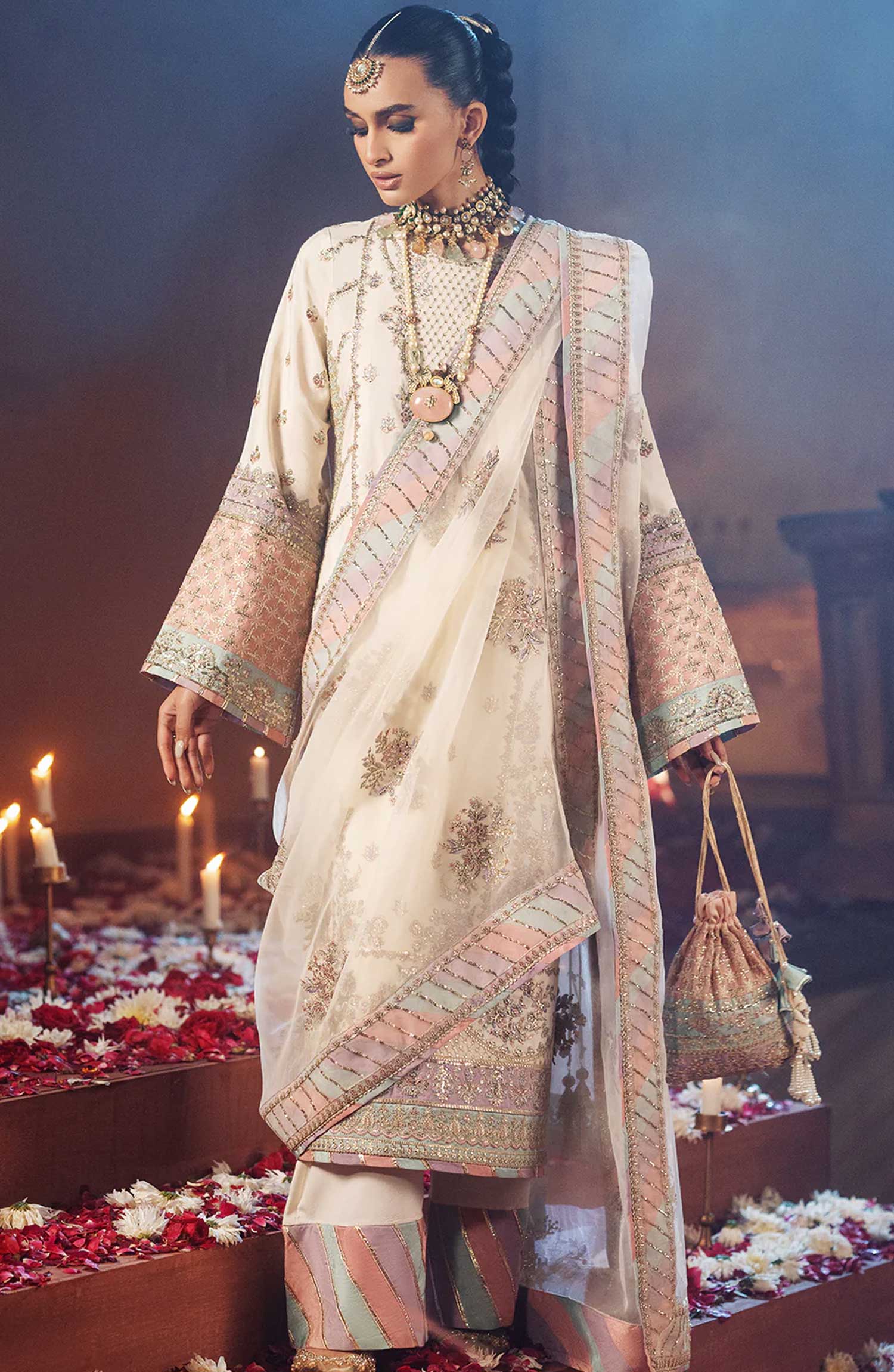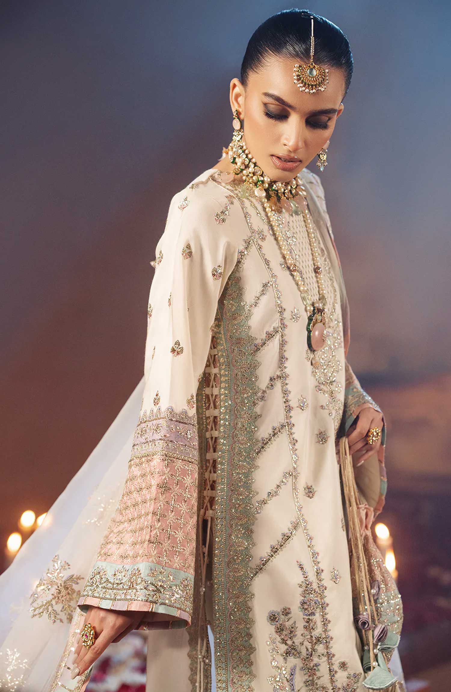 Resham Embroidered And Sequins Embellished 3 Different Colored Sleeves Border Creating Chta Patti Effect