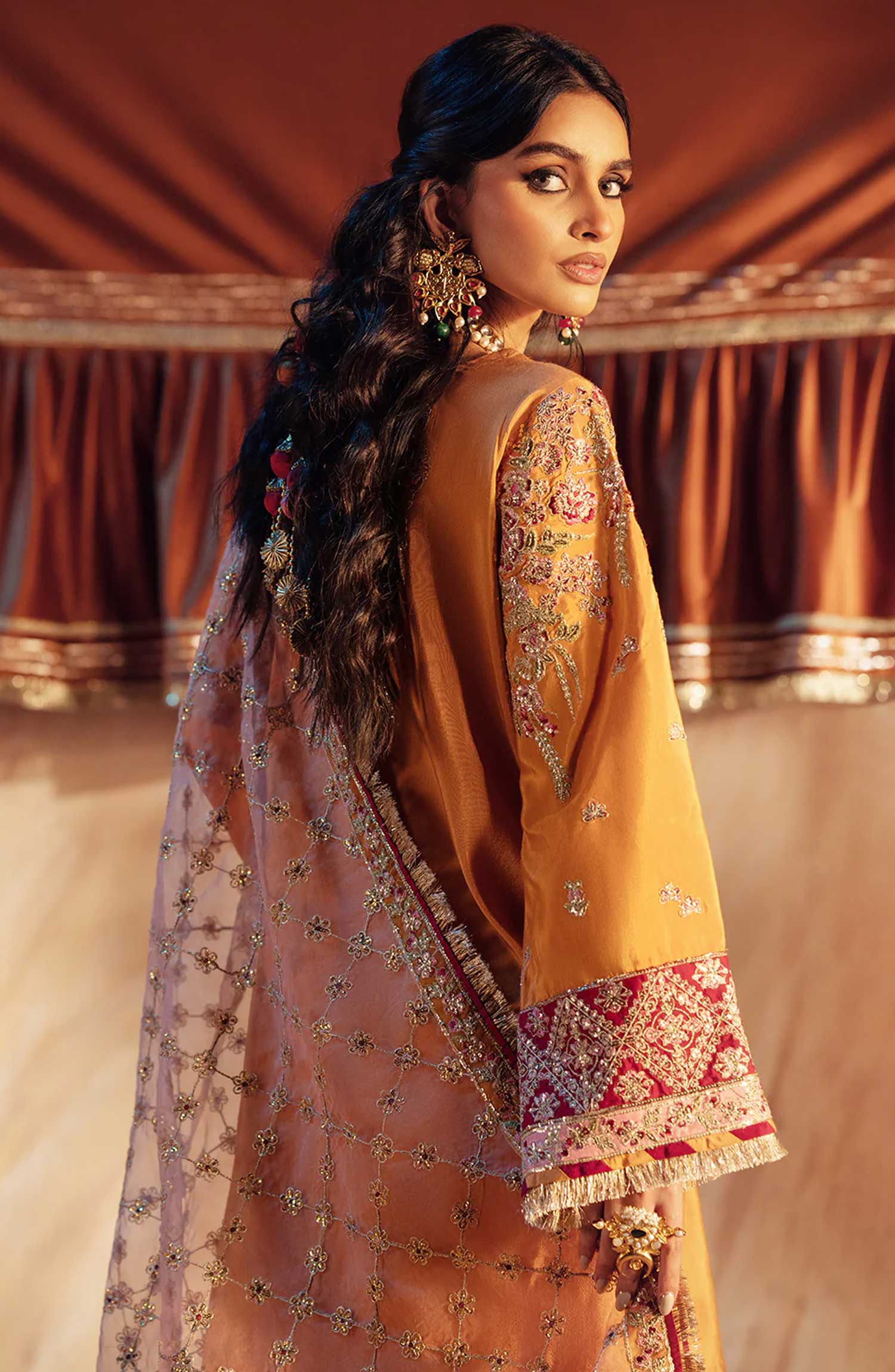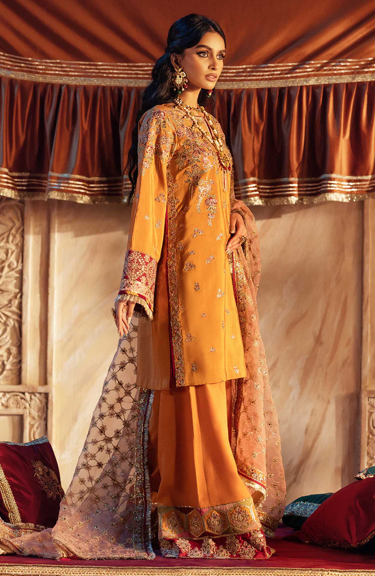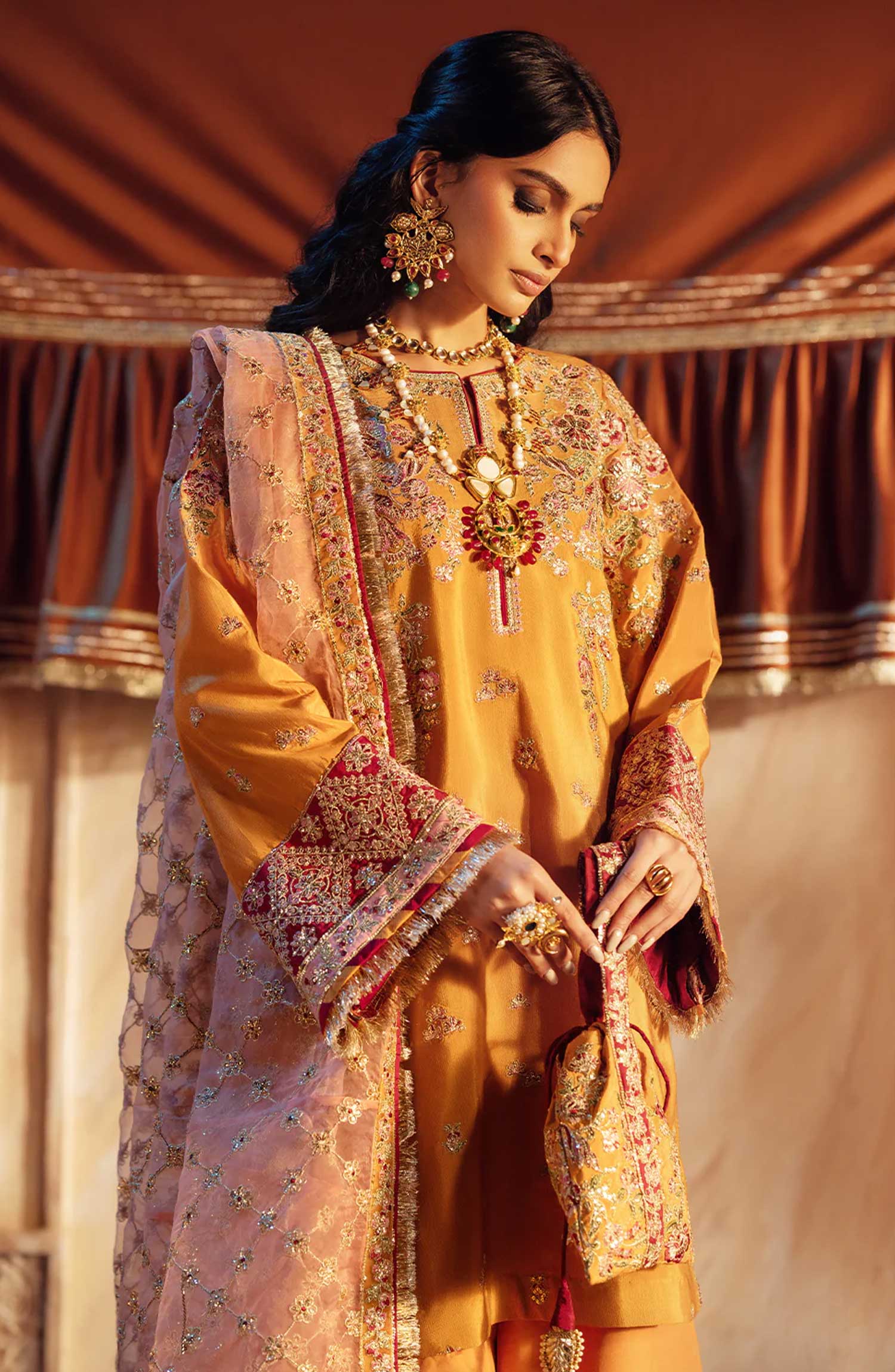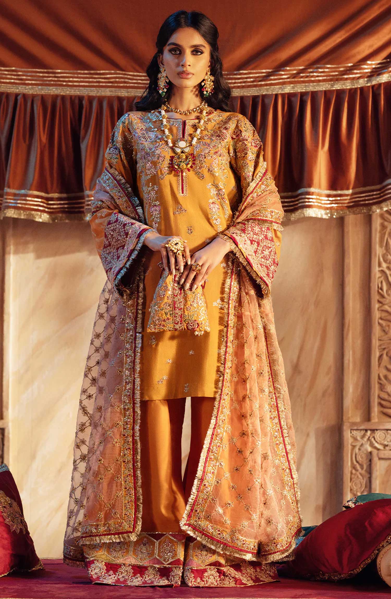 Musterd Yellow Composed Front With Floral Embroidery Coming Down From Shoulders And All Over Embroidery Spray Resham Embroidered Sleeves With Deep Maroon Finishing Borders