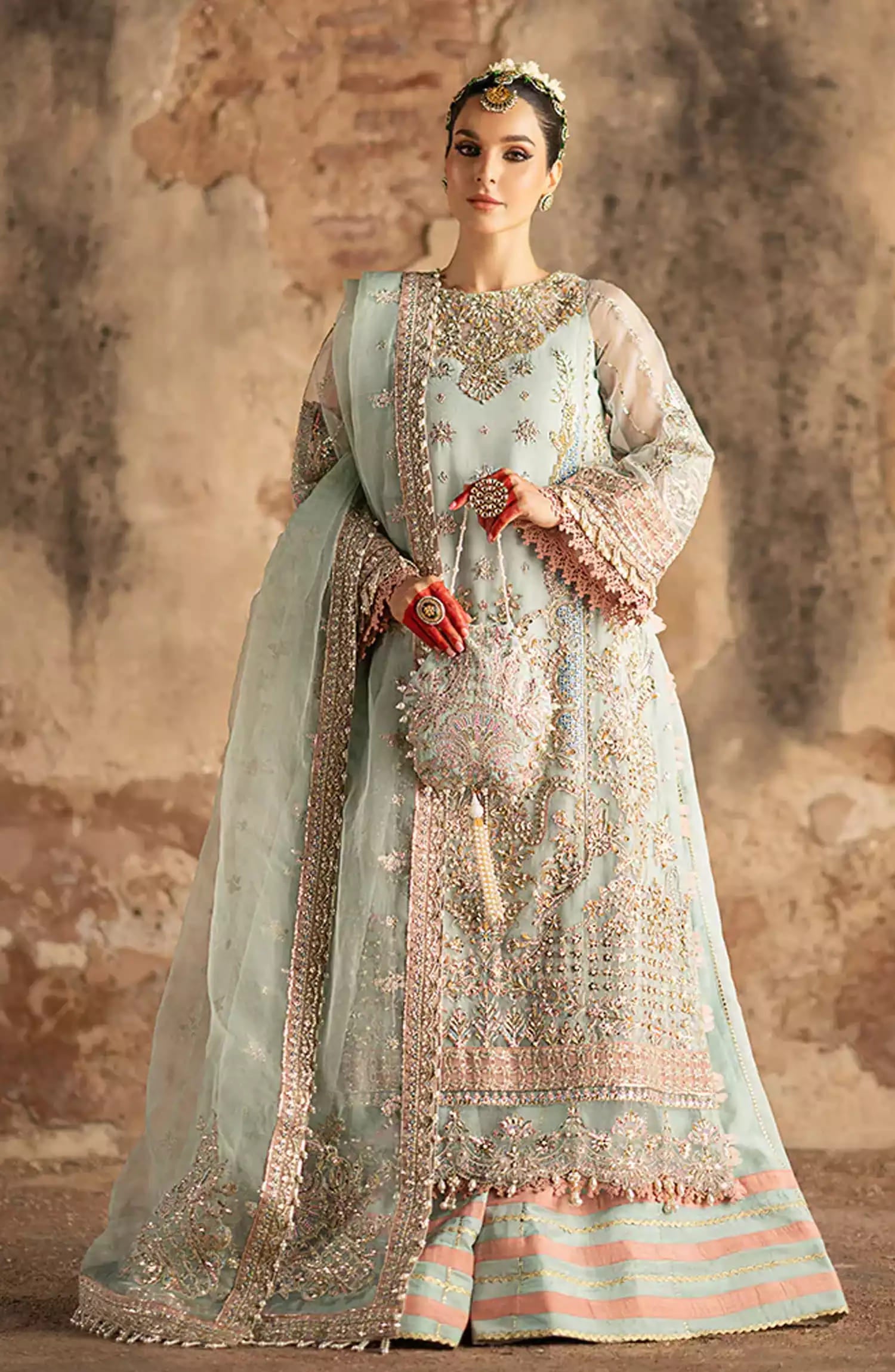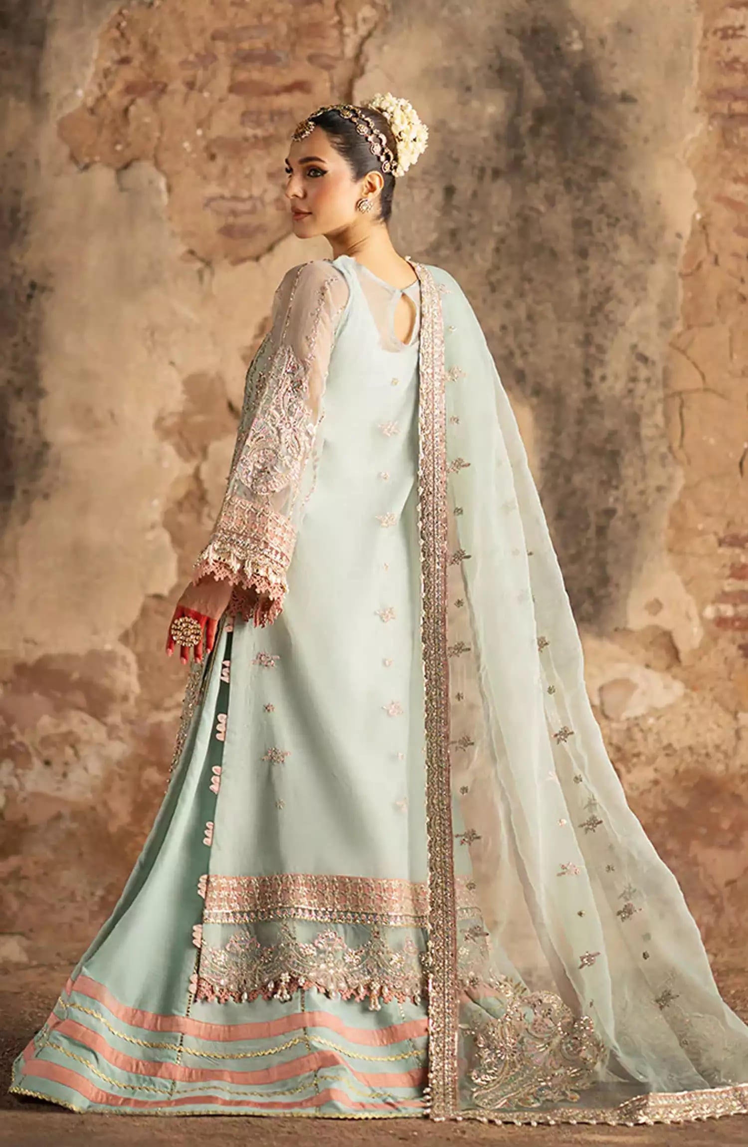 The organza front center panel, flanked by resham-embroidered and hand-embellished side panels, sets the stage for refined elegance. Each border, from the shirt to the sleeves, intricately woven with resham and sequin details, brings unparalleled artistry.