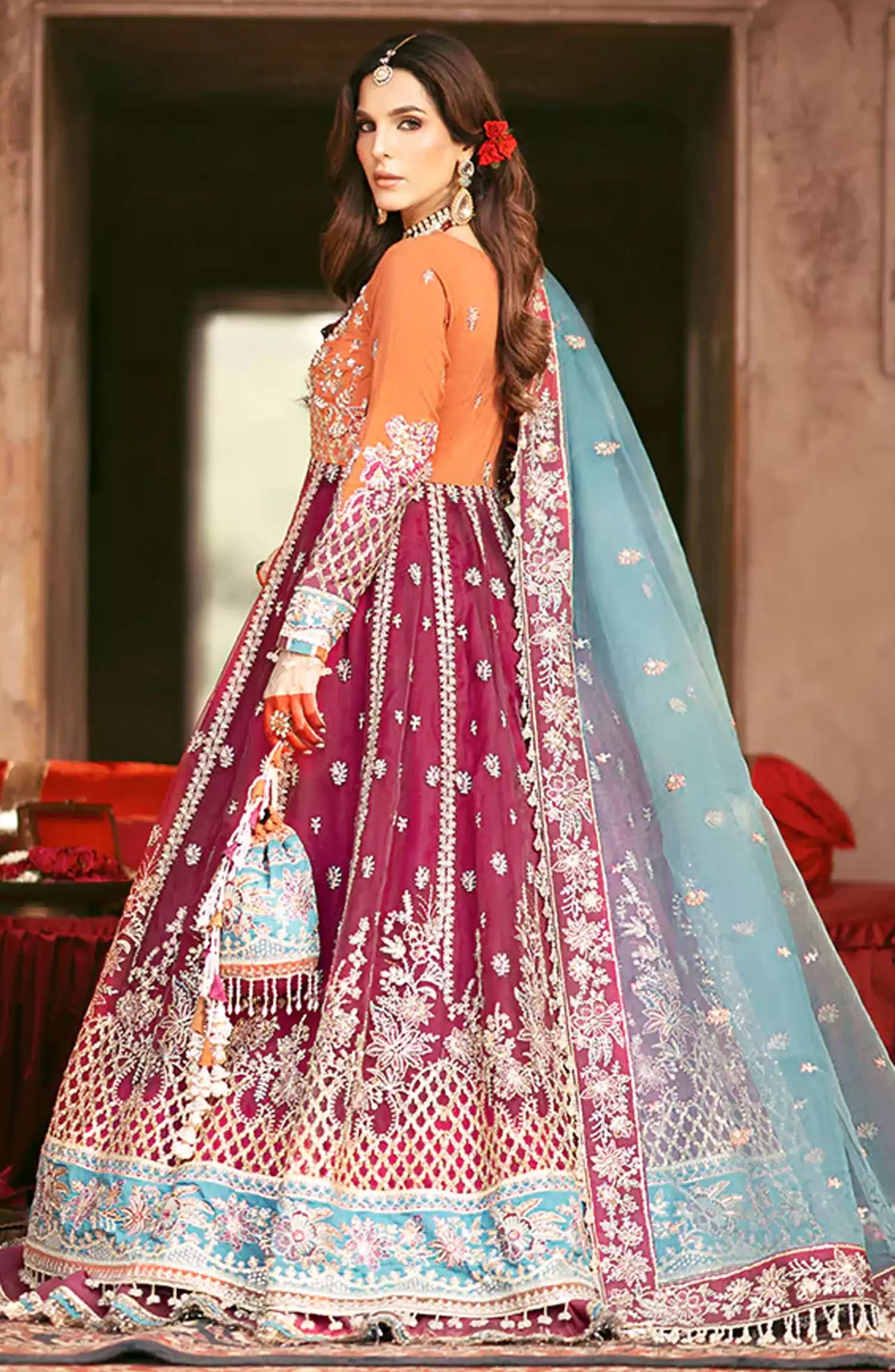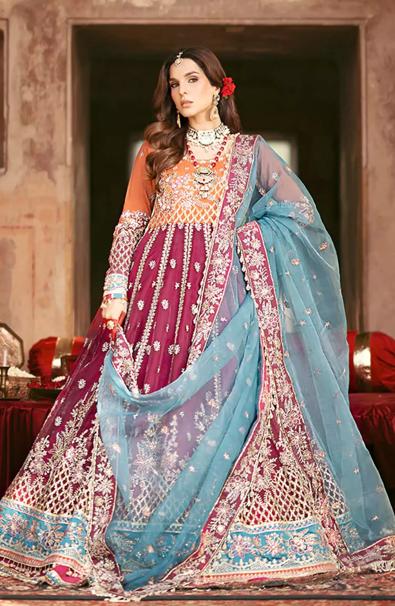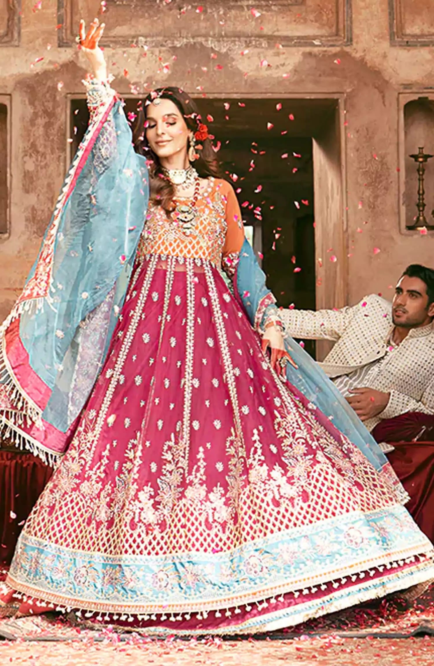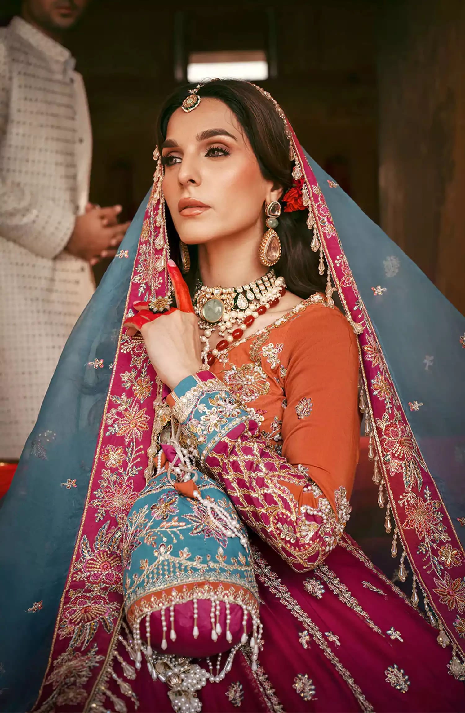 The pièce de résistance? A breathtaking pishwas, fashioned from 12 masterfully embroidered panels, framed by twin borders that exude opulence. Paired with an organza dupatta, shimmering in Resham and sequin accents, and a flowing rawsilk lehnga, Regalia* transforms luxury into a living, breathing work of art. Draped in Regalia, you don’t just wear elegance—you embody it.