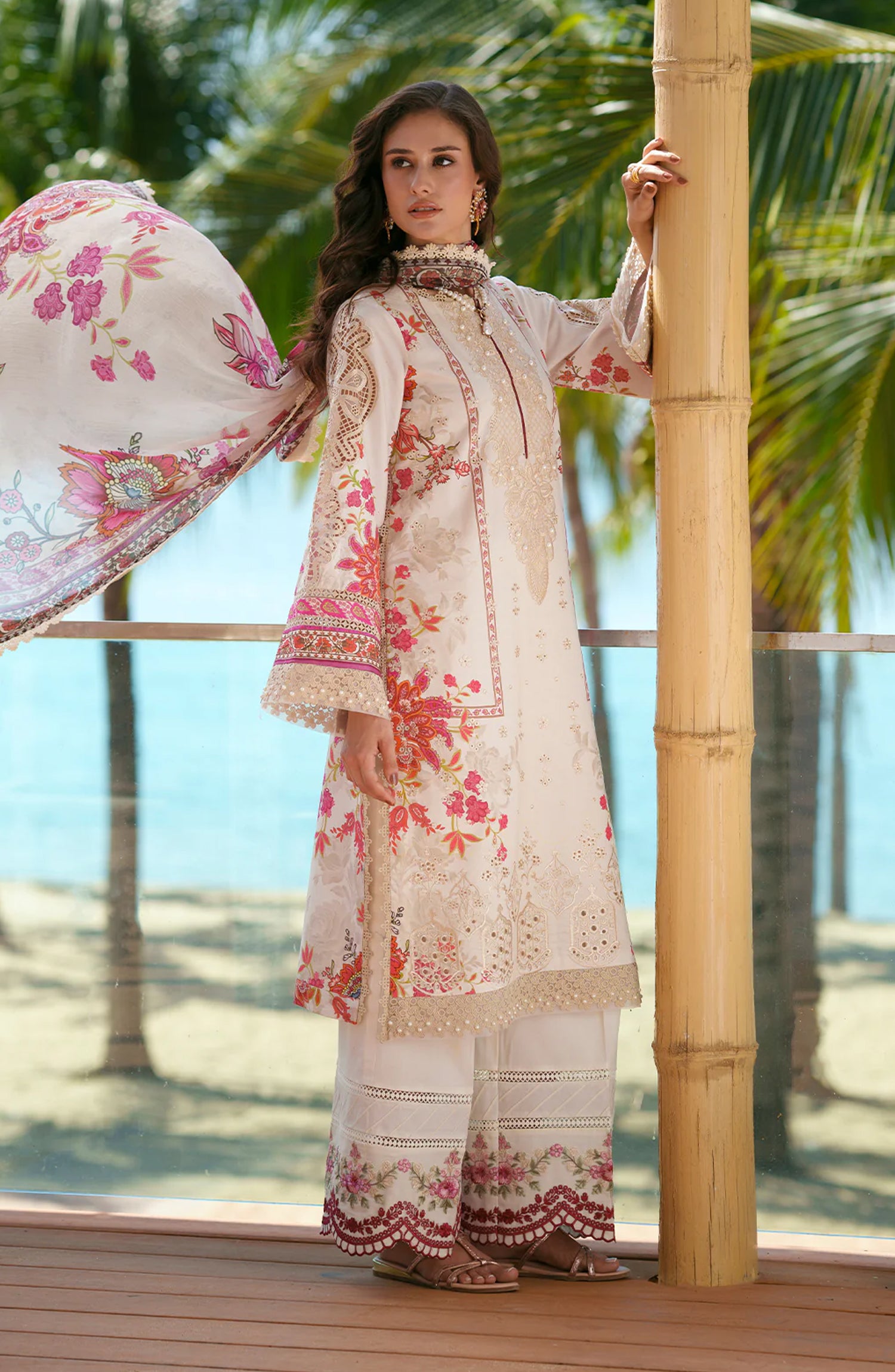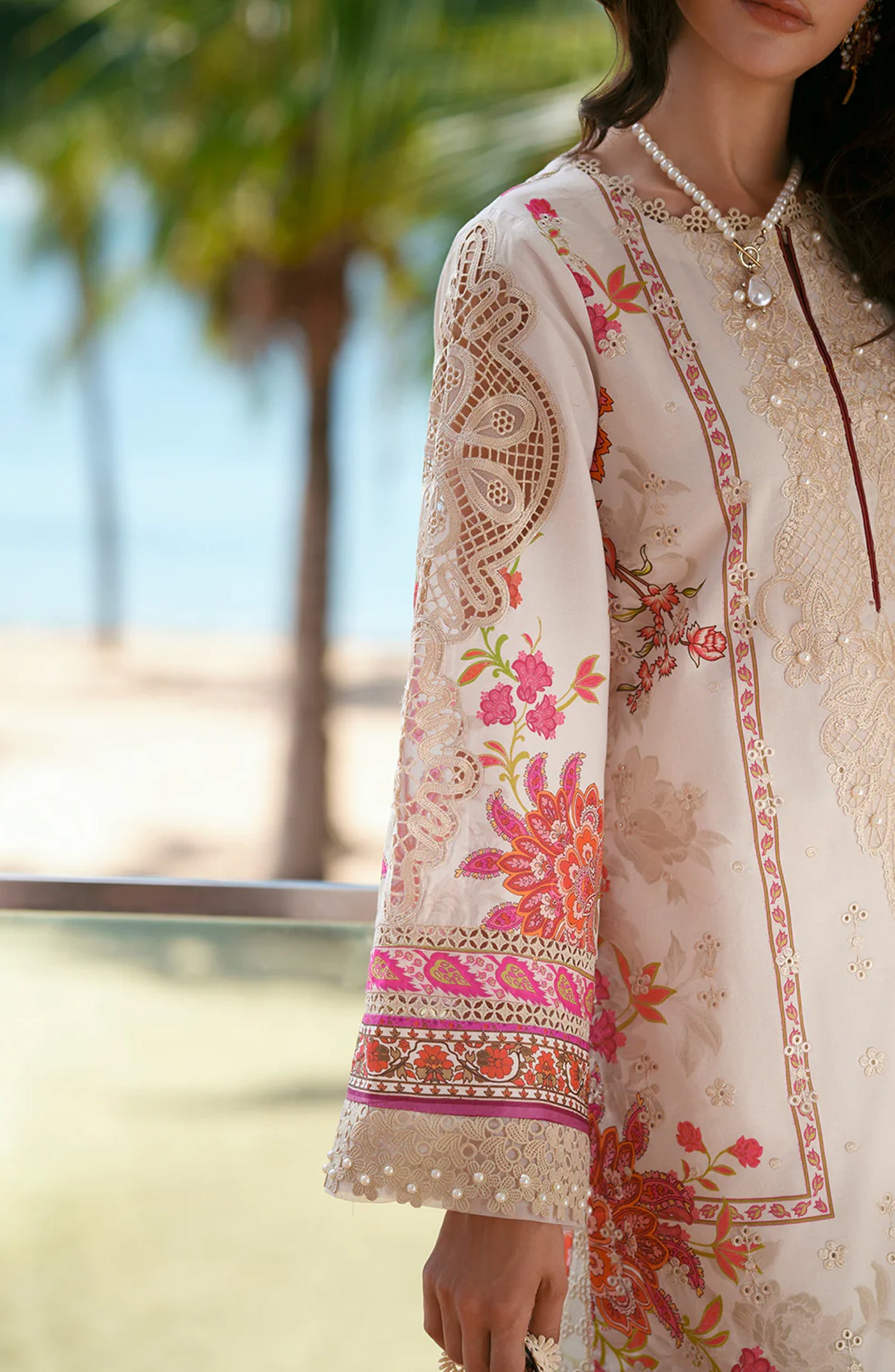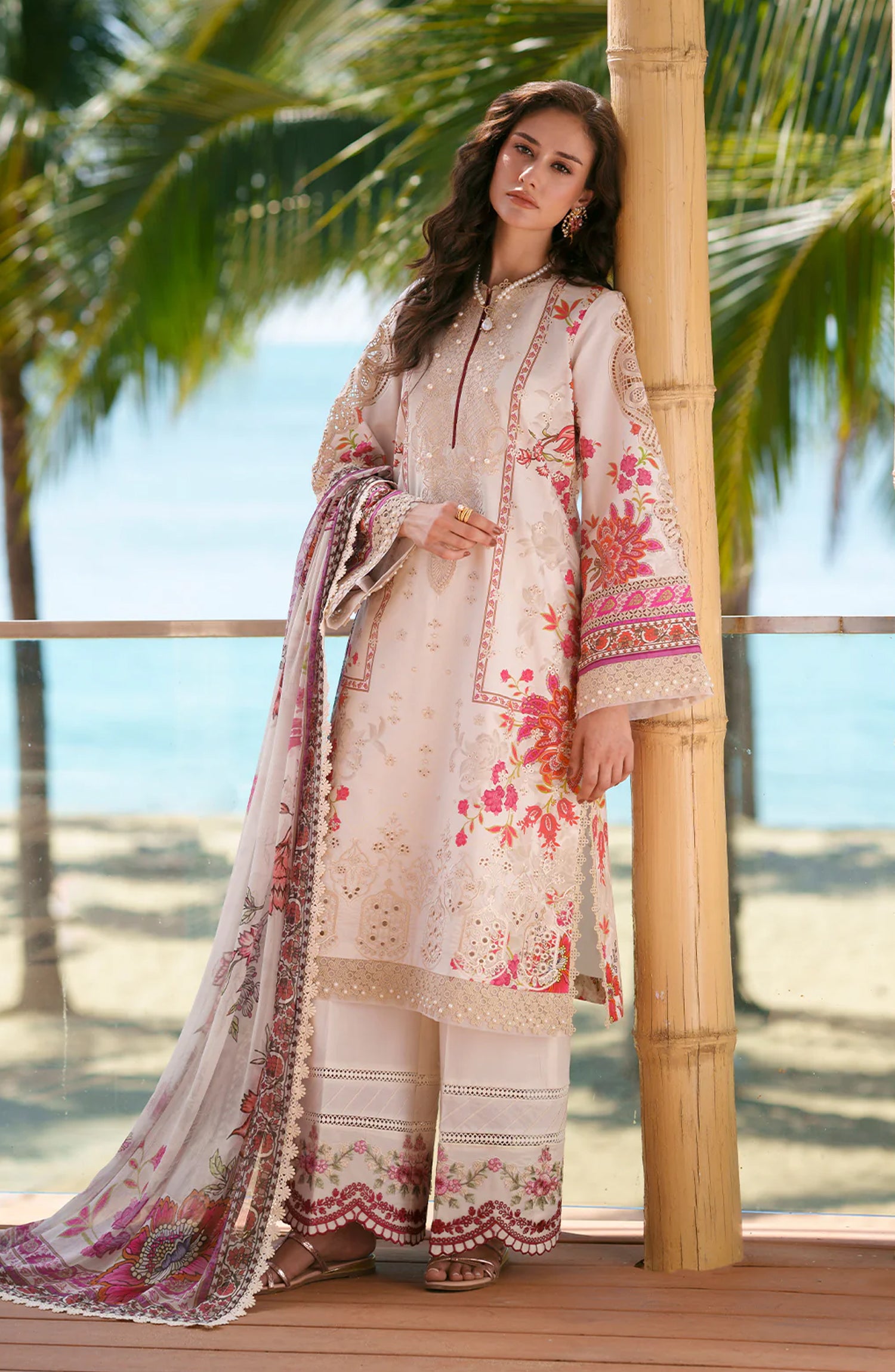 AJR Printed and Embroidered Chikankari Lawn Unstitched 3 Piece Suit - Aira - AJR26CH - Off White Beige - Summer Collection