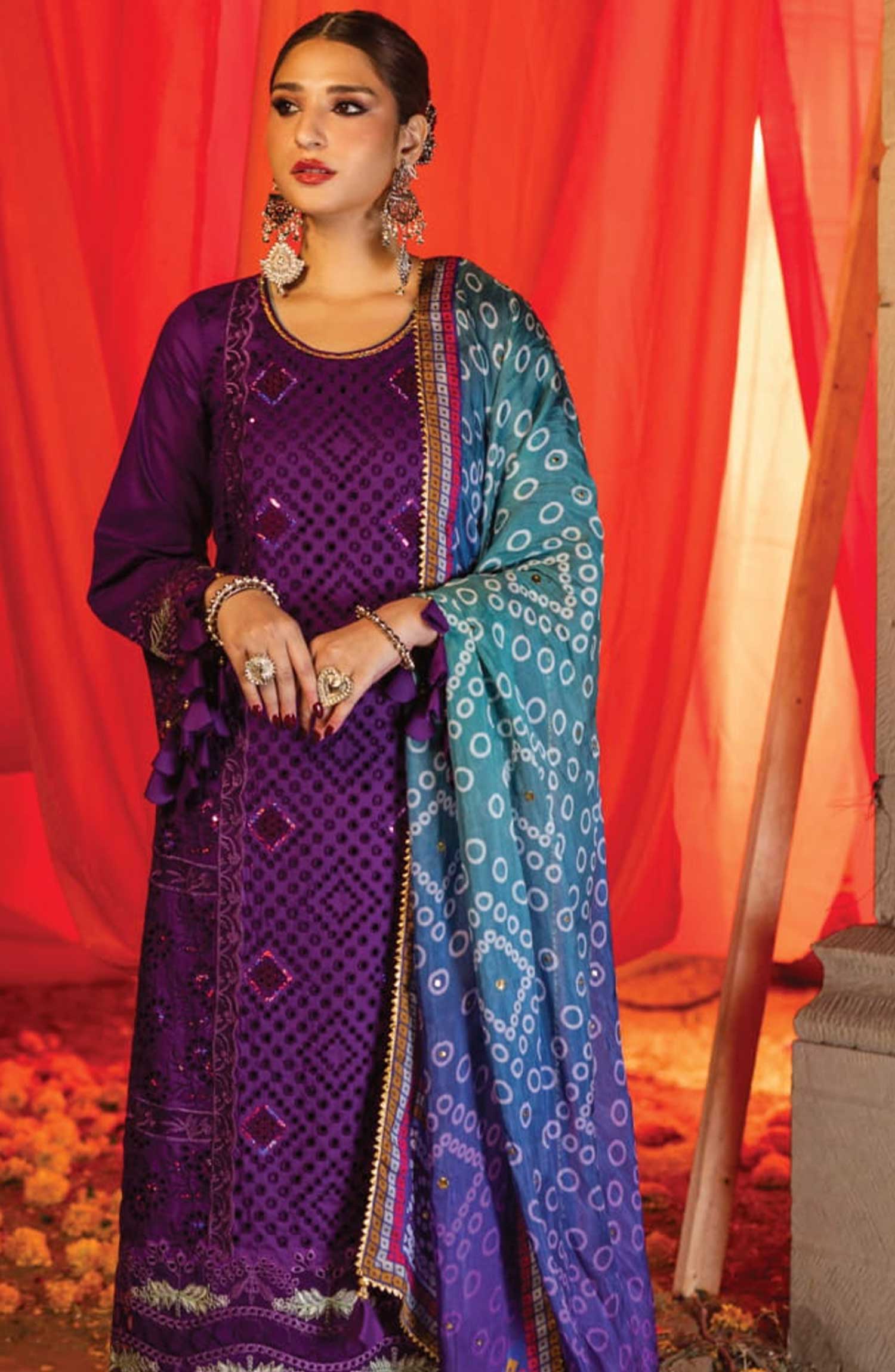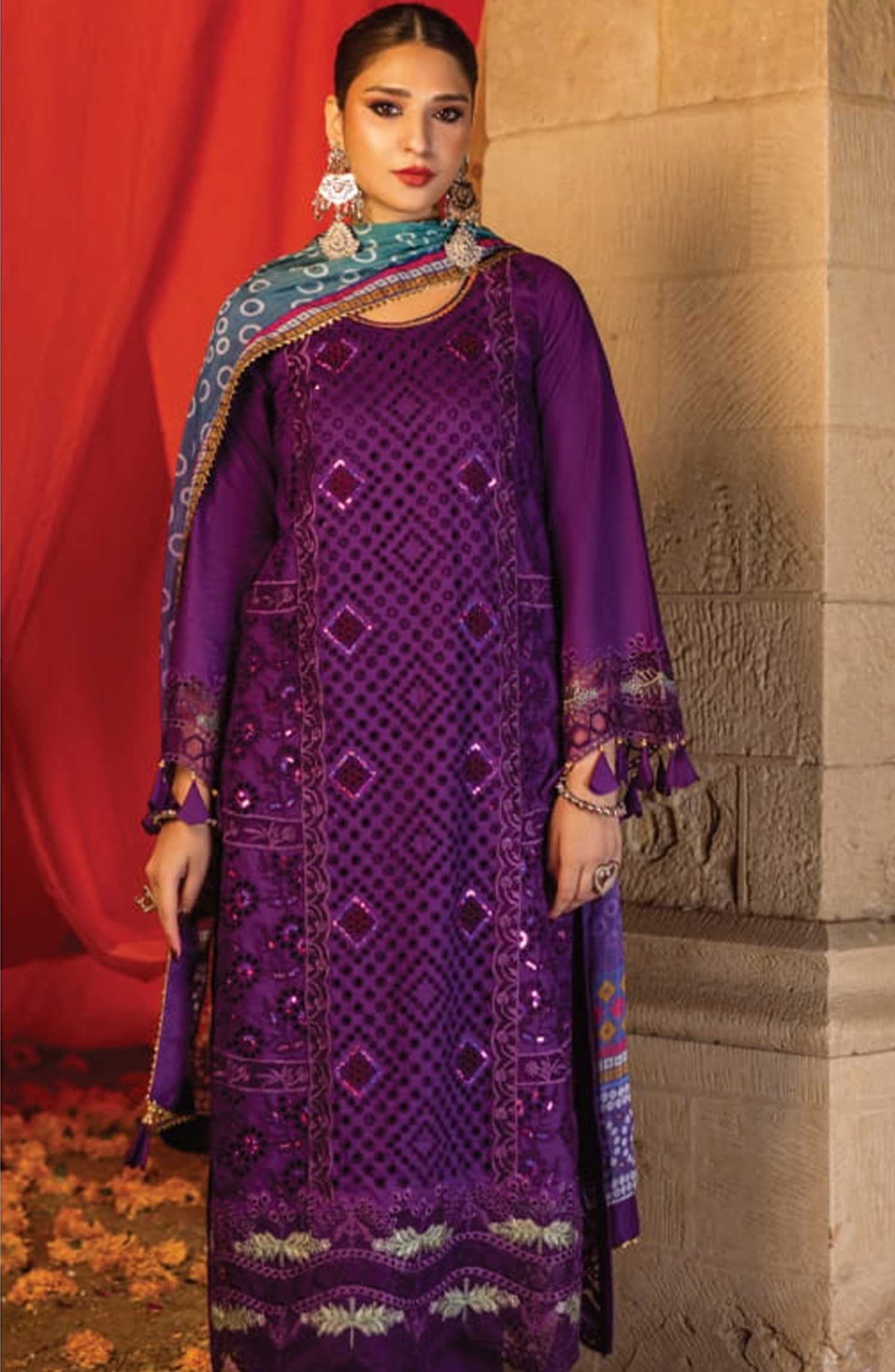 The standard style comes as a long-sleeved kameez with dupatta and trouser/shawlar.