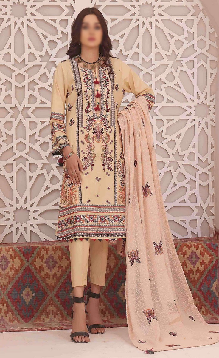 The standard style comes as a long-sleeved kameez with dupatta and trouser/shalwar.