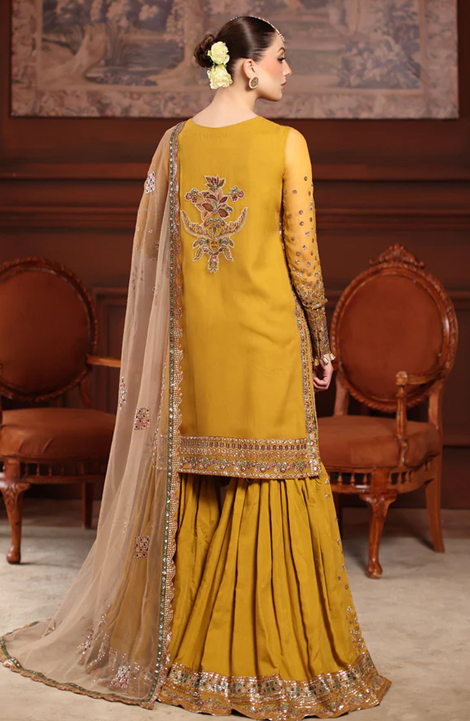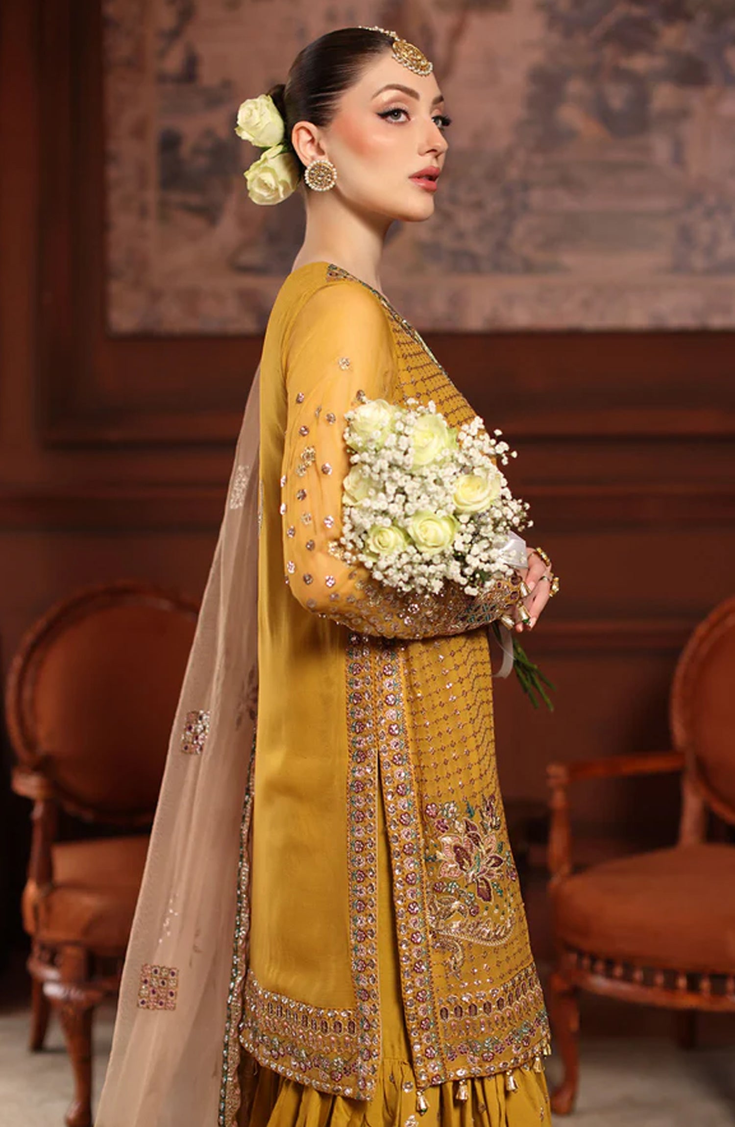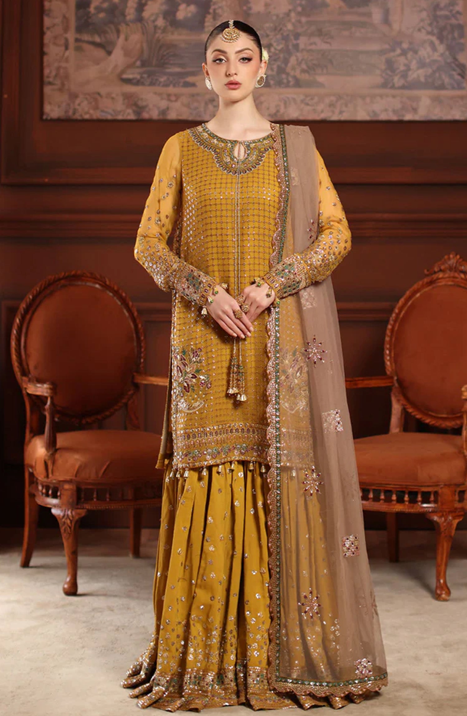 Alfaaz by Nureh Luxury Embroidered Chiffon Unstitched 3 Piece Suit - NL-92 - NU25AFZ - Mustard - Festive Collection