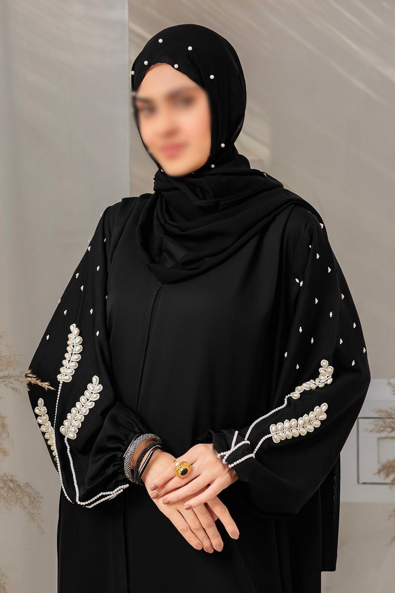 When looking for something Classy and Unique, our beautiful Flower Pearls work Abaya is gorgeous yet elegant with work on sleeves and paired with pure Korean Nidha Sheila
