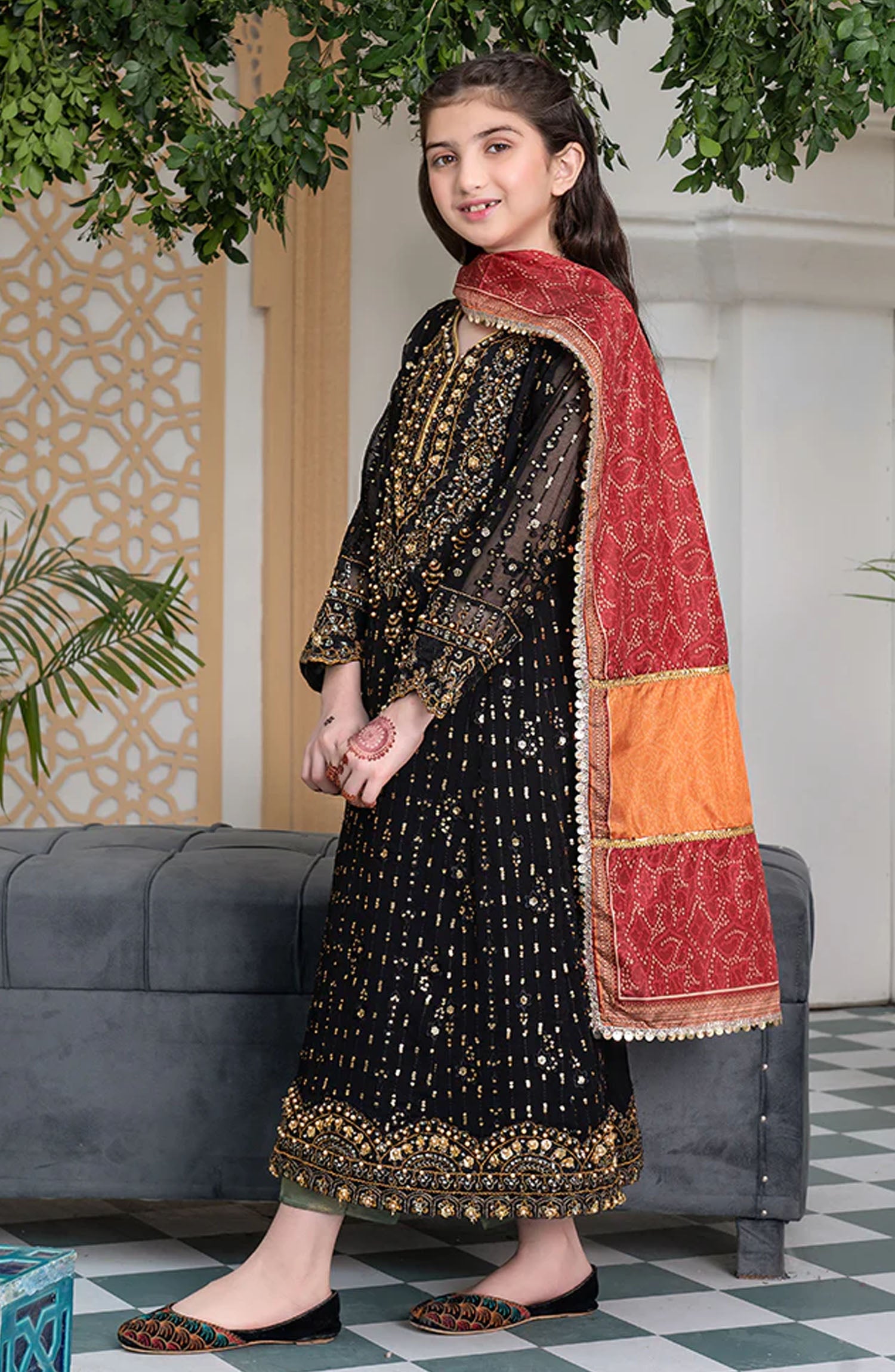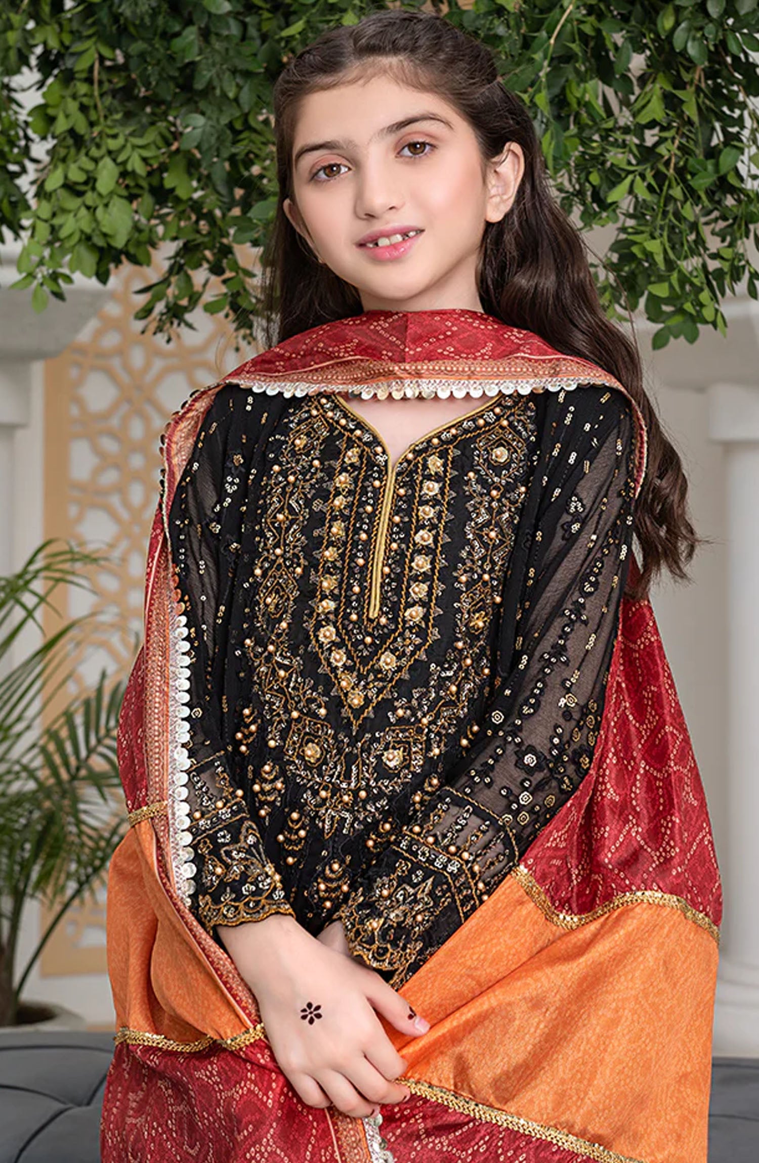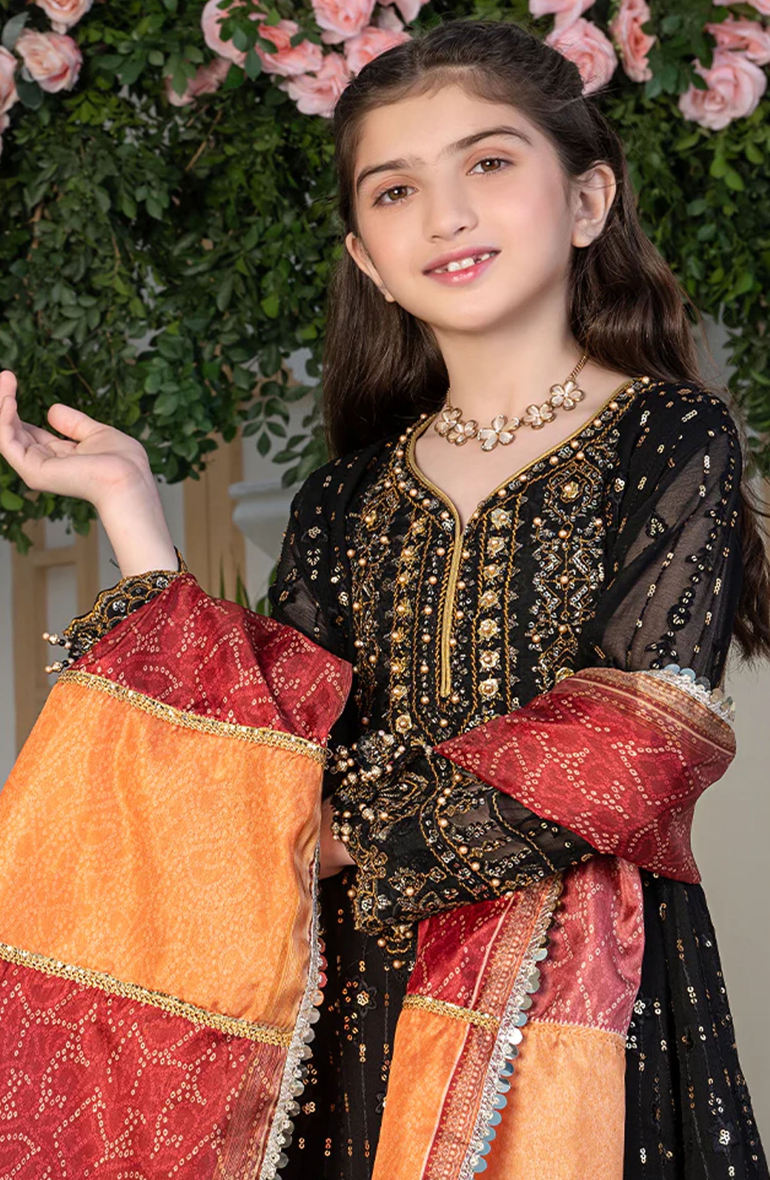 Additional Description: chiffon embroidered maxi enriched with gotta patti and pearls Tissue silk printed dupatta with laces Masoori straight trouser.