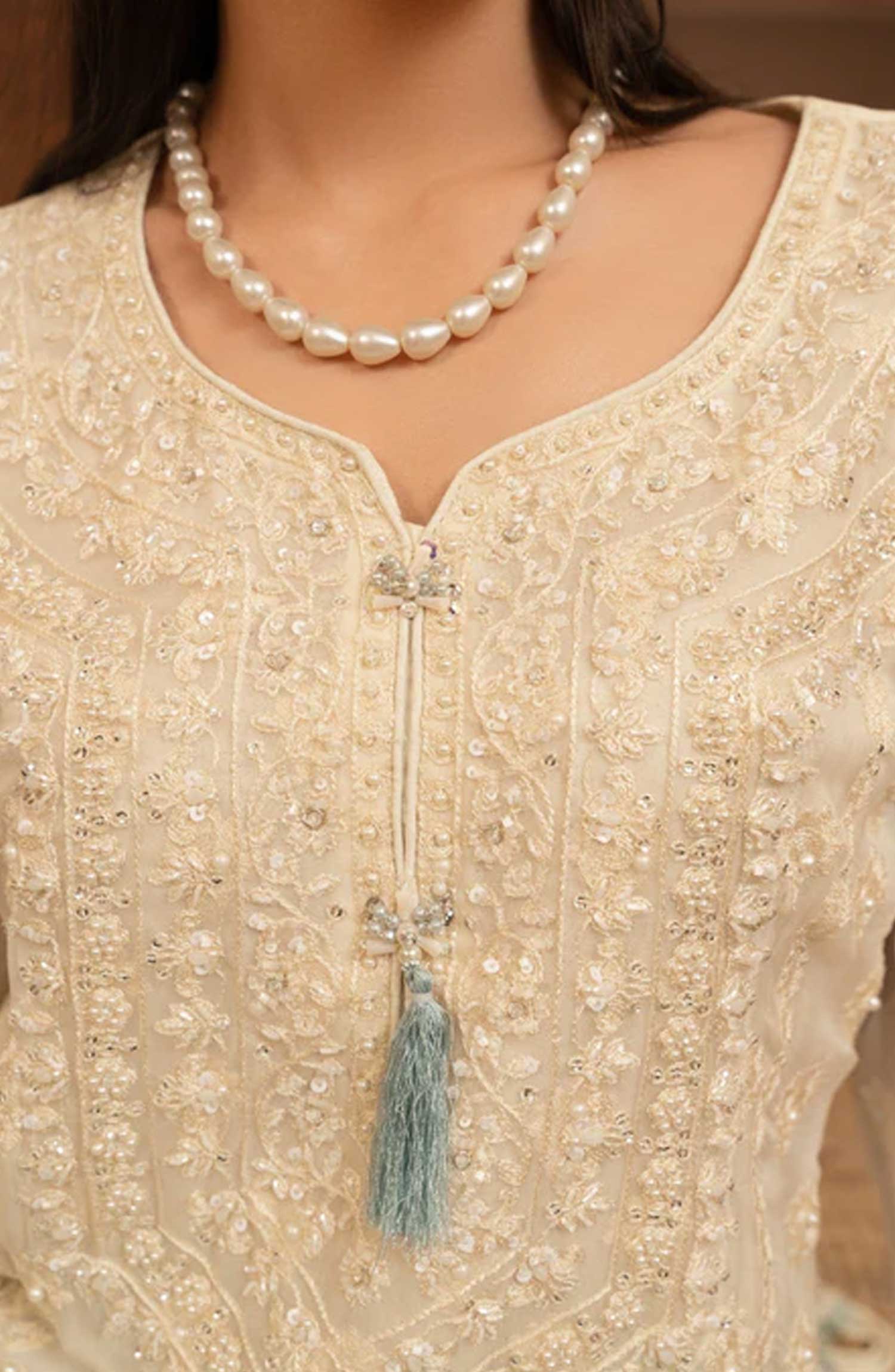 1-Elevate your style with our exquisite chiffon sequin embroidered shirt, featuring handcrafted work and pearl embellishments.