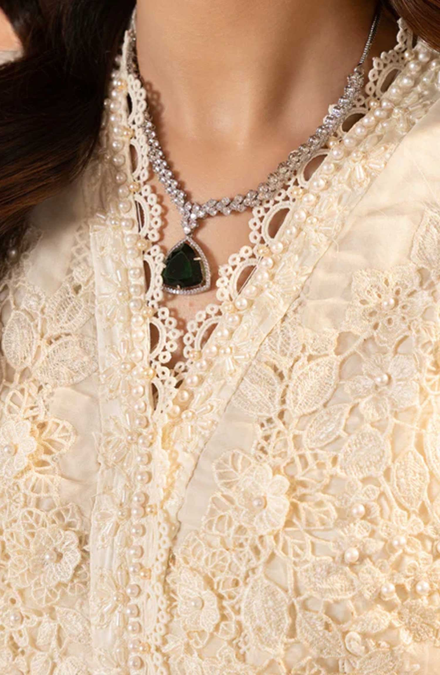 2-The shirt is beautifully complemented by an organza self-print dupatta adorned with pearls and a four-sided border lace.