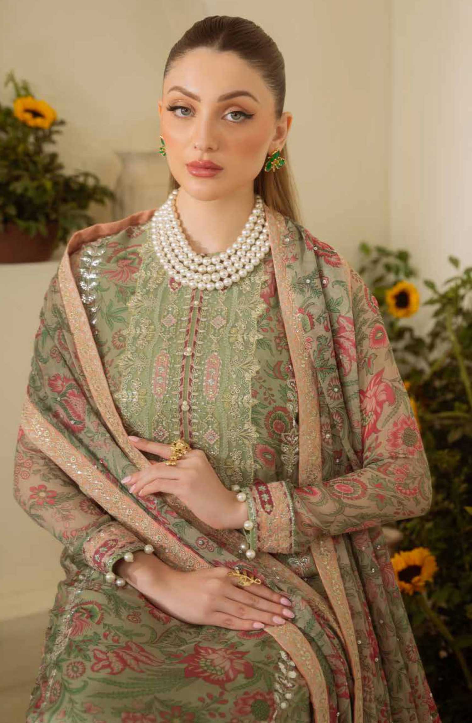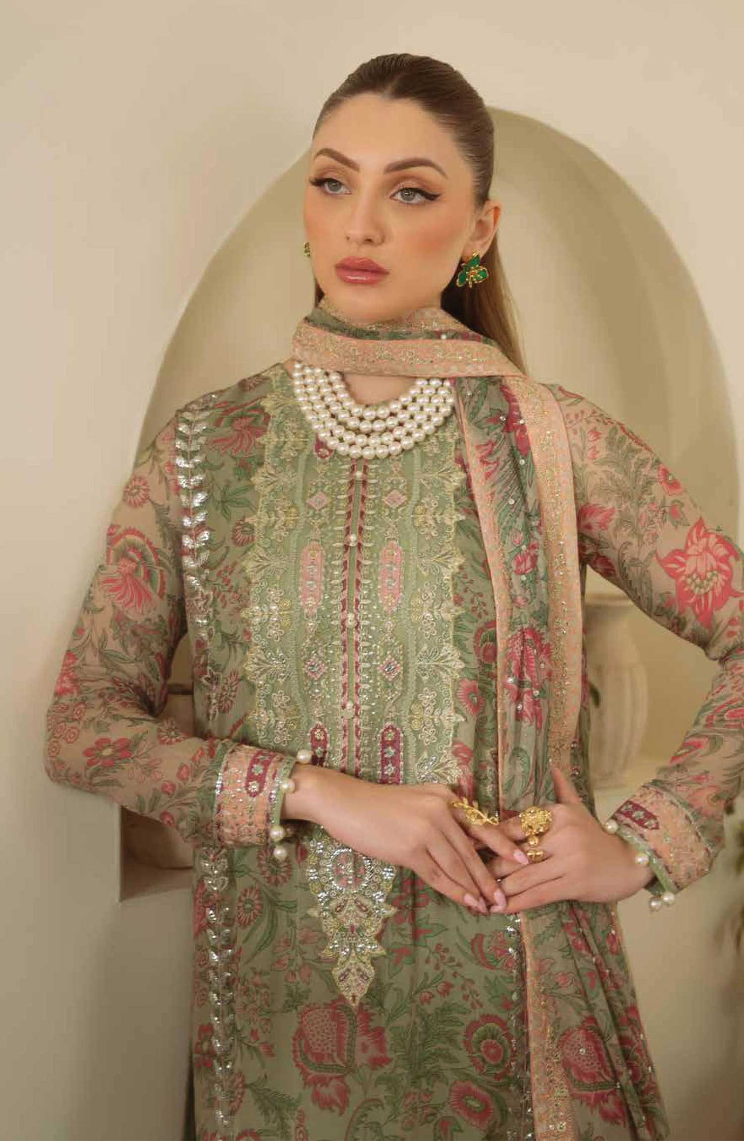 Nureh Amaya Luxury Prints Unstitched Chiffon Collection has been styled in the image for photography and illustrative purposes.