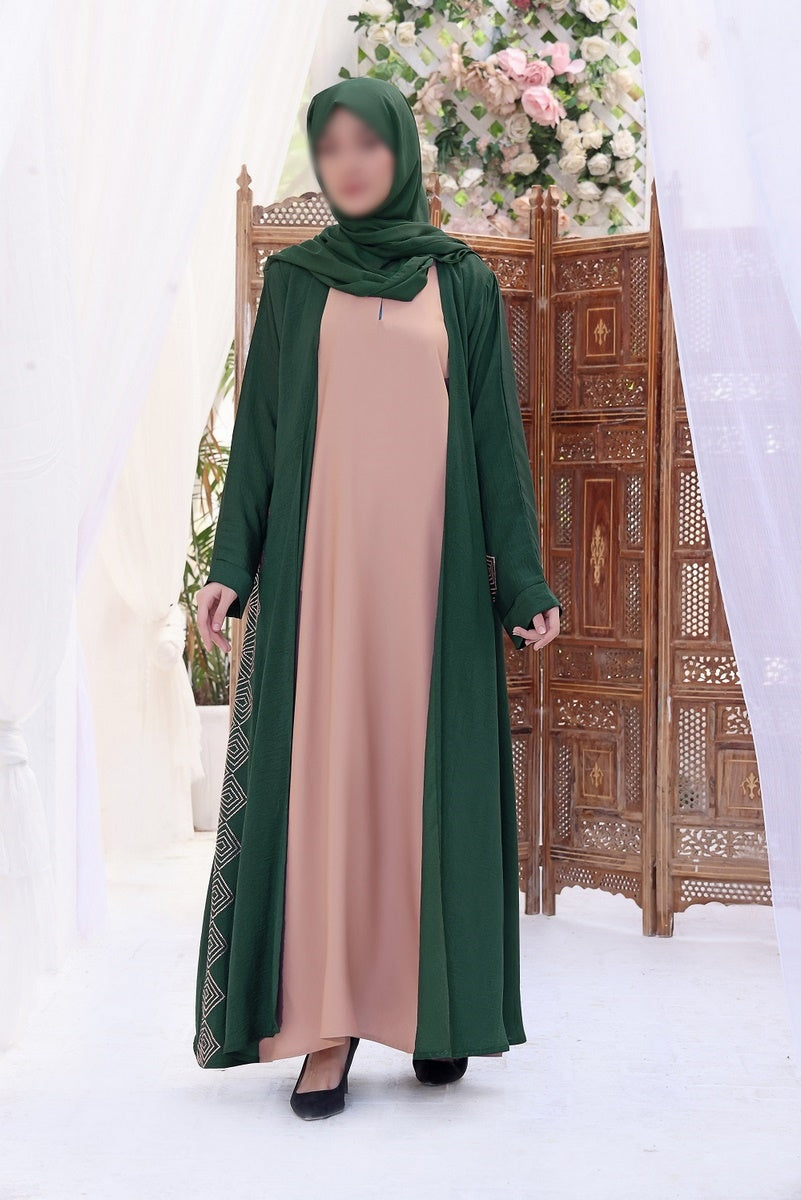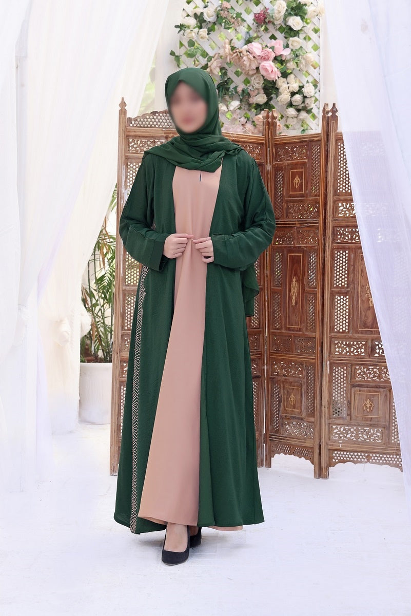 Delve in the world of abayas, cover yourself with our effortless coat style abaya beautiful stone work on sleeves and sides which is making it overall gorgeous comfortable to wear in every event constructed on pure Korean Dubai premium nidha comes along with pure Korean dyed chiffon Sheila
