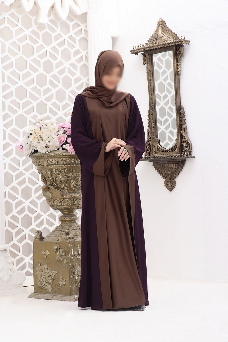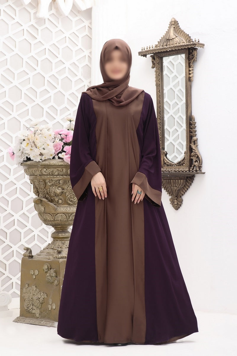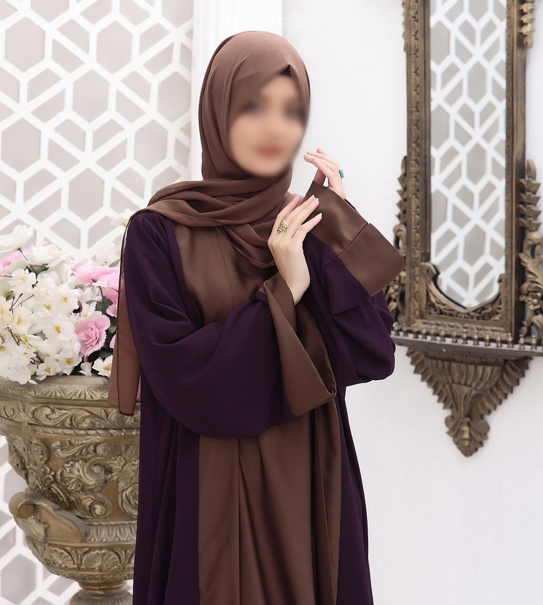 An aura of luxury, constructed on fine premium Dubai fabric coat style which is a hit code these days, with purple coat and brown inner along with pure Korean chiffon Sheila