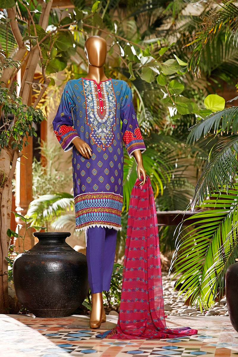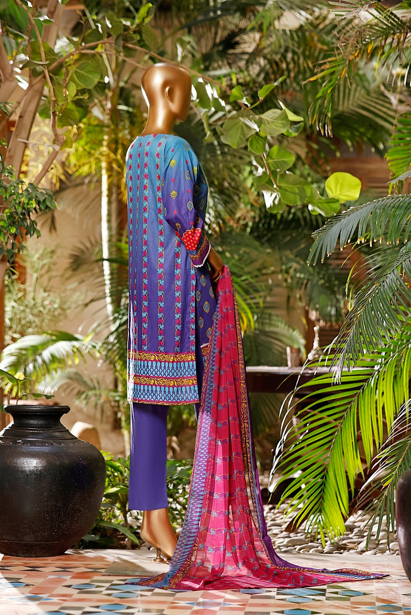 3 piece printed and Embroidered Lawn suit with printed chiffon fabric for Dupatta and Dyed Cotton fabric for Trouser/Shalwar By Amna Khadija Diva Embroidered Lawn Vol 3