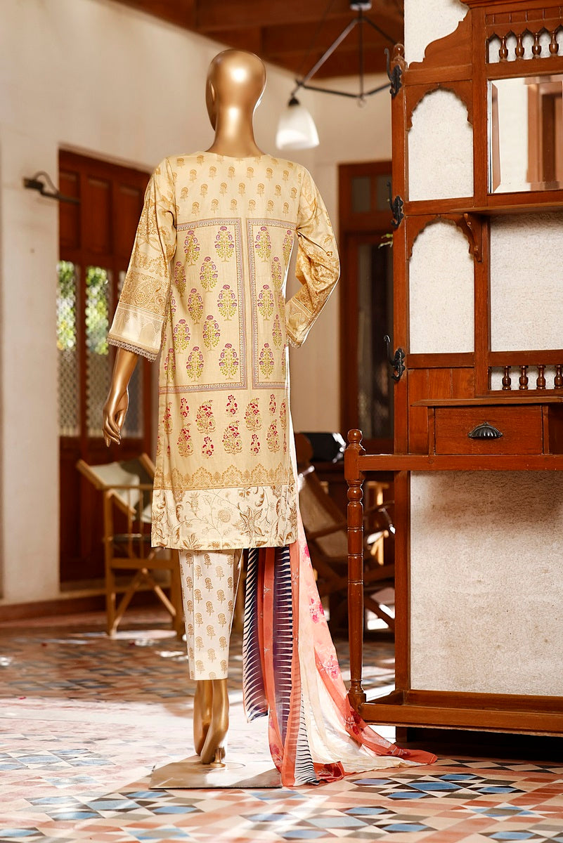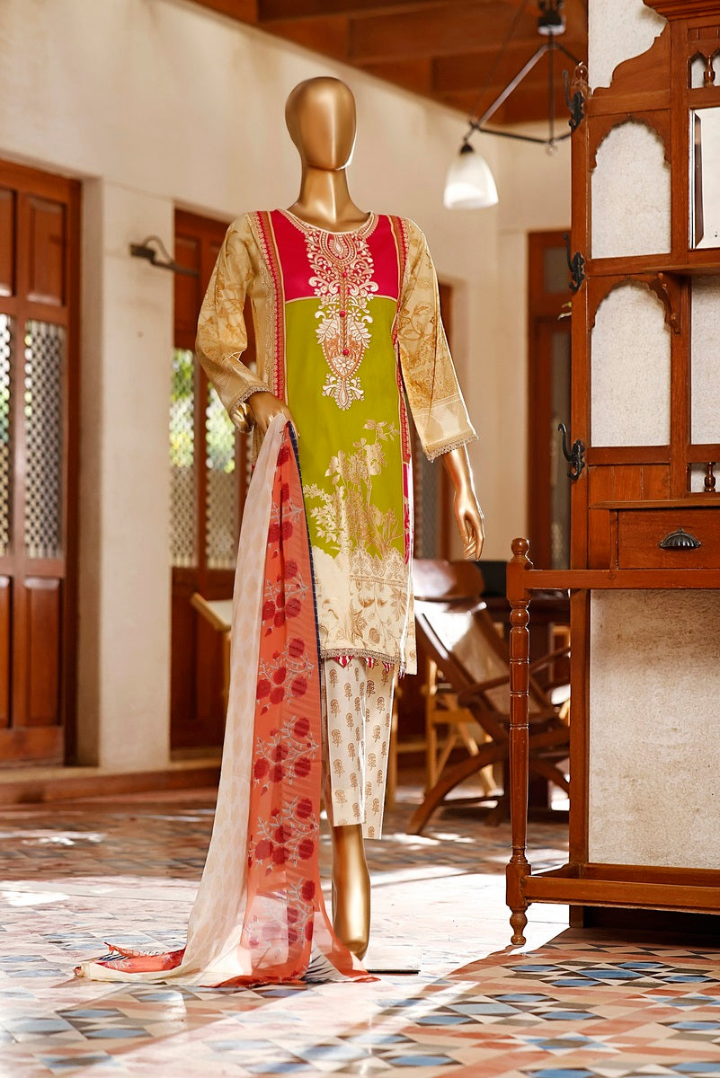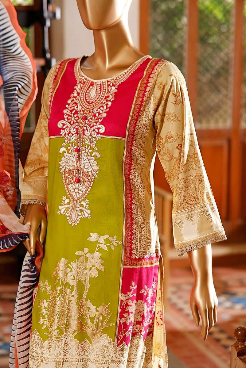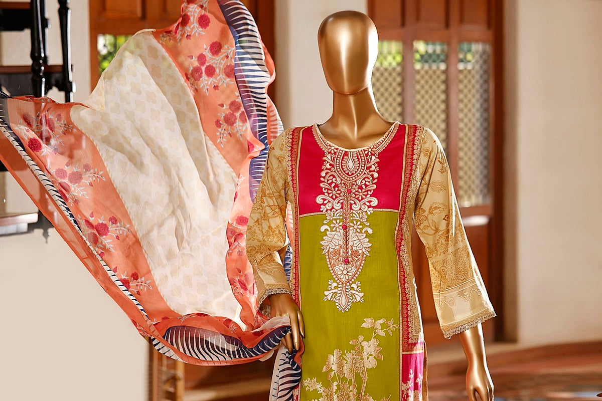 3 piece printed and Embroidered Lawn suit with printed chiffon fabric for Dupatta and Dyed Cotton fabric for Trouser/Shalwar By Amna Khadija Diva Embroidered Lawn Vol 3