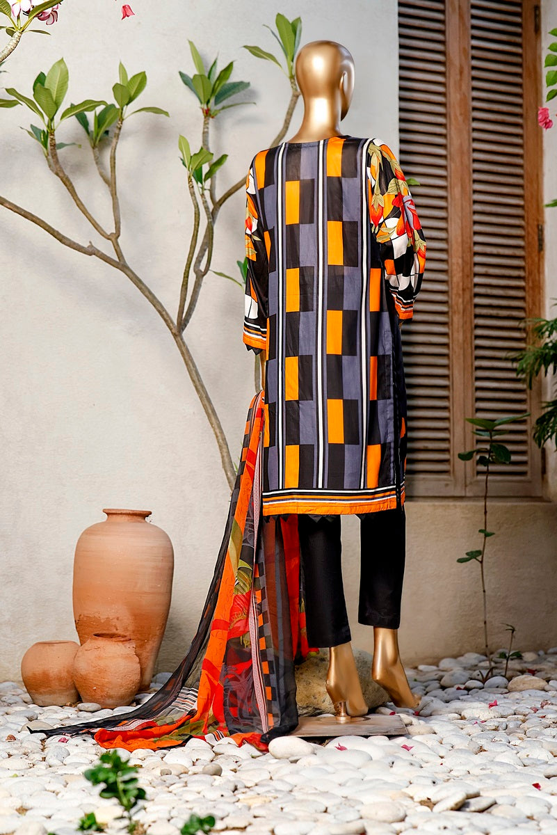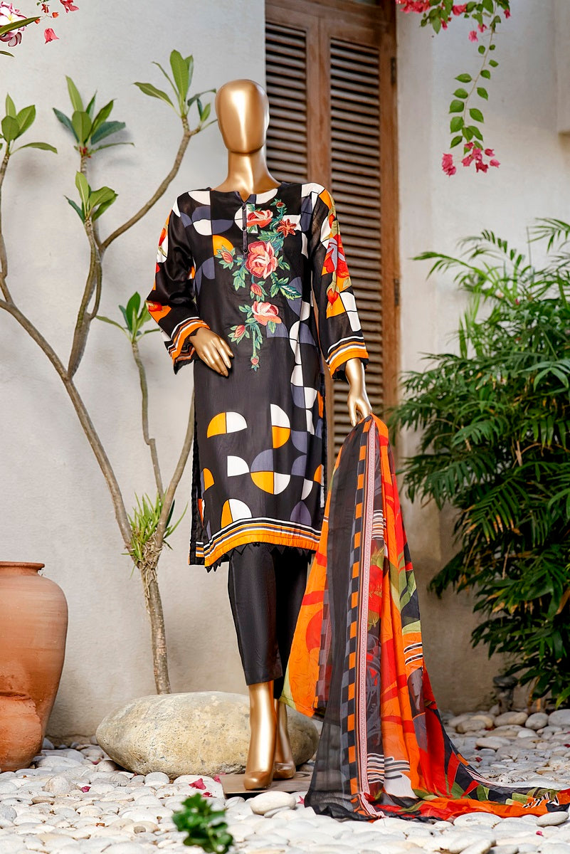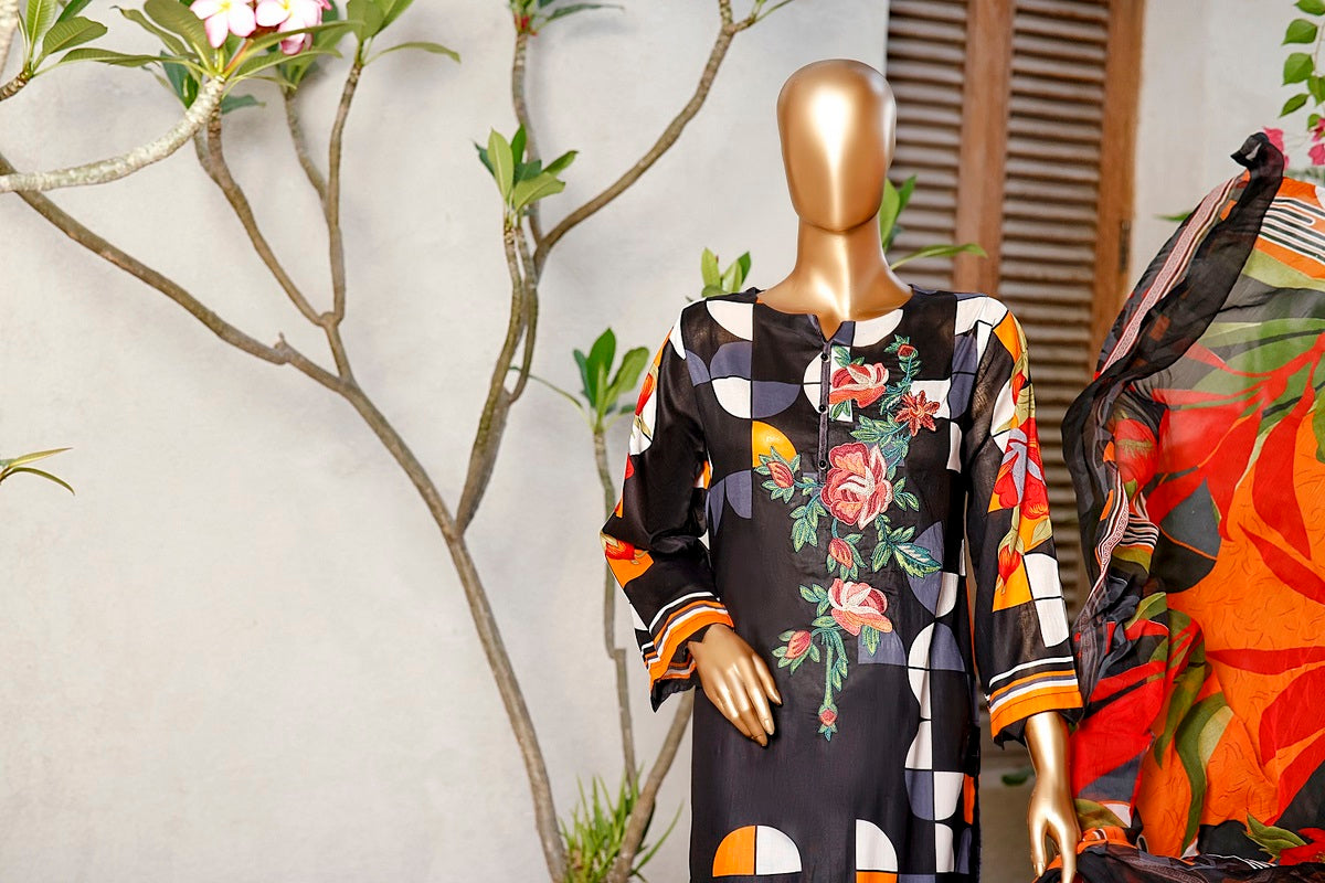 3 piece printed and Embroidered Lawn suit with printed chiffon fabric for Dupatta and Dyed Cotton fabric for Trouser/Shalwar By Amna Khadija Diva Embroidered Lawn Vol 3