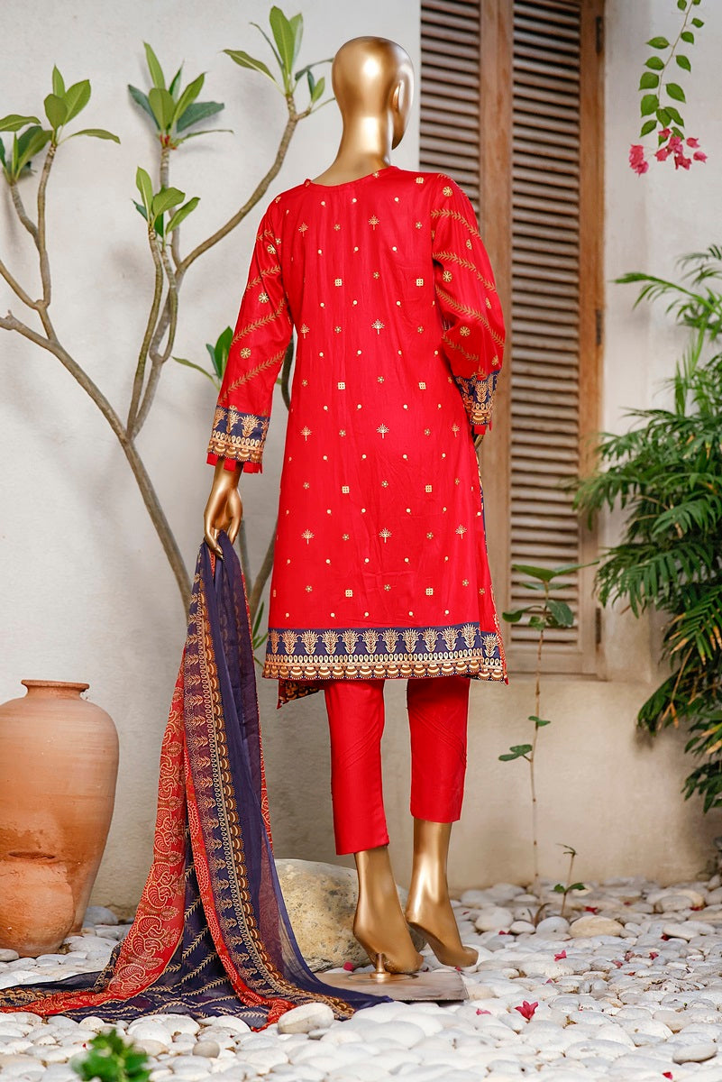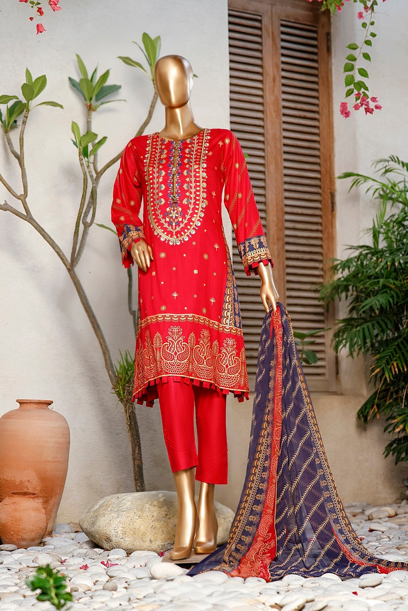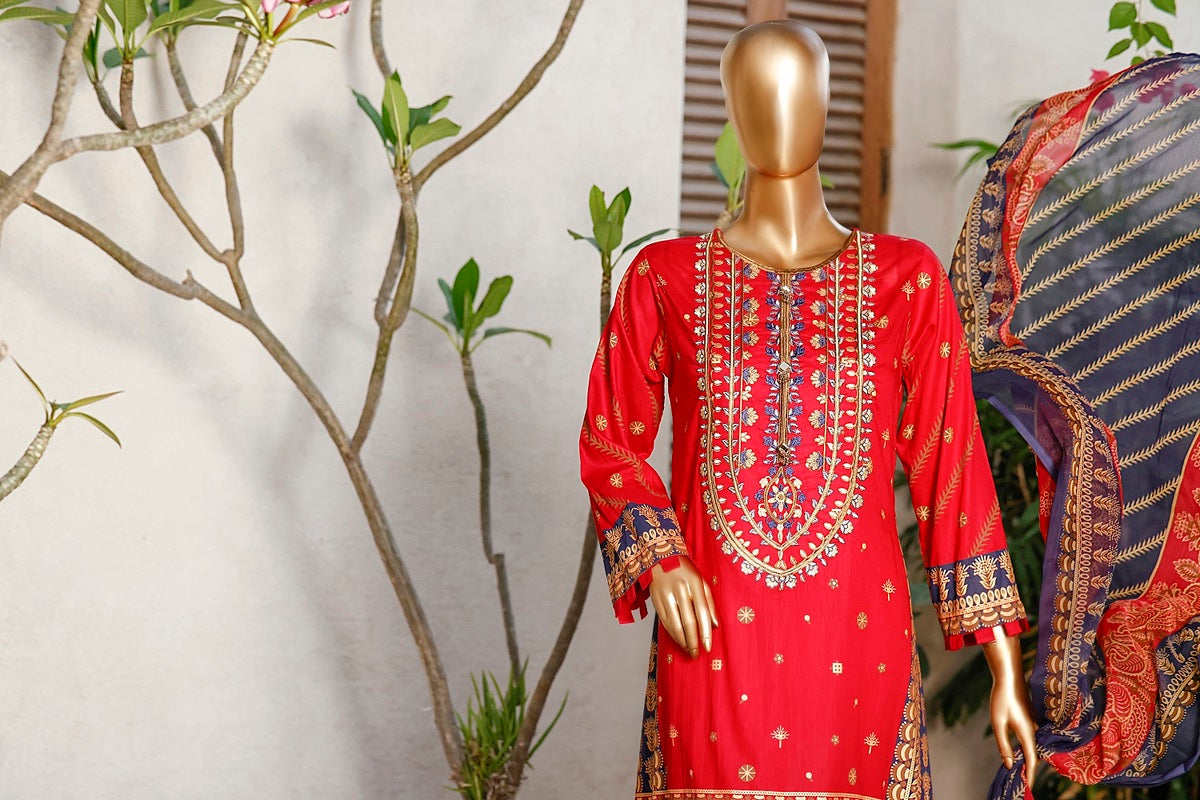 3 piece printed and Embroidered Lawn suit with printed chiffon fabric for Dupatta and Dyed Cotton fabric for Trouser/Shalwar By Amna Khadija Diva Embroidered Lawn Vol 3