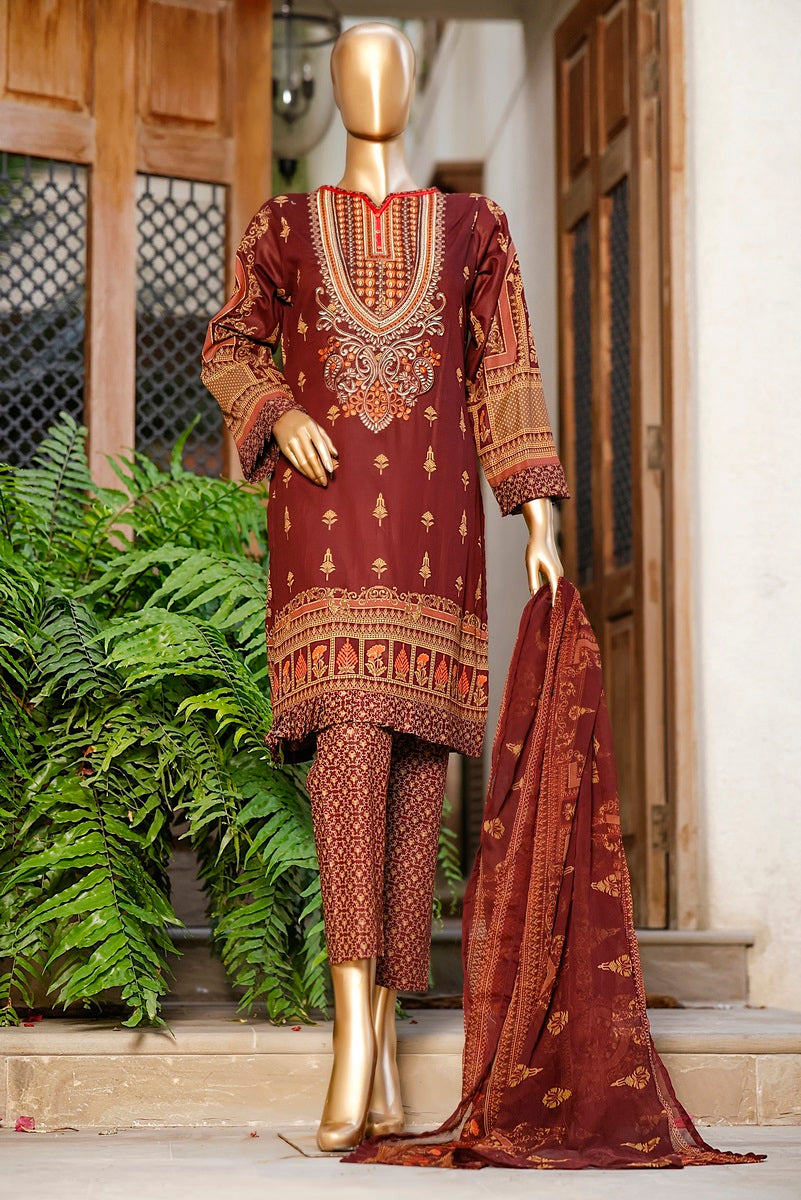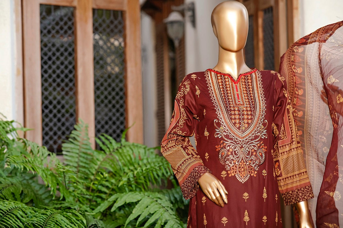 3 piece printed and Embroidered Lawn suit with printed chiffon fabric for Dupatta and Dyed Cotton fabric for Trouser/Shalwar By Amna Khadija Diva Embroidered Lawn Vol 3