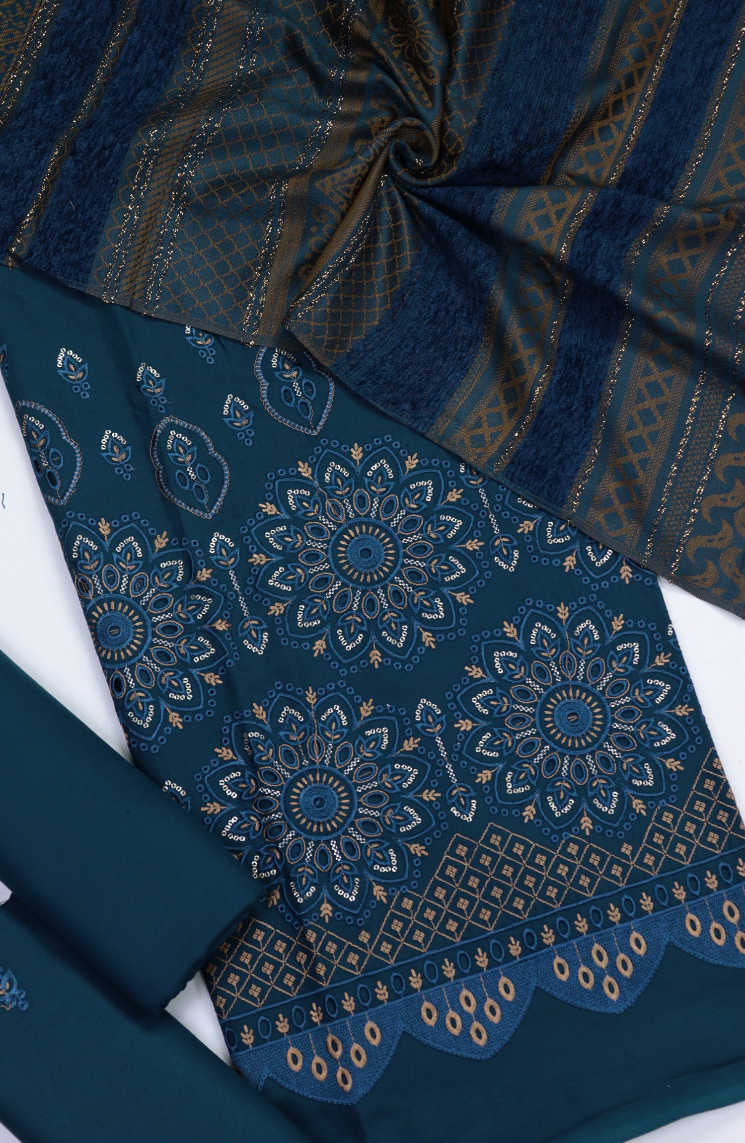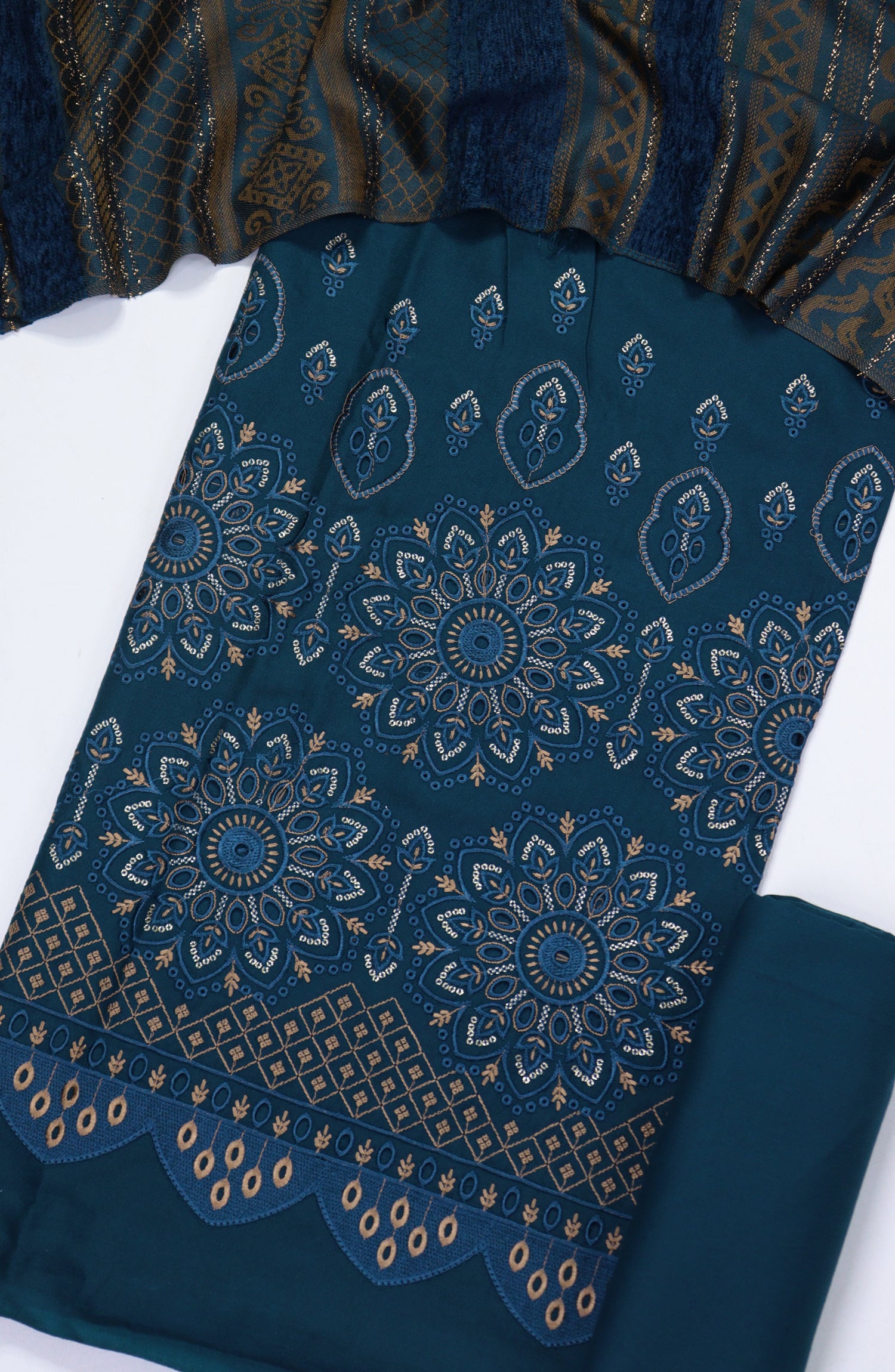 Embroidered Dhanak Chikankari Unstitched 3 Piece Suit with Jacquard Banarsi Wool Shawl