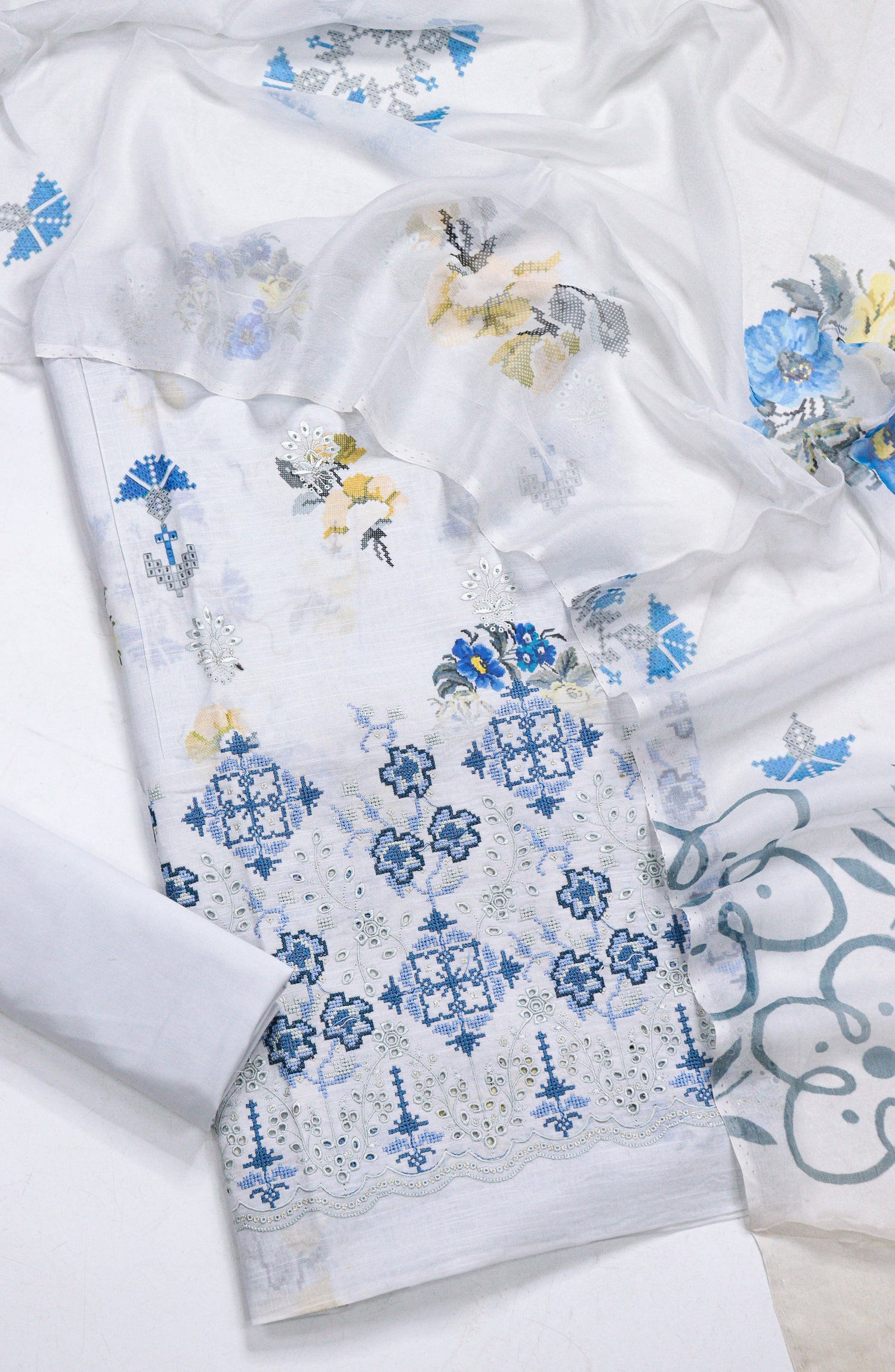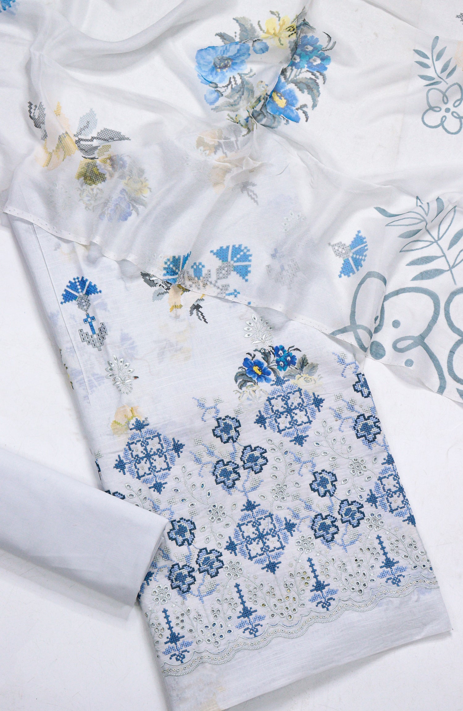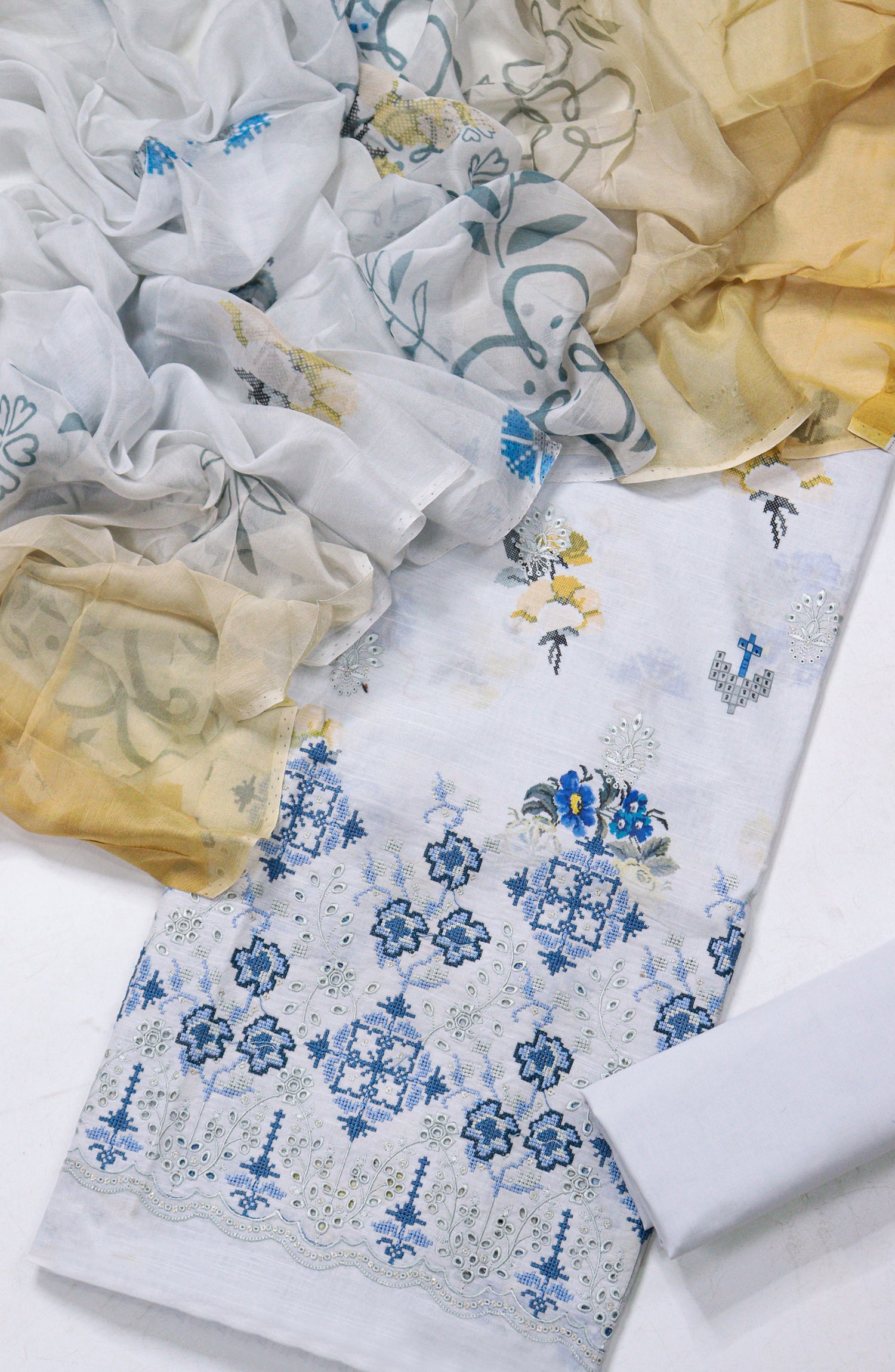 Premium Lawn Slub Printed with Elegant Daman Embroidery Shirt with Finest Quality Bamber Printed Dupatta & Premium Dyed Trouser