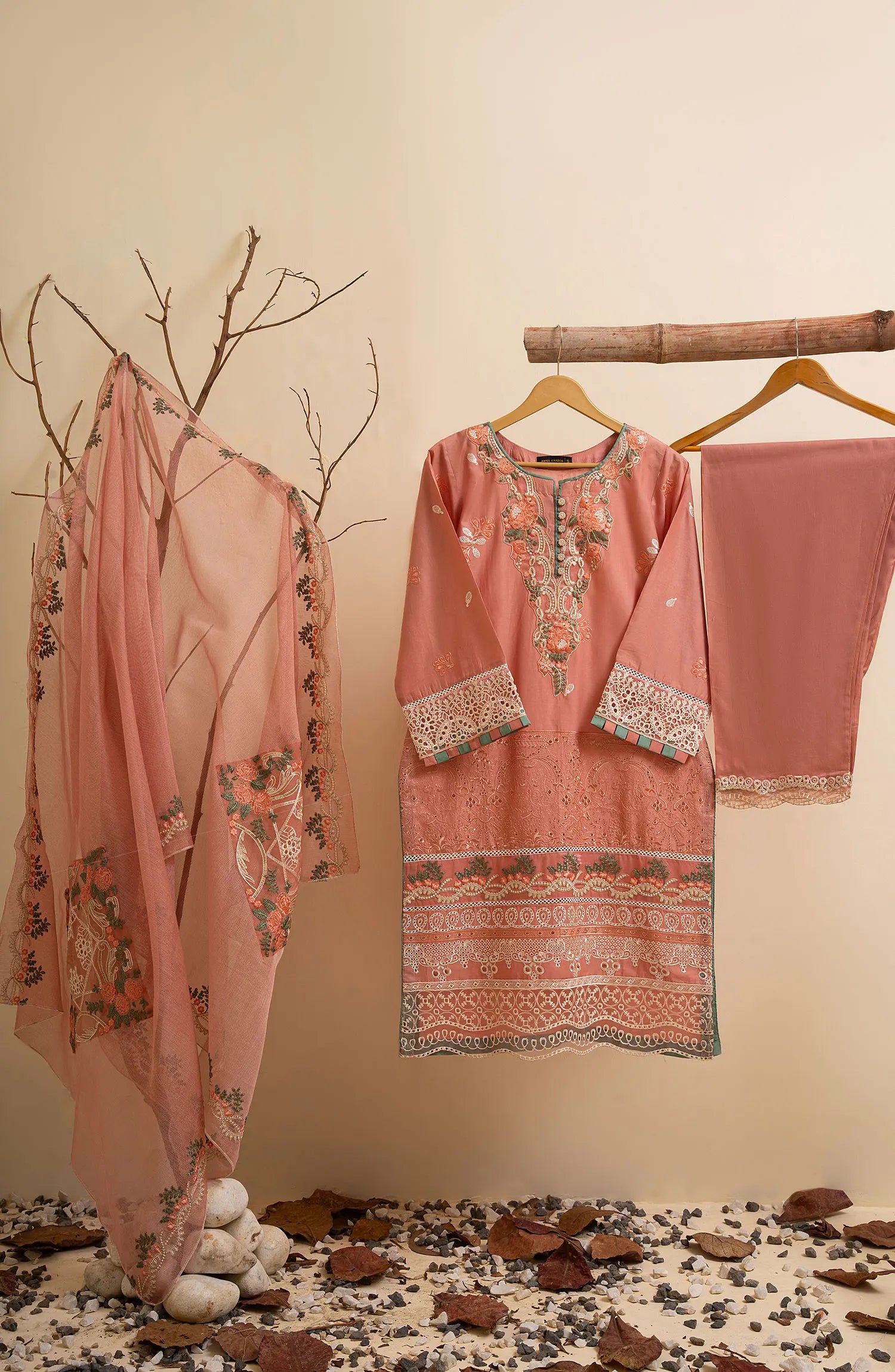 Amna Khadija Mahlaka Festive Formal Collection 2024 has been styled in the image for photography and illustrative purposes.