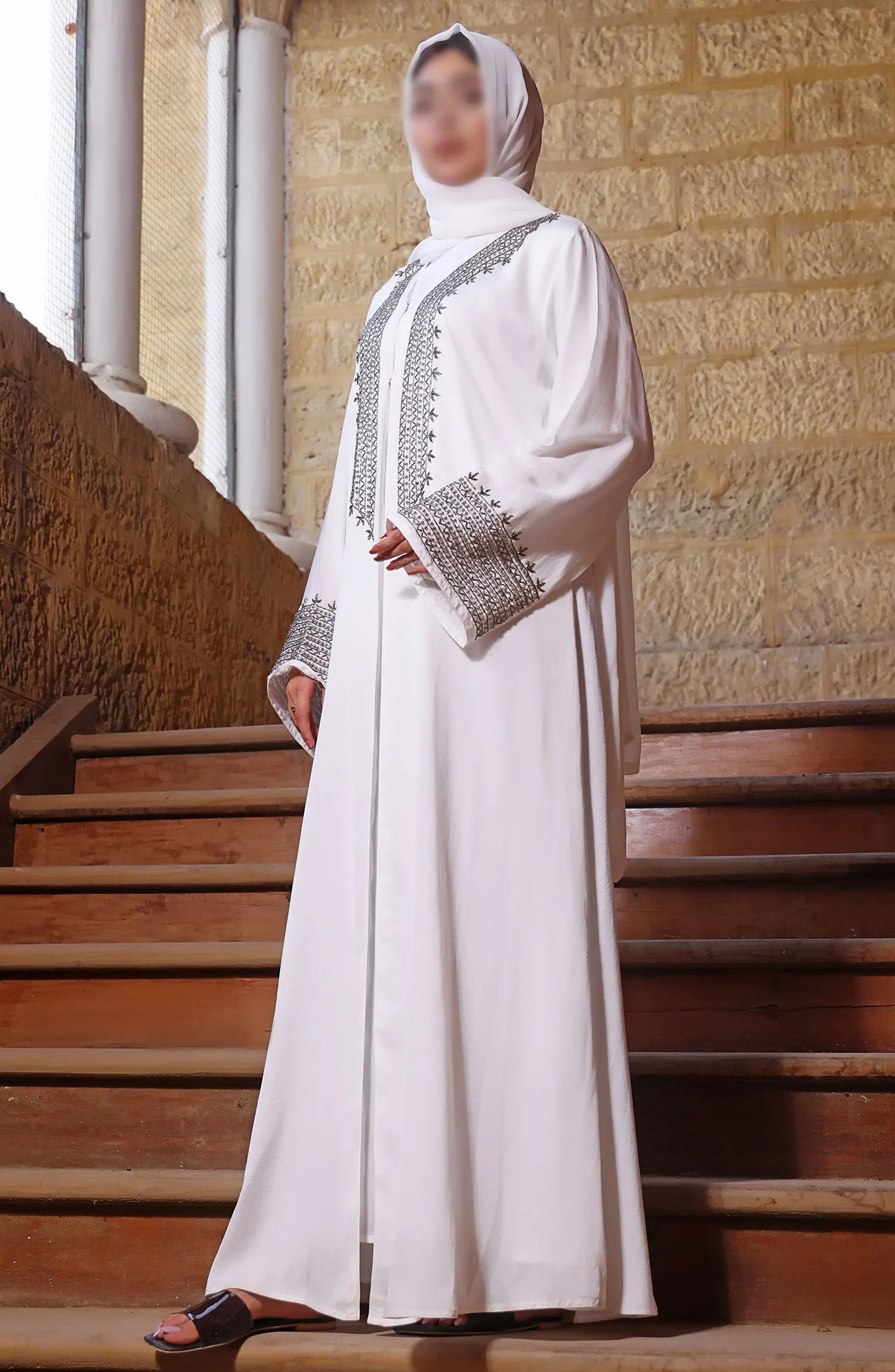 Our beautiful front open style is constructed on imported fabric which is soft and durable, fabric manipulation is done on bodice with embroidery on front and sleeves making it flouncy and elegant, comes along with White Korean chiffon Sheila