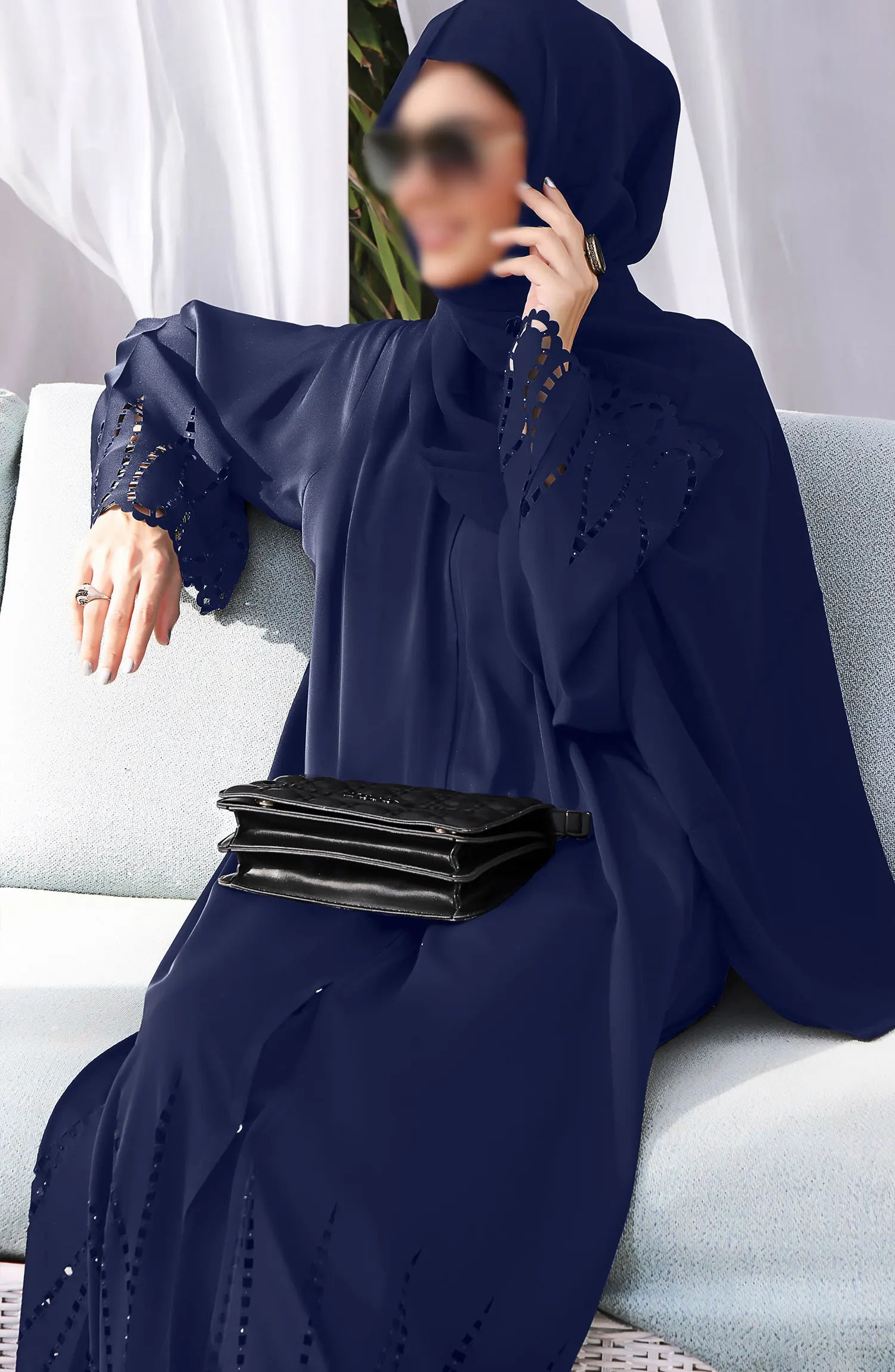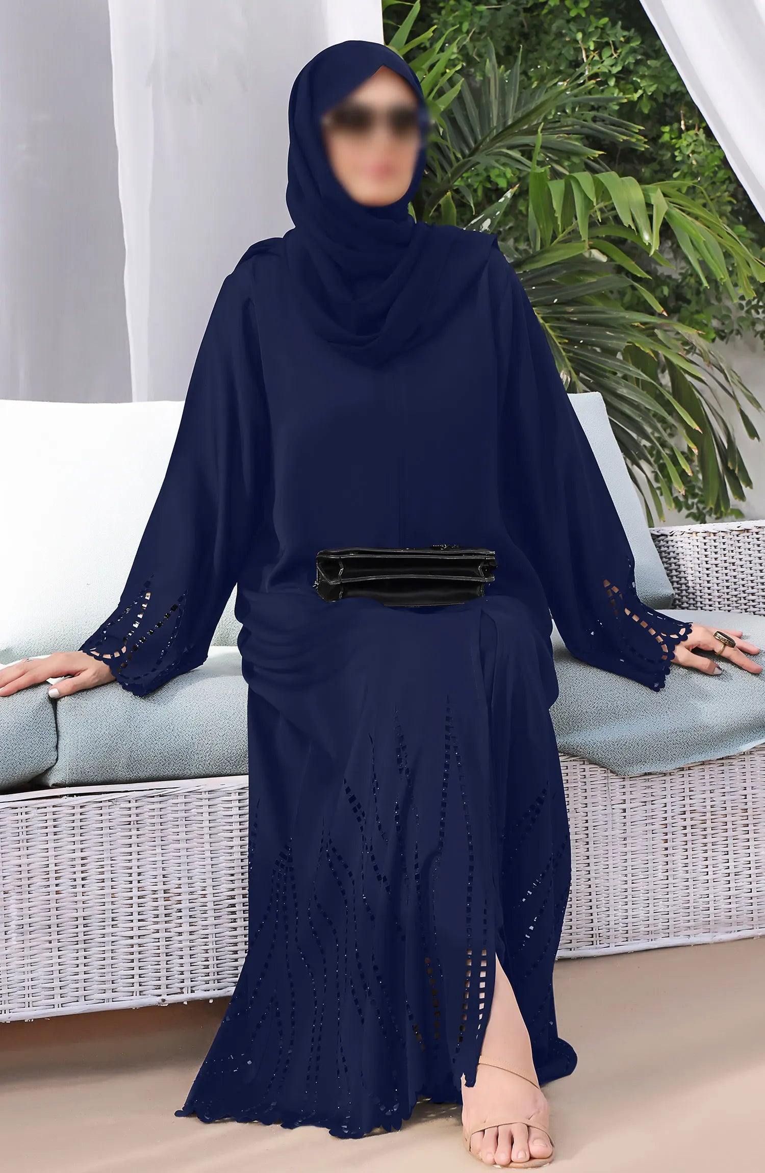 When looking for something Classy and Unique, our beautiful laser cut with stone Work Abaya is gorgeous yet elegant with cutwork on sleeves and paired with pure Korean Nidha Hijab.