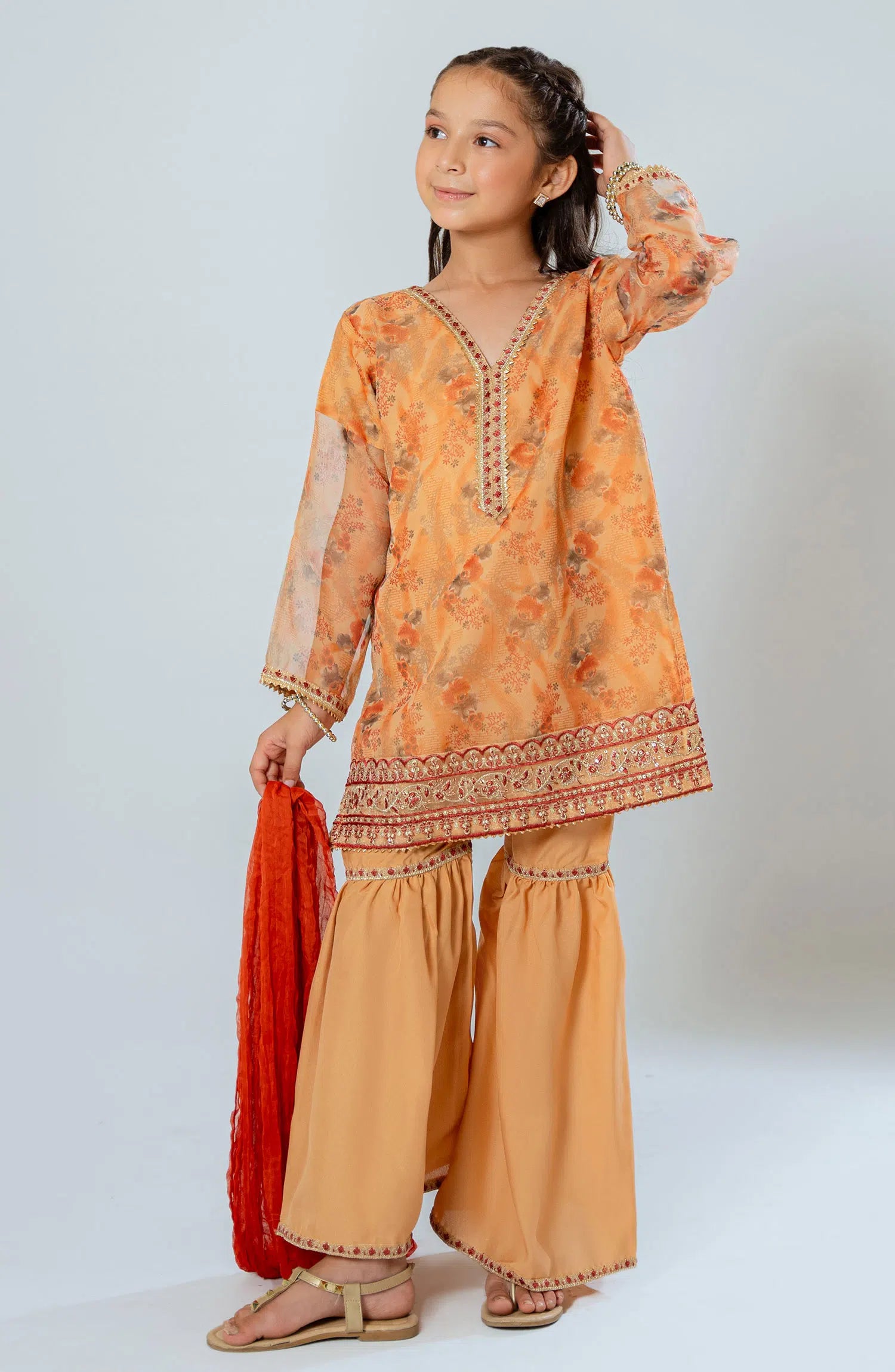 Printed organza with embroidery work with garara malai and contrast dupatta.
