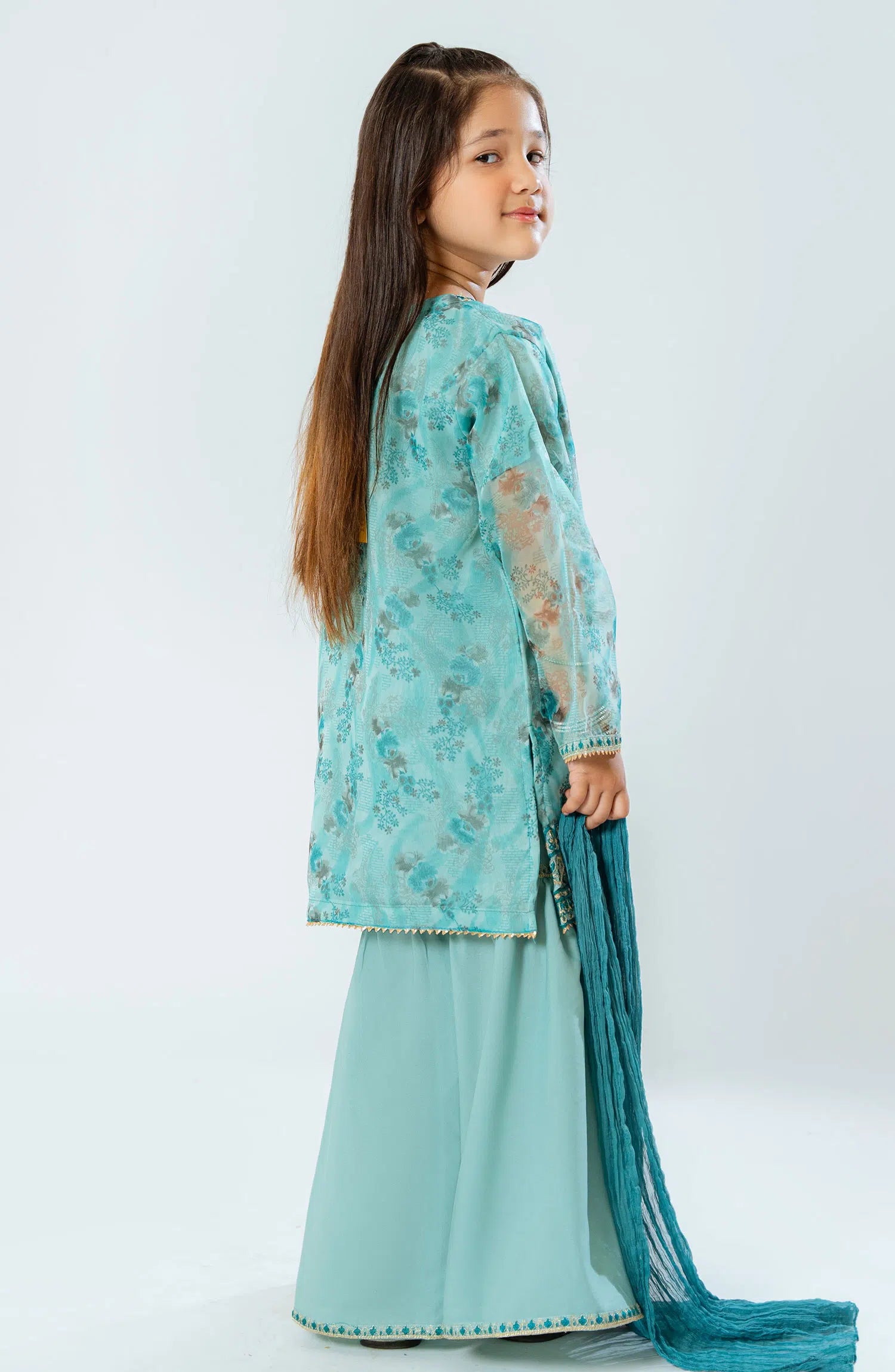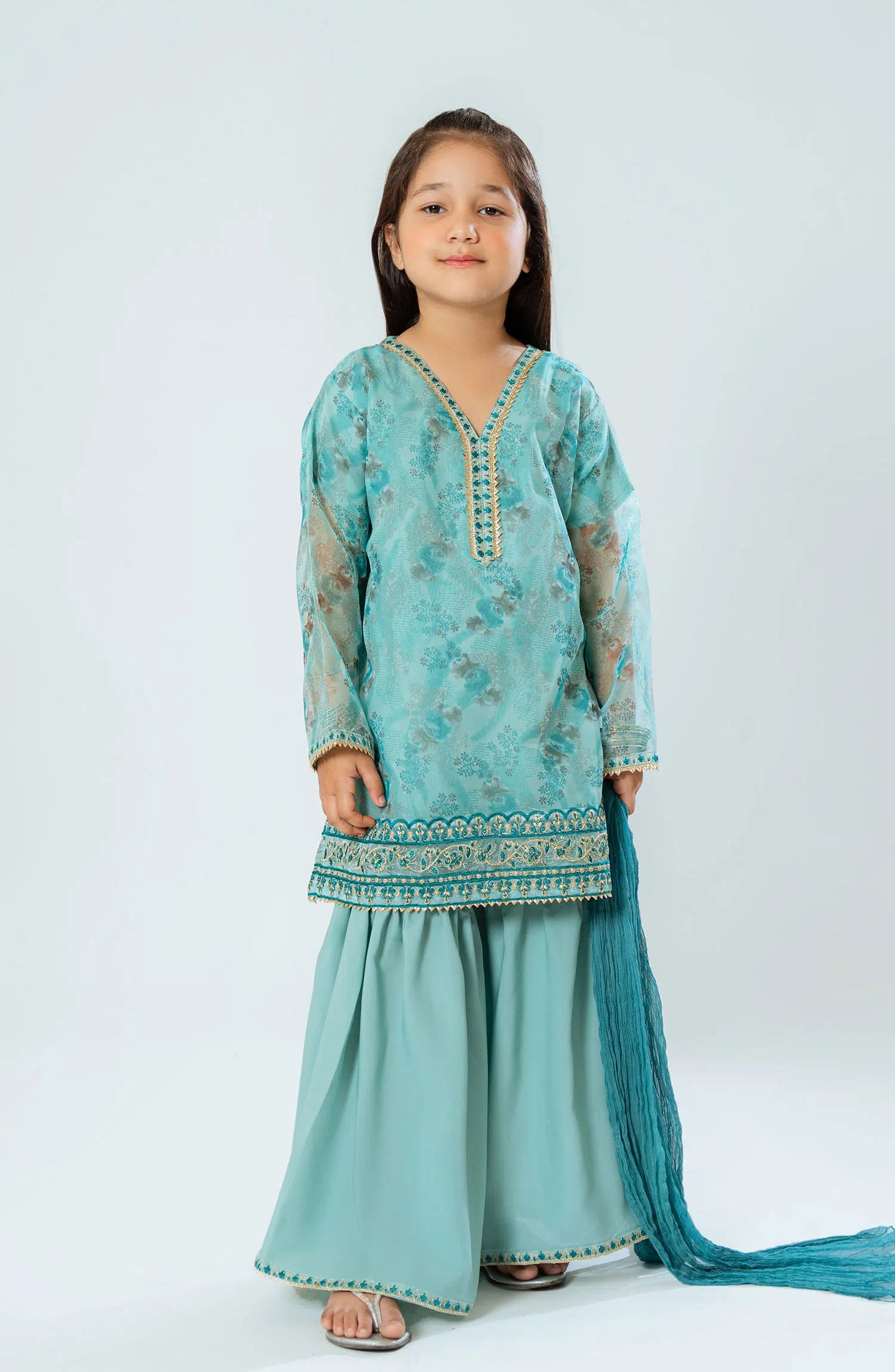 Printed organza with embroidery work with garara malai and contrast dupatta.