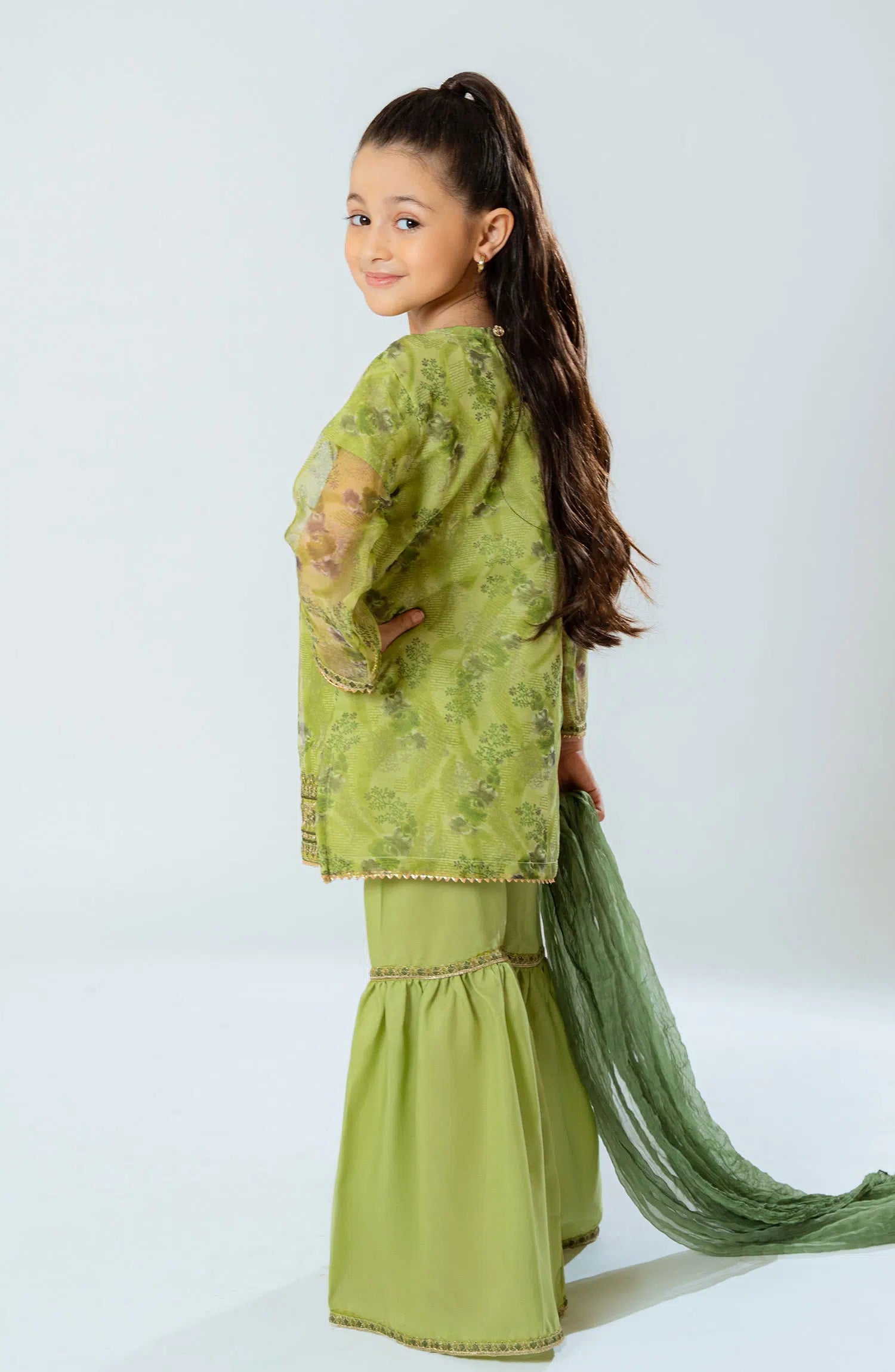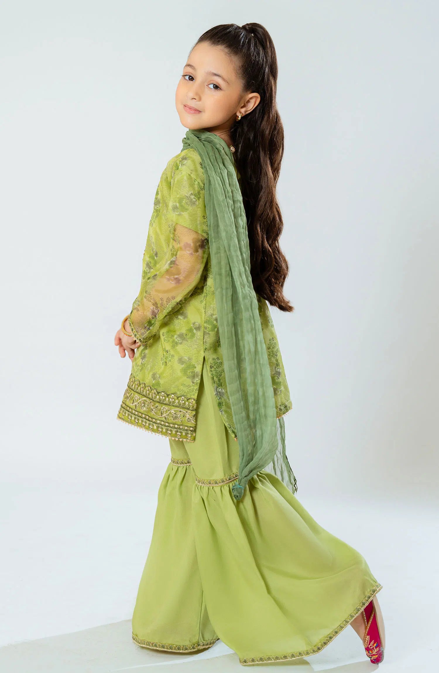 Printed organza with embroidery work with garara malai and contrast dupatta.