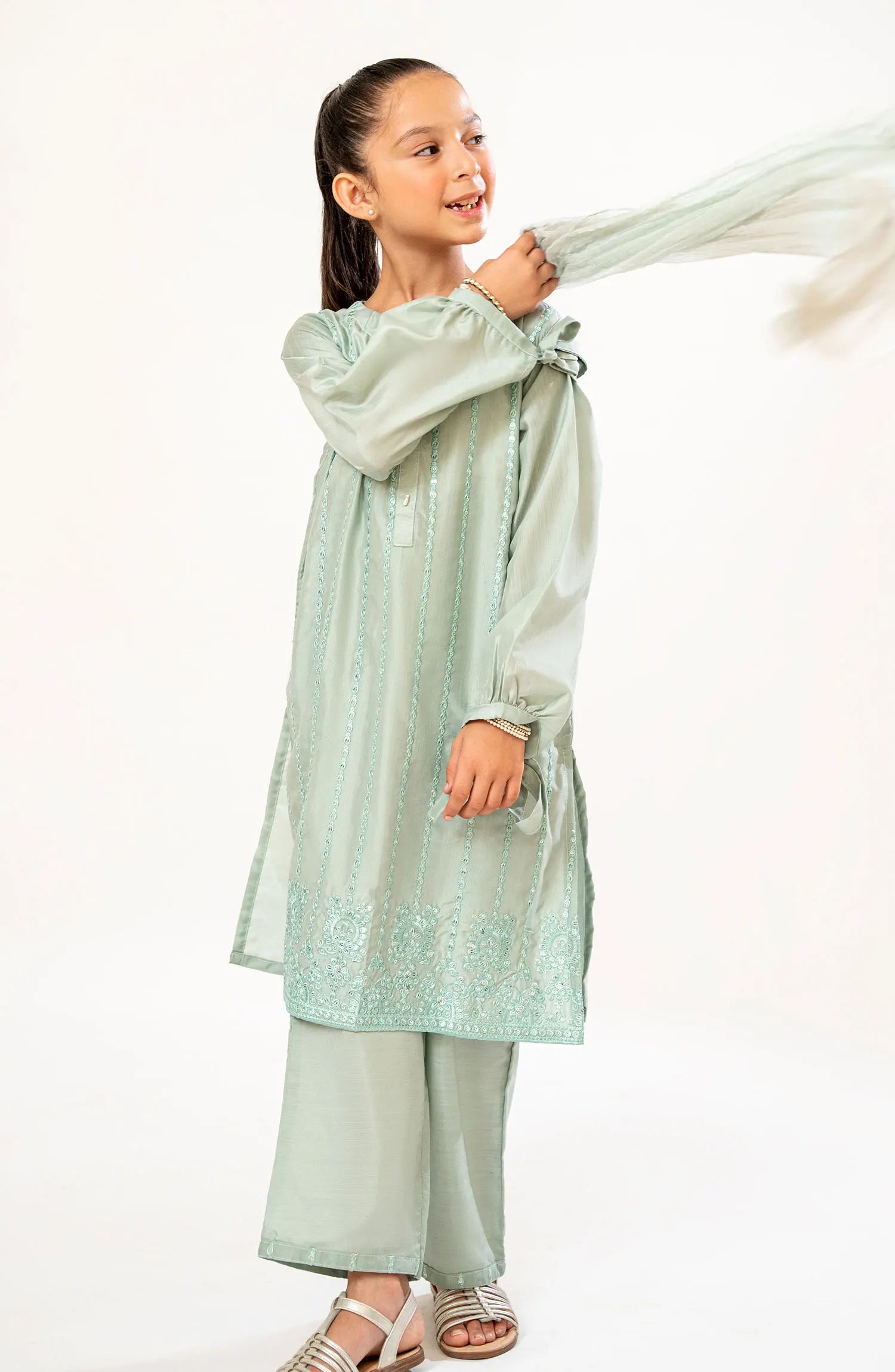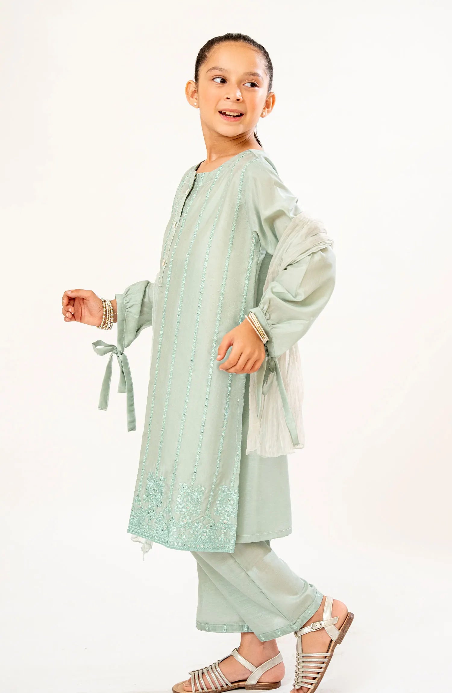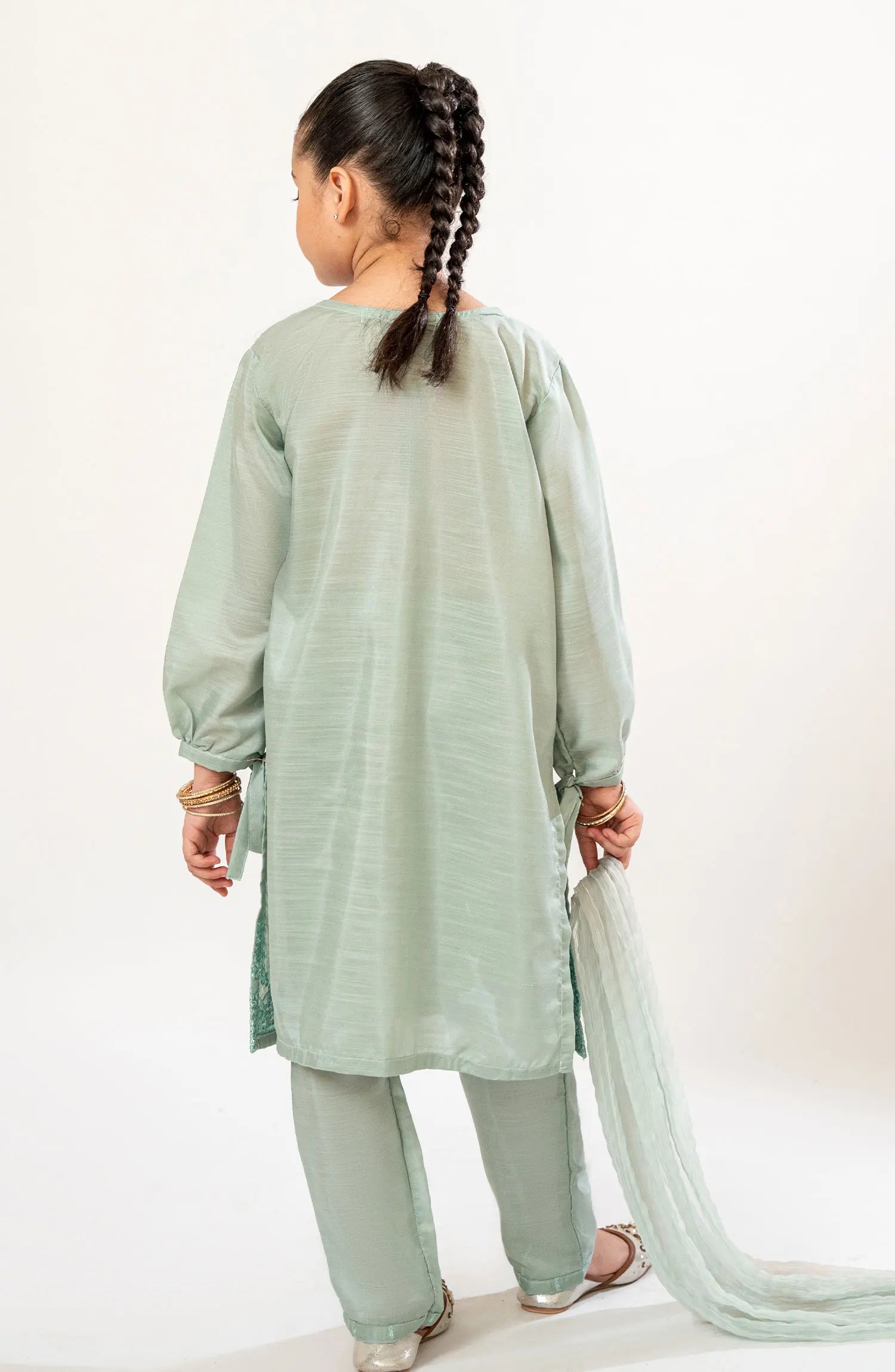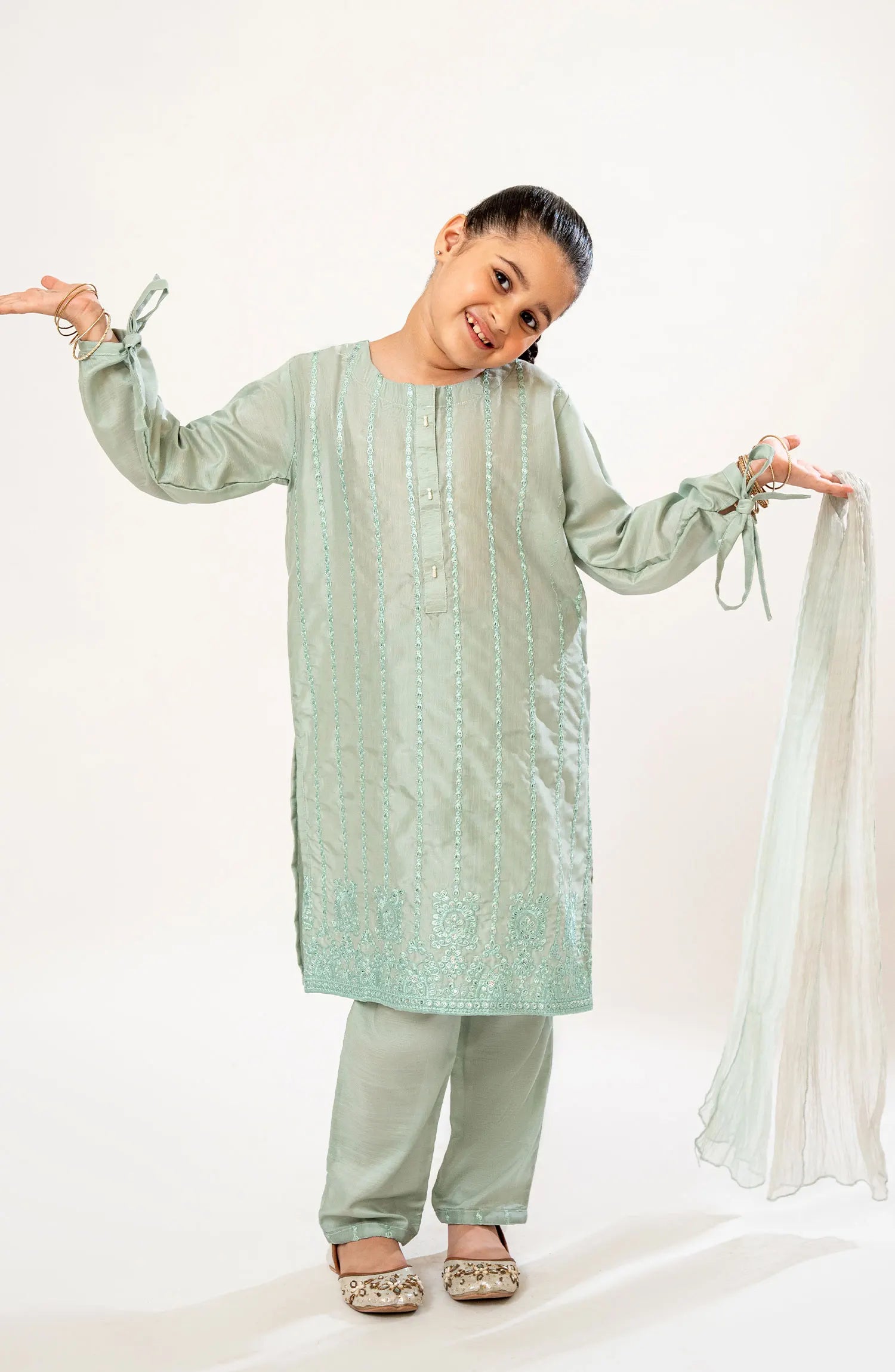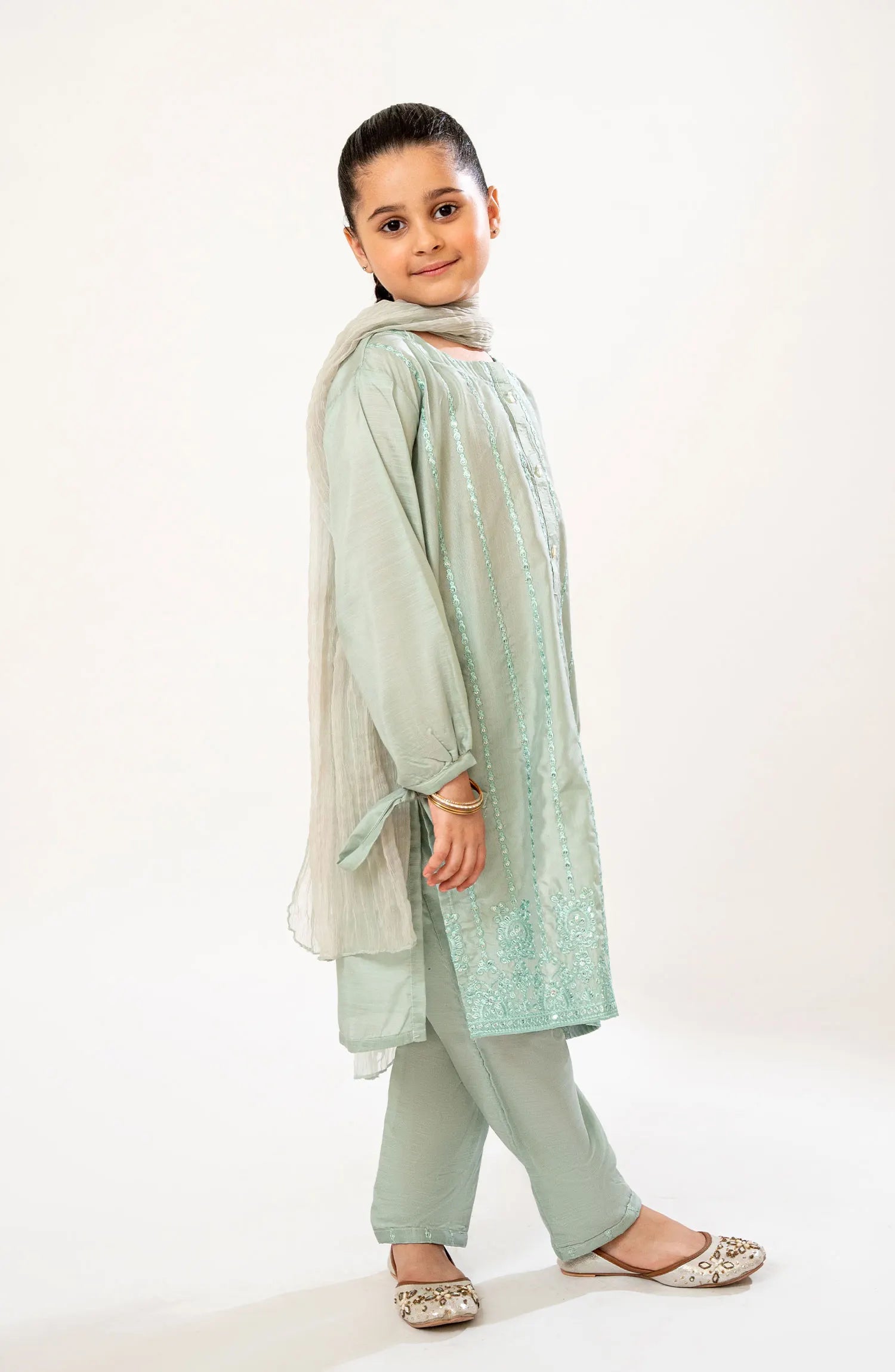 The standard style comes as a long-sleeved kameez with dupatta and trouser/shawlar.