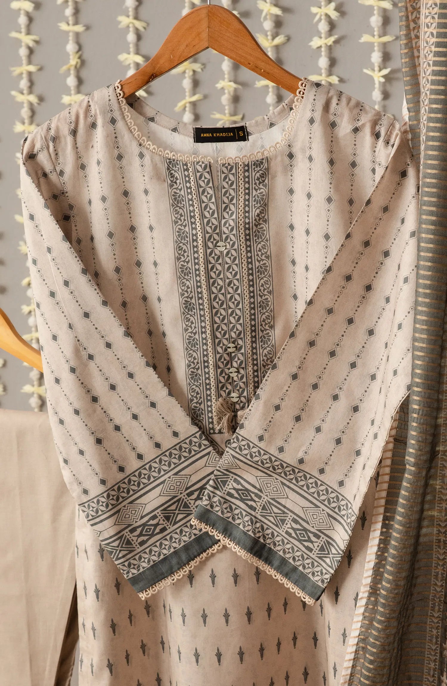 The standard style comes as a long-sleeved kameez with dupatta and trouser/shalwar.