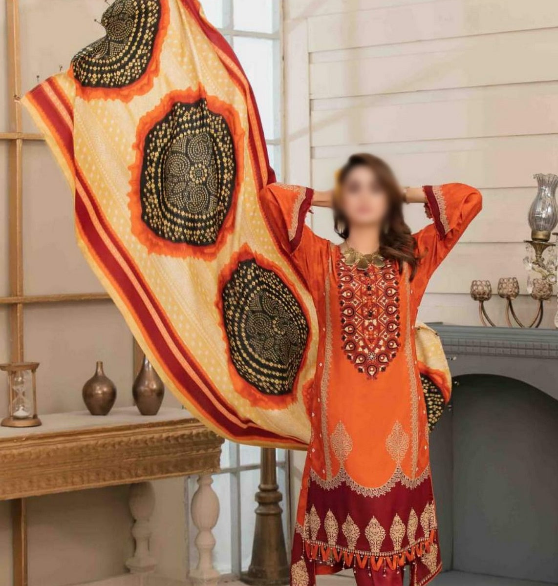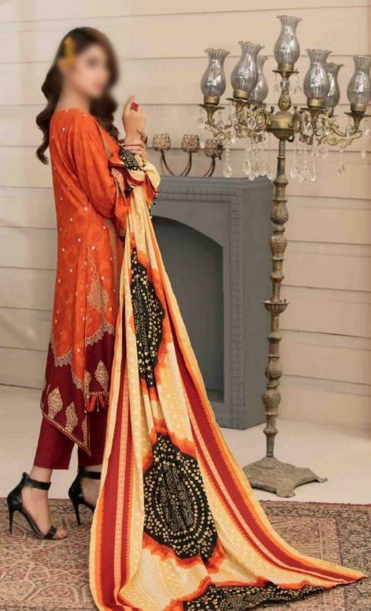The standard style comes as a long-sleeved kameez with dupatta and trouser/shalwar.