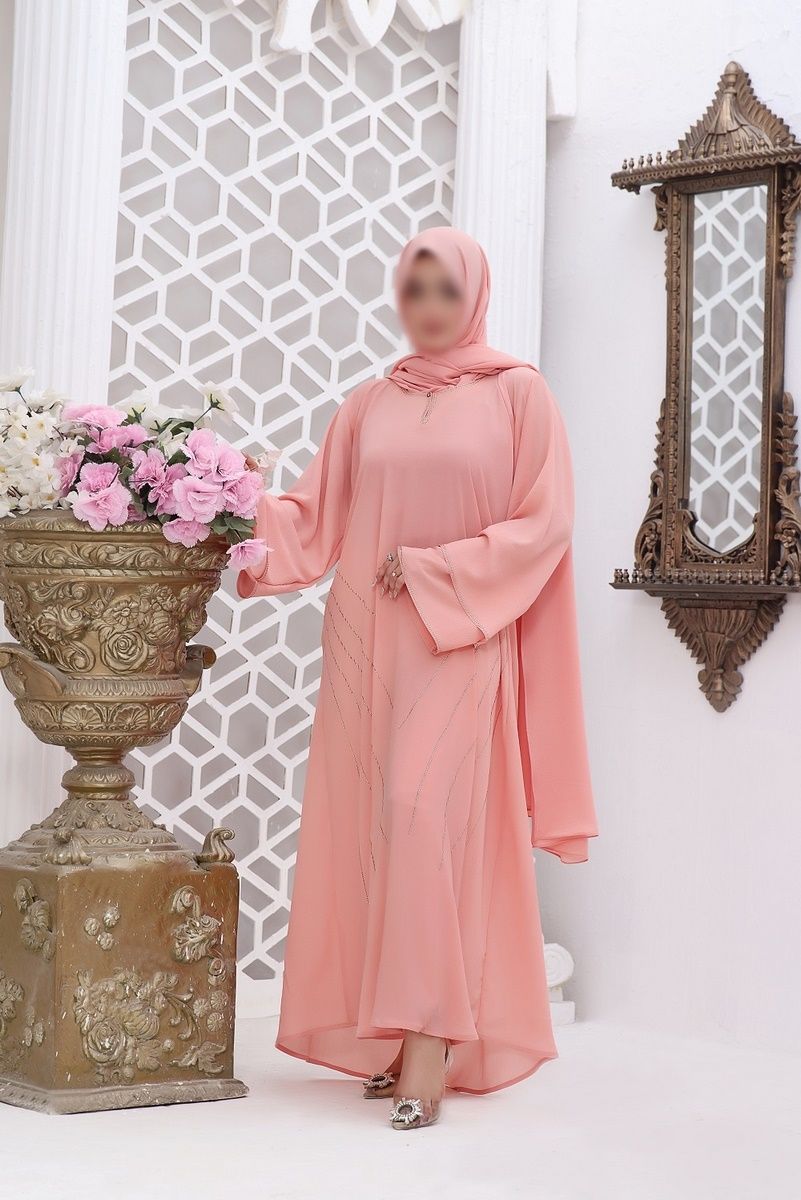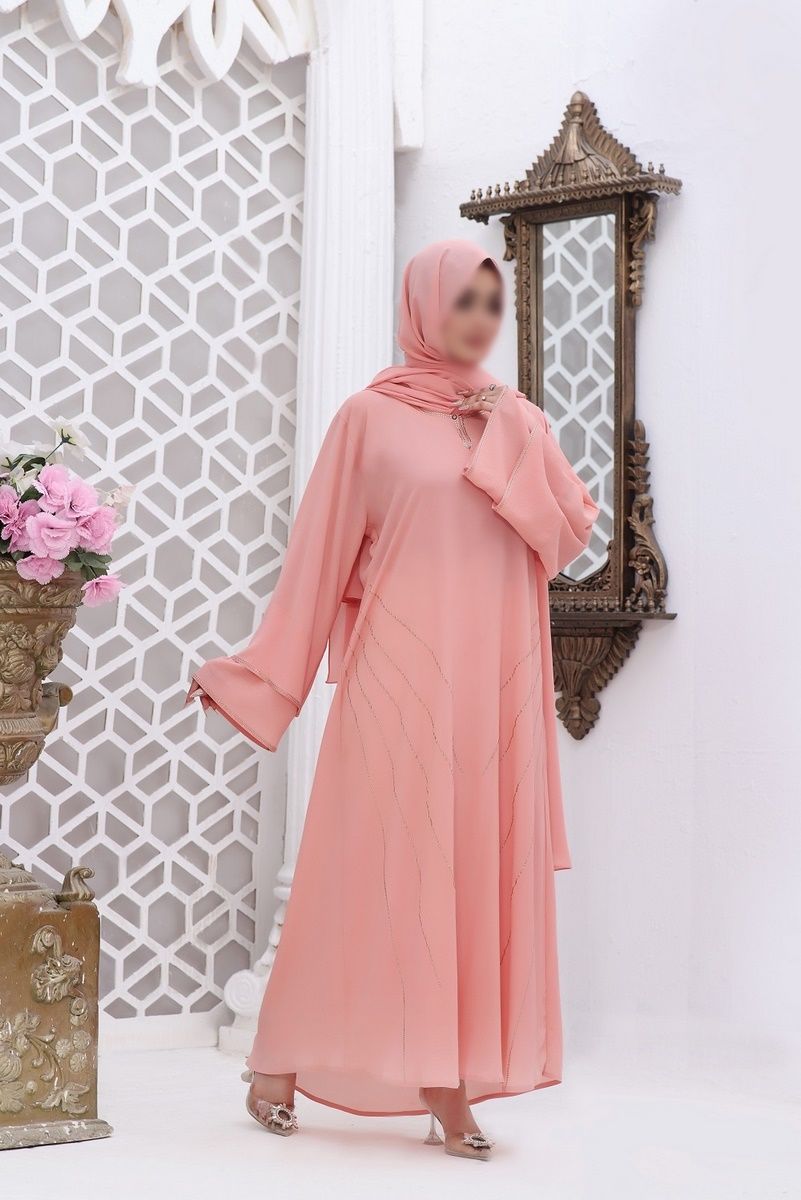 Our beautiful front closed maxi style is constructed on imported fabric which is soft and durable, stone work done on body with beautiful double bell stonework sleeves comes along with pure Korean dyed chiffon Sheila