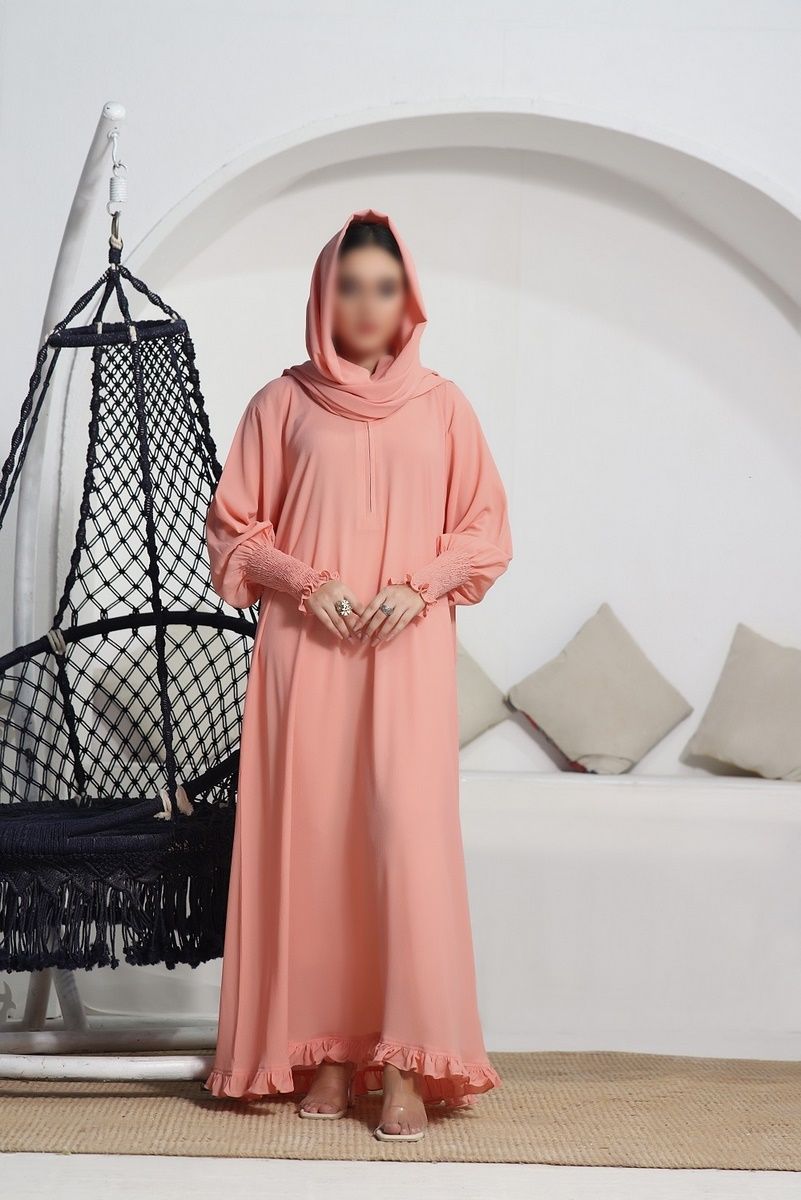 Our beautiful front closed maxi style is constructed on imported fabric which is soft and durable, fabric manipulation is done on bodice with elastic sleeves, and frill on bottom making it flouncy and elegant, comes along with pure Korean chiffon Sheila
