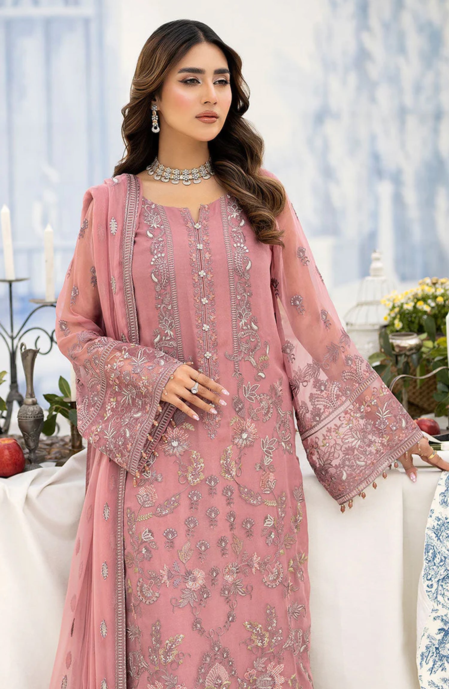 Front, back, and sleeves made of embroidered chiffon for a delicate and intricate design. Complete the look with an embroidered chiffon dupatta and organza borders for the front, back, and sleeves. Dyed Raw Silk trousers complete the ensemble.