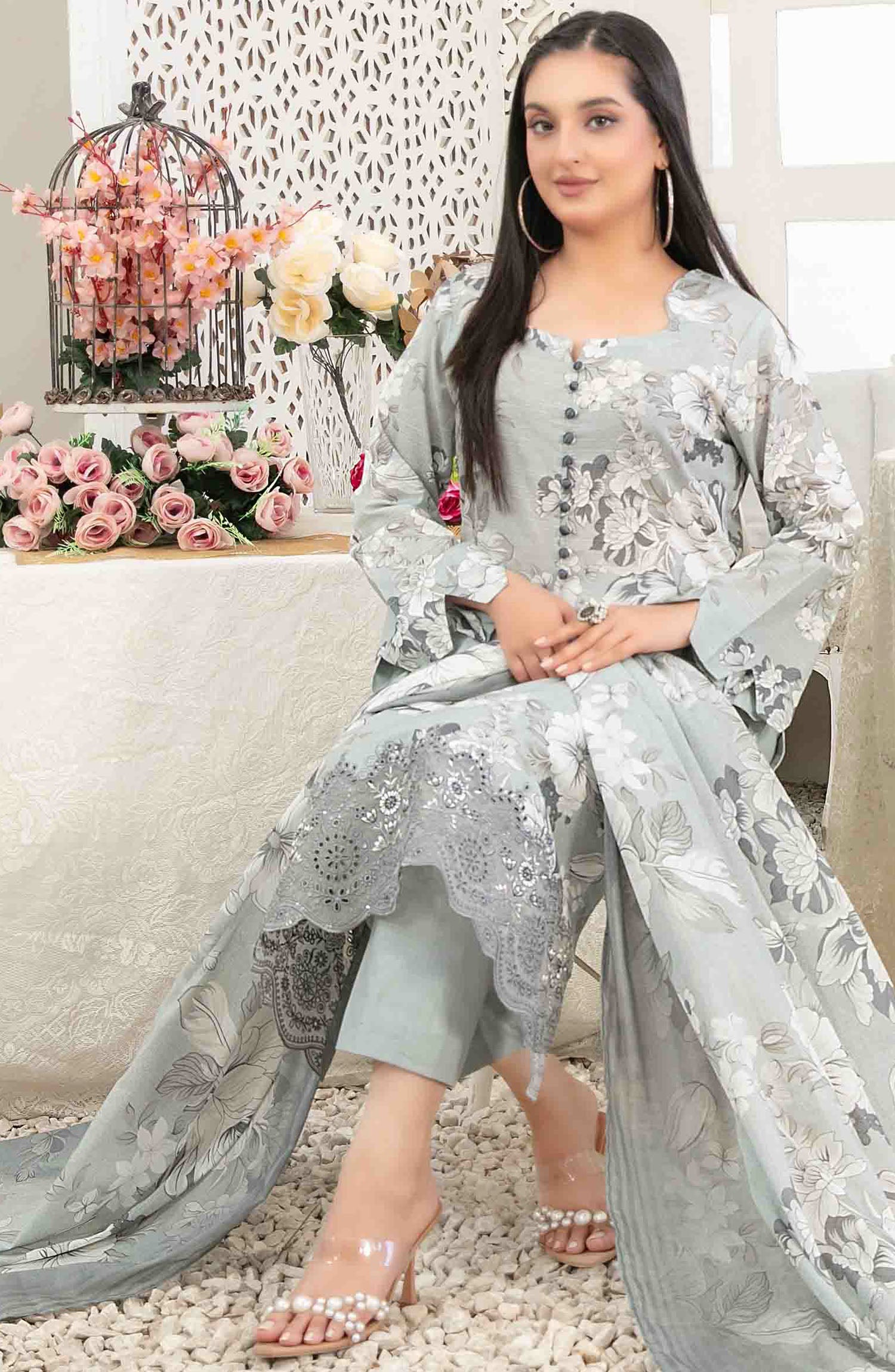 Home Areeba by Tawakkal Fabric Embroidered Lawn Unstitched 3 Piece Suit - D-1688 - TF25AEL - Grey - Summer Collection