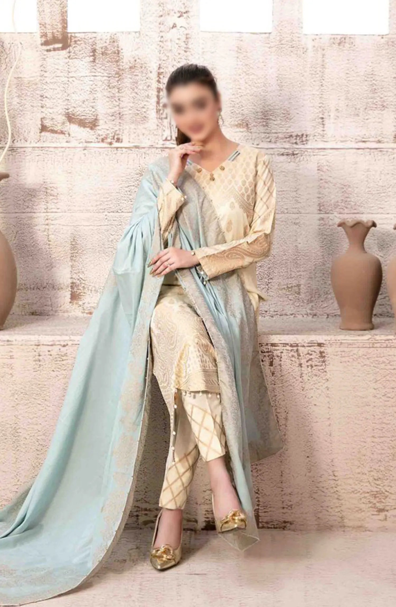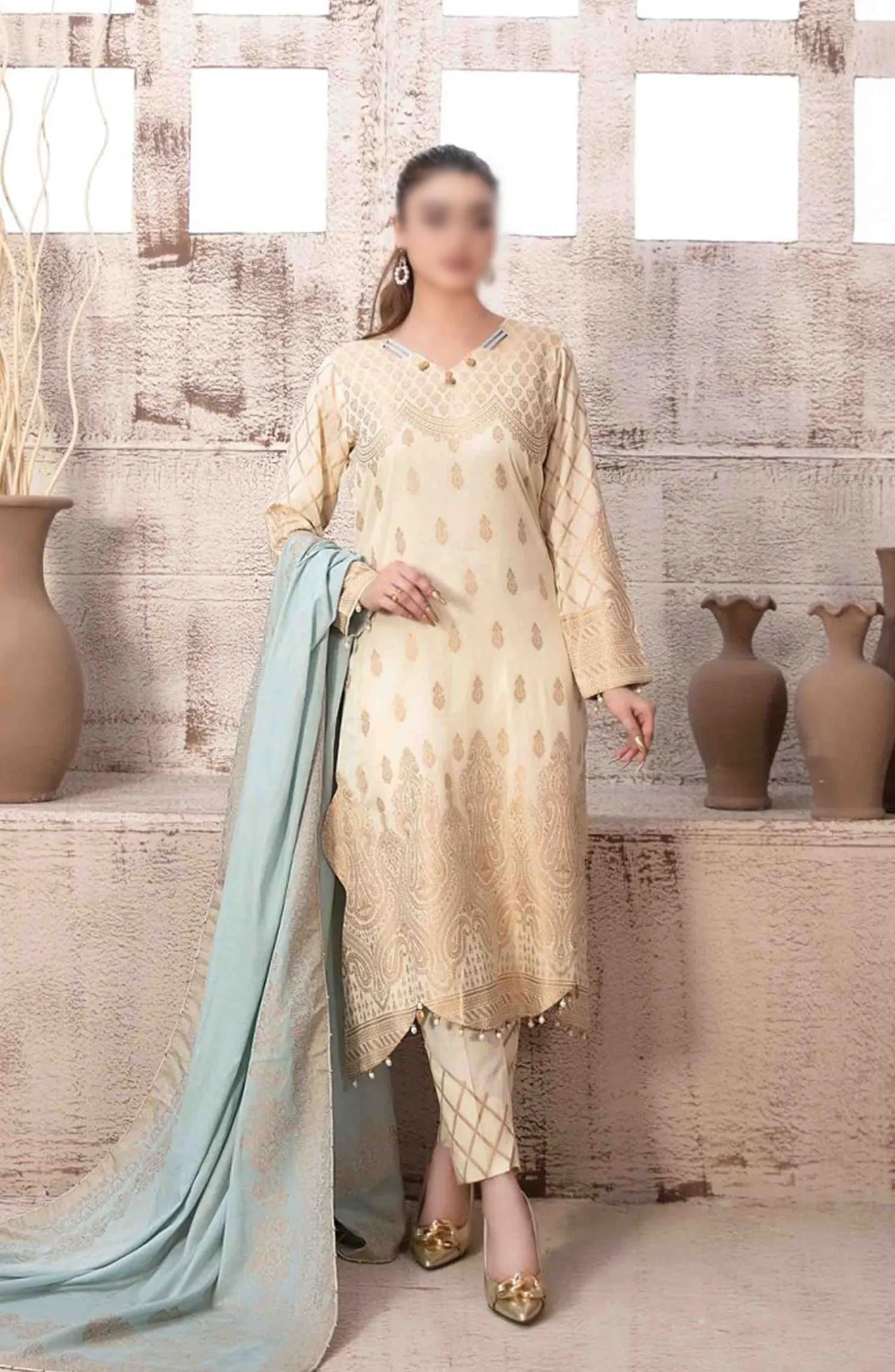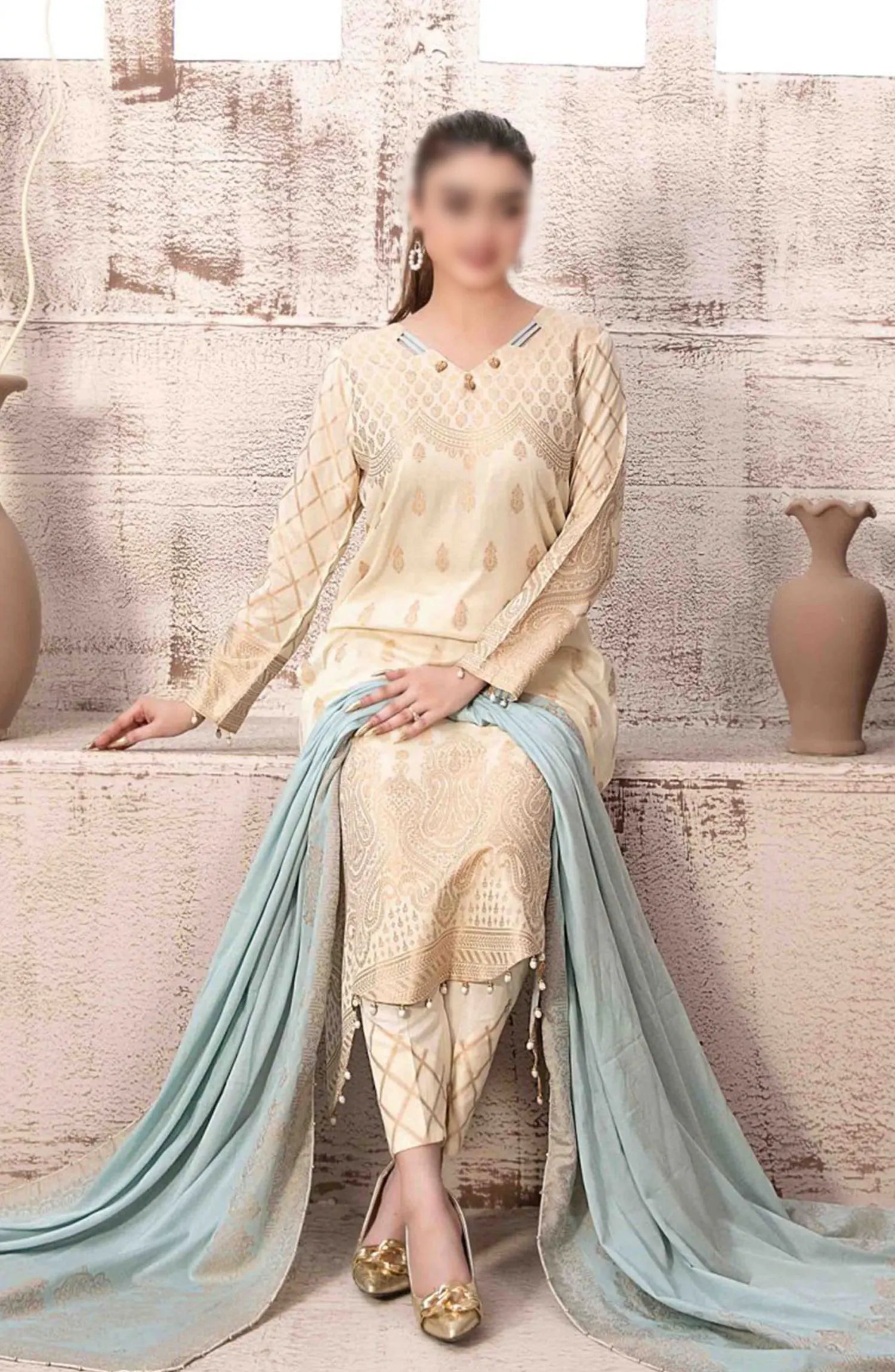 The standard style comes as a long-sleeved kameez with dupatta and trouser/shalwar.