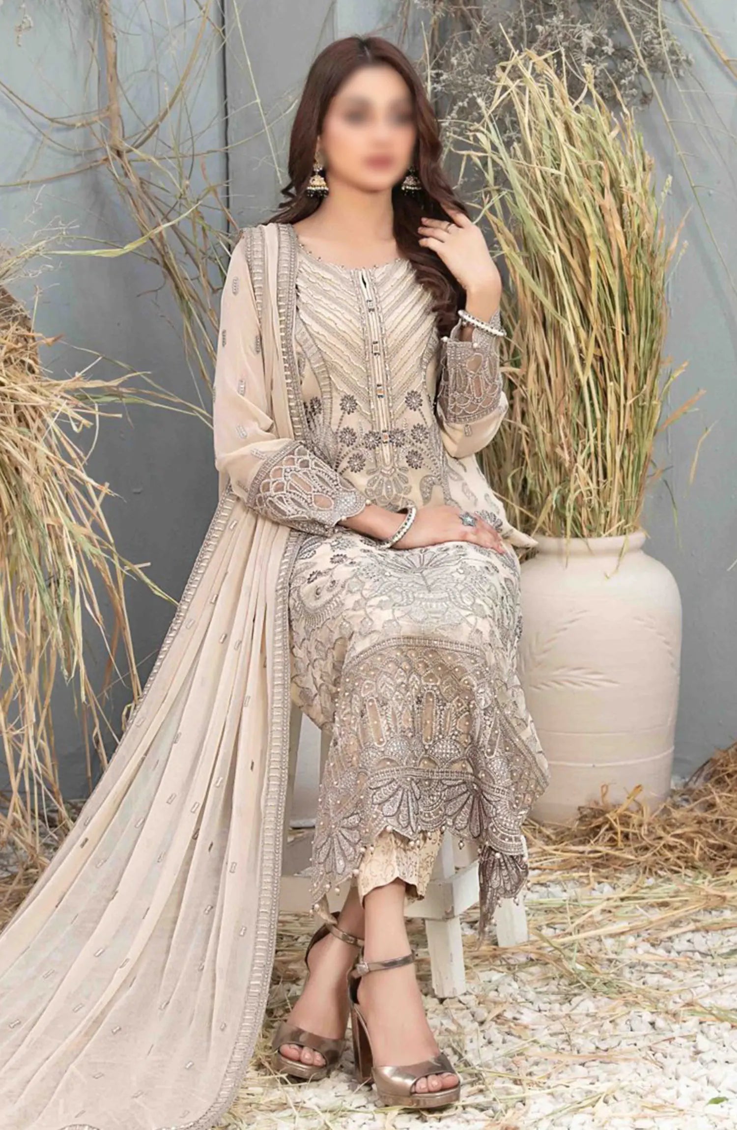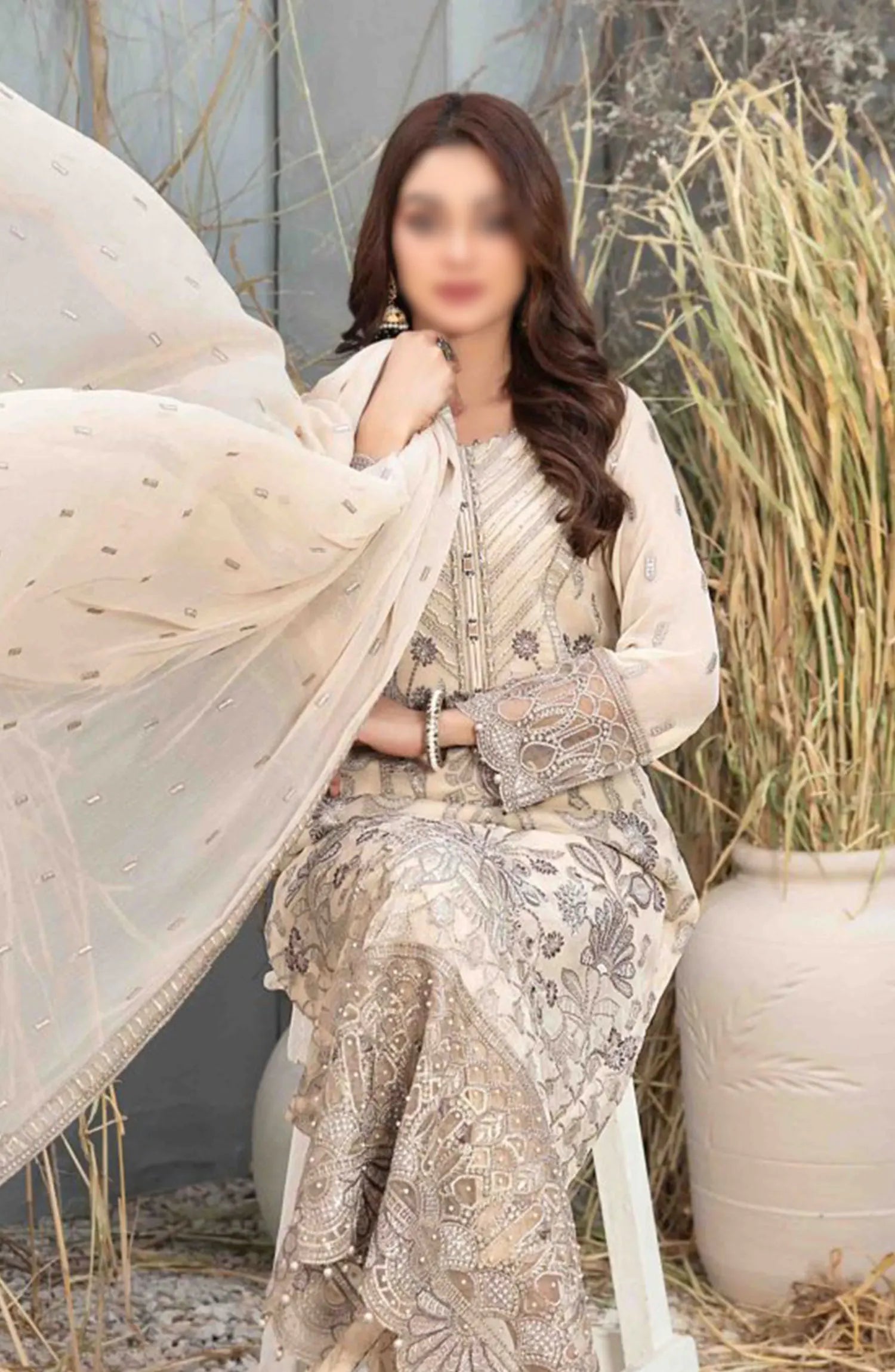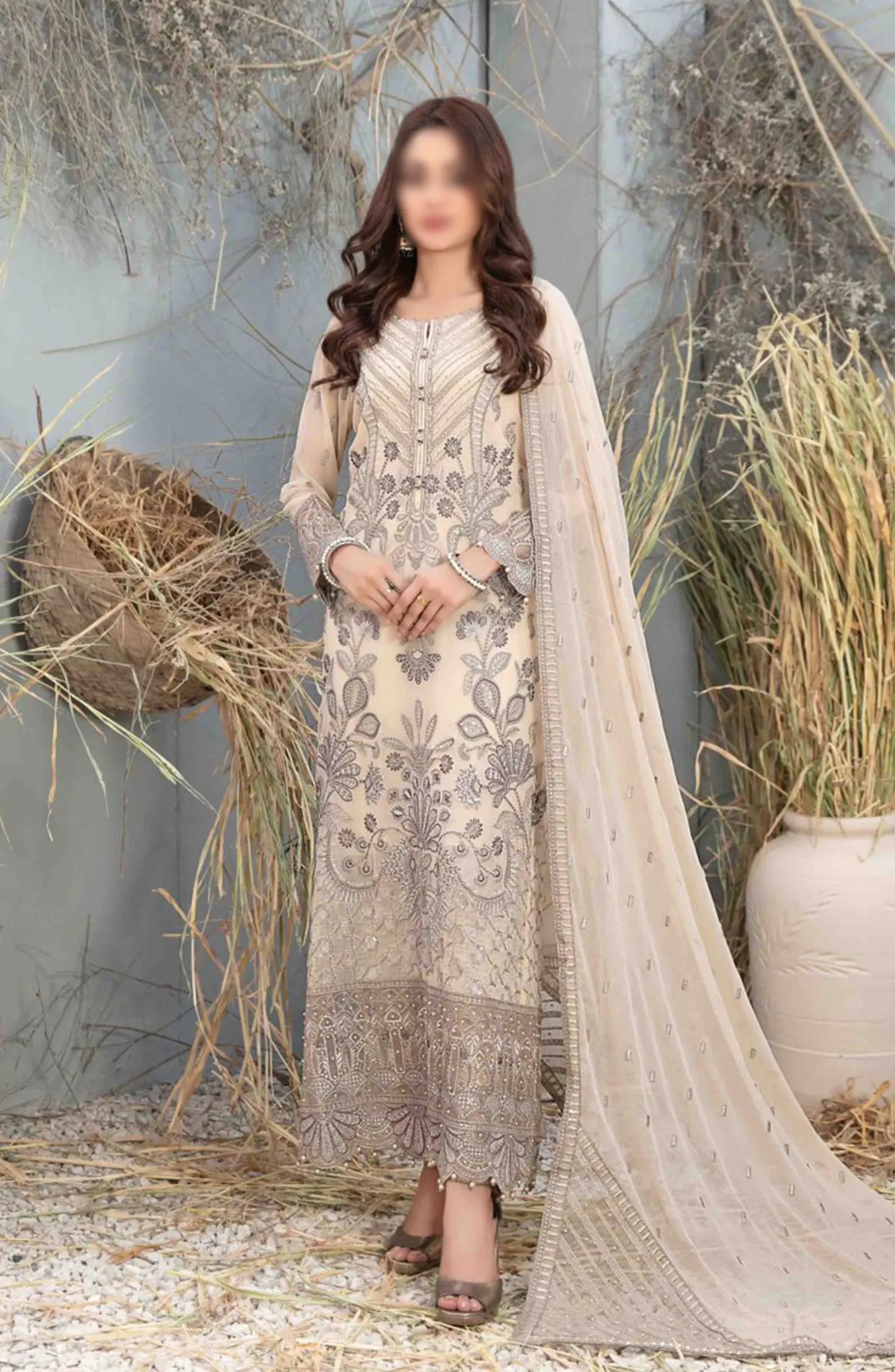 Arushi Fancy Heavy Embroidered Chiffon Collection 2024 has been styled in the image for photography and illustrative purposes.