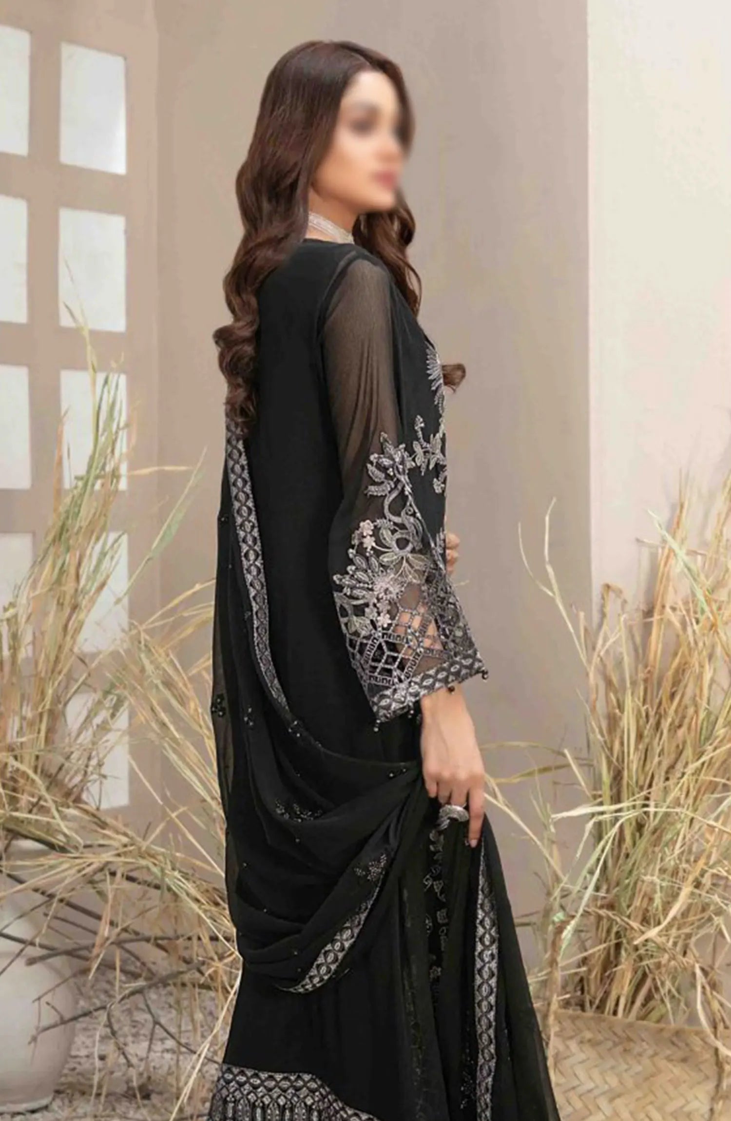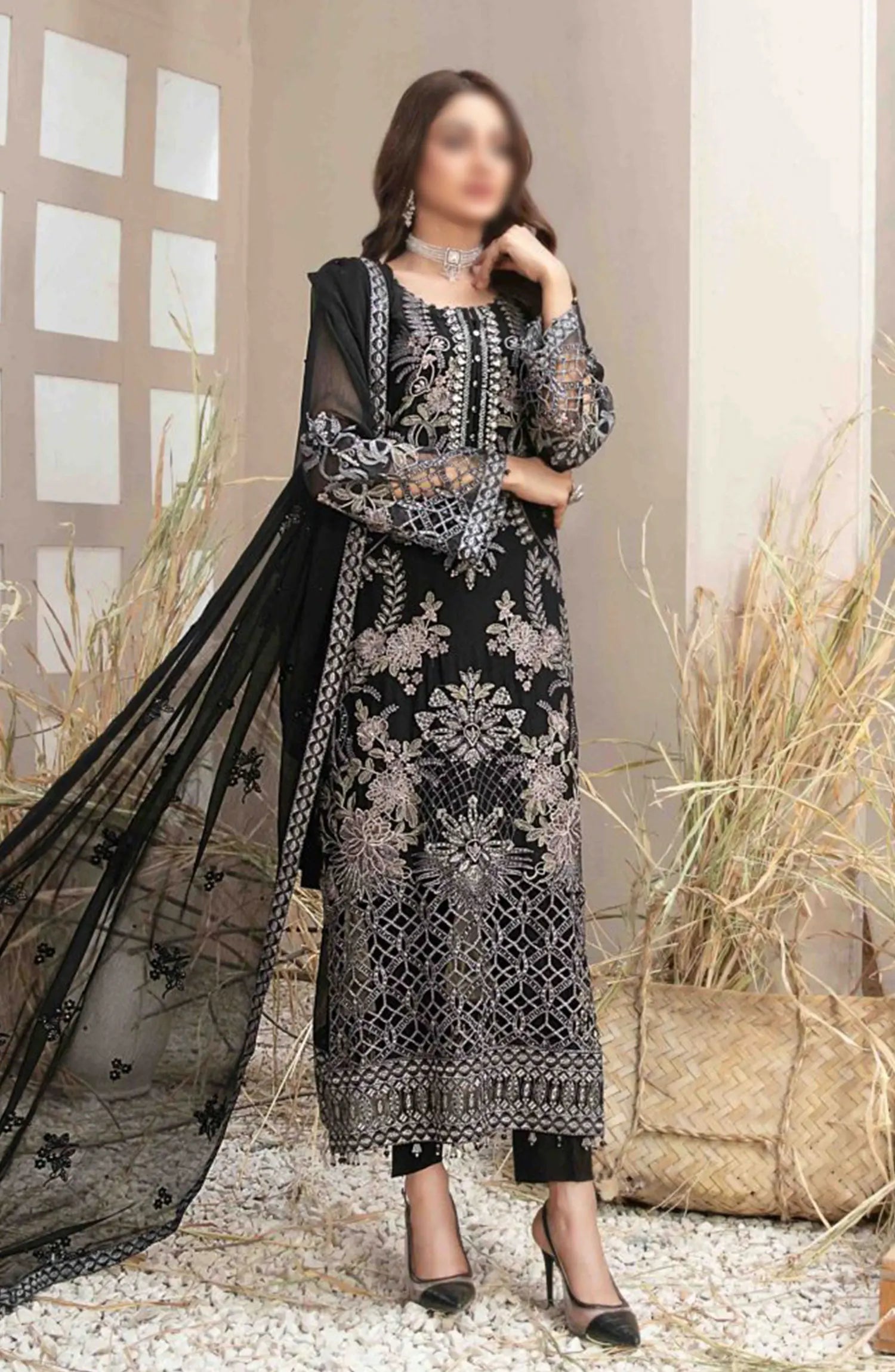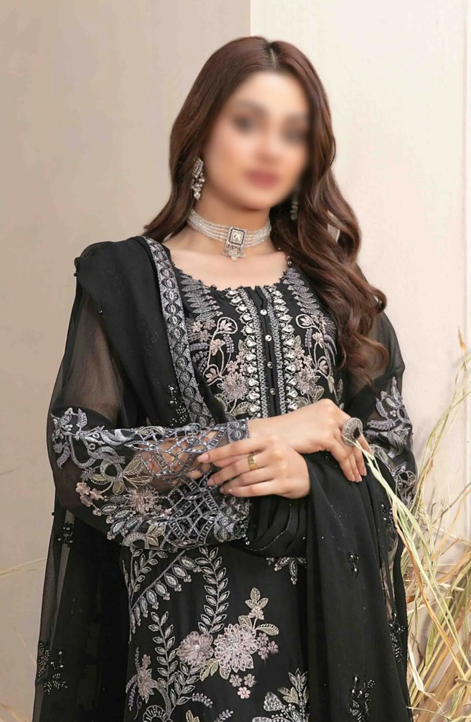 Arushi Fancy Heavy Embroidered Chiffon Collection 2024 has been styled in the image for photography and illustrative purposes.